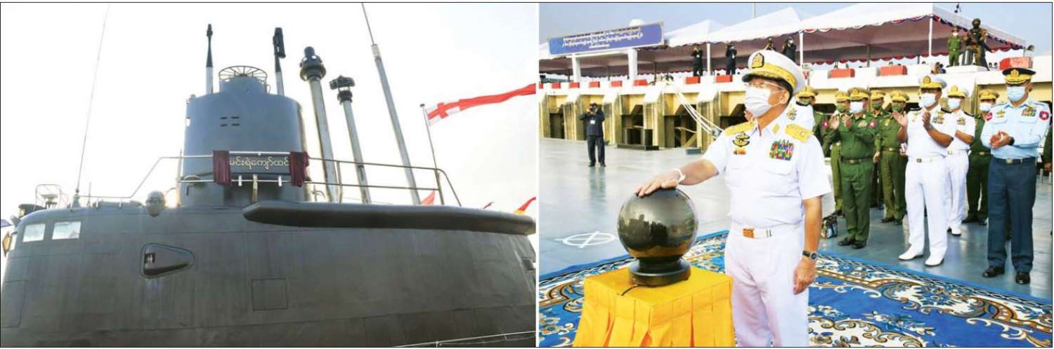 (၇၄)နှစ်မြောက် တပ်မတော်(ရေ)နေ့ အထိမ်းအမှတ် ရေငုပ်သင်္ဘောစစ်ရေယာဉ် (မင်းရဲကျော်ထင်) အပါအဝင် စစ်ရေယာဉ်များ တပ်တော်ဝင်ခြင်း အခမ်းအနားသို့ နိုင်ငံတော်စီမံအုပ်ချုပ်ရေး ကောင်စီဥက္ကဋ္ဌ တပ်မတော်ကာကွယ်ရေးဦးစီးချုပ် ဗိုလ်ချုပ်မှူးကြီး မင်းအောင်လှိုင် တက်ရောက်ချီးမြှင့်