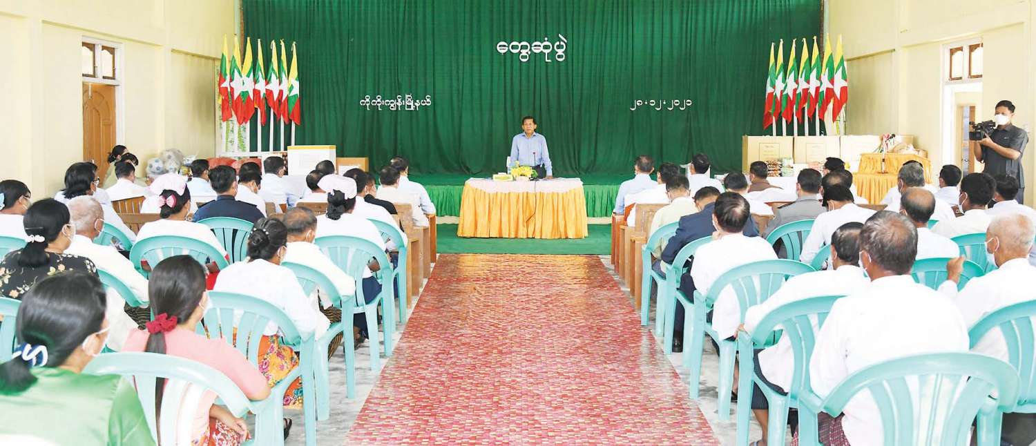 ရေ၊ မီး ရရှိမှုနှင့် ပတ်သက်၍ စနစ်ကျနစွာ သုံးစွဲရေး၊ အသုံးမှ အဖြုန်းသို့ မဖြစ်စေ ရေး၊ လမ်းများကောင်းမွန် စေရေး၊ ပတ်ဝန်းကျင် သန့်ရှင်းသာယာရေးနှင့် ပတ်သက်၍ တစ်ဦးချင်းအသိစိတ်ဖြင့် လုပ်ဆောင်ကြစေလိုကြောင်း၊ နိုင်ငံတော်အဆင့် လုပ်ဆောင် နေသည့် ပန်းခင်းစီမံချက် နှင့် ပတ်သက်၍ ရာနှုန်းပြည့်ပြီးစီးပြီ ဖြစ်သော်လည်း အချက် အလက်များမှန်ကန်မှု ရှိရန် အရေးကြီးမည်ဖြစ်ကြောင်း၊ လူဦးရေနည်းပါးသည့် မြို့နယ် ဖြစ်သဖြင့် စနစ်ကျန သည့် အုပ်ချုပ်မှုပုံစံဖြင့် ရှိရမည်ဖြစ်ပြီး အုပ်ချုပ်ရေးဆိုင်ရာ တာဝန် ရှိသူများအနေဖြင့် စိတ်ပါဝင်စားစွာဖြင့် လုပ်ဆောင်ကြစေလိုကြောင်း၊ ကိန်းဂဏန်း အချက်အလက် မှားယွင်းမှု များမဖြစ်စေရေး၊ မြို့နှင့်ပတ်သက်သည့် မှတ်တမ်းများ၊ သမိုင်းမှတ်တမ်း များကို စနစ်တကျပြုစုဆောင်ရွက်ခြင်းဖြင့် ခေတ်မီပြီးစည်းစနစ်ကျနသည့် မြို့တစ်ခု အဖြစ်ပုံဖော်တည်ဆောက်ကြရန်လိုကြောင်း၊ အချုပ် အားဖြင့် ပြောရ မည်ဆိုပါက ဒေသ၏ ဖွံ့ဖြိုးတိုးတက်ရေးအတွက် တိုက်ရိုက် ဖြေရှင်းဖြည့် ဆည်းပေး နိုင်ရေးဝန်ကြီးများကို တစ်ပါတည်းခေါ်ဆောင်လာခဲ့ခြင်း ဖြစ်ကြောင်း၊ မိမိဒေသ၏ ဖွံ့ဖြိုးတိုးတက်ရေး အတွက် ဒေသတွင် တာဝန်ကျသူများနှင့် နေထိုင်သူများဖြစ်သည့် တပ်မတော်၊ ဌာနဆိုင်ရာအဖွဲ့အစည်းများနှင့် ပြည်သူလူထုတို့ ပူးပေါင်းပြီး ဒေသတိုး တက်ရေးကို ဝိုင်းဝန်းပူးပေါင်းဆောင်ရွက်ကြရမည်ဖြစ်ကြောင်းနှင့် နိုင်ငံတော်အစိုးရနှင့် တပ်မတော် မှလည်း လိုအပ်သည်များကို ဖြည့်ဆည်းဆောင်ရွက်ပေးသွားမည်ဖြစ် ကြောင်း ပြောကြားသည်။