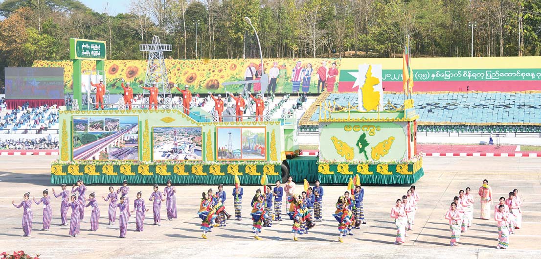 ထို့နောက် မြန်မာနိုင်ငံအတွင်းရှိ တိုင်းရင်းသားများ၏ အထိမ်းအမှတ်များ၊ လူနေမှုစရိုက်များ၊ ဓလေ့ထုံးတမ်းအစဉ်အလာများနှင့် ထုတ်ကုန်များ ကို သရုပ်ဖော်ပြသထားသည့် နေပြည်တော် ကောင်စီနယ်မြေကိုယ်စားပြု ဂုဏ်ပြုယာဉ်များနှင့်အတူ ဂုဏ်ပြုအကအဖွဲ့က “ပြည်ထောင်စုသွေး” သီချင်းဖြင့်လည်းကောင်း၊ ကချင်ပြည်နယ် ကိုယ်စားပြု ဂုဏ်ပြု ယာဉ်များနှင့်အတူ ဂုဏ်ပြုအကအဖွဲ့က “မမေ့နိုင်တဲ့မြေ” သီချင်းဖြင့်လည်းကောင်း၊ ကယားပြည်နယ် ကိုယ်စားပြု ဂုဏ်ပြုယာဉ်များနှင့်အတူ ဂုဏ်ပြုအကအဖွဲ့က “ဖားစည်သံ” သီချင်းဖြင့်လည်းကောင်း၊ ကရင်ပြည်နယ်ကိုယ်စားပြု ဂုဏ်ပြုယာဉ်များနှင့်အတူ ဂုဏ်ပြုအက အဖွဲ့က “အောဟု - အောဟောင်” သီချင်းဖြင့် လည်းကောင်း၊ ချင်းပြည်နယ်ကိုယ်စားပြု ဂုဏ်ပြုယာဉ်များနှင့်အတူ ဂုဏ်ပြုအကအဖွဲ့က “ပျော်ရွှင်ဖွယ်နေ့ရက်များဆီသို့” သီချင်းဖြင့် လည်းကောင်း၊ စစ်ကိုင်းတိုင်းဒေသကြီး ကိုယ်စားပြုဂုဏ်ပြုယာဉ်များနှင့်အတူ ဂုဏ်ပြုအက အဖွဲ့က “အောင်လံ တဝေဝေ ရွှေစစ်ကိုင်းဌာနေ” သီချင်းဖြင့်လည်းကောင်း၊ တနင်္သာရီ တိုင်းဒေသကြီး ကိုယ်စားပြု ဂုဏ်ပြုယာဉ်များနှင့်အတူ ဂုဏ်ပြုအကအဖွဲ့က “တိုးတက်ဝေစည် တနင်္သာရီ” သီချင်းဖြင့်လည်းကောင်း၊ ပဲခူးတိုင်းဒေသကြီးကိုယ်စားပြု ဂုဏ်ပြုယာဉ်များနှင့်အတူ ဂုဏ်ပြုအကအဖွဲ့က “ပဲခူးဟုခေါ်သည်” သီချင်းဖြင့်လည်းကောင်း၊ မကွေးတိုင်း ဒေသကြီး ကိုယ်စားပြုဂုဏ်ပြုယာဉ်များနှင့်အတူ ဂုဏ်ပြုအကအဖွဲ့က “လှသော အညာမြေ” သီချင်းဖြင့်လည်းကောင်း၊ မန္တလေးတိုင်းဒေသကြီး ကိုယ်စားပြု ဂုဏ်ပြုယာဉ်များနှင့် အတူဂုဏ်ပြုအကအဖွဲ့က “လှမ်းခဲ့ပေါ့မန္တလာမြေ” သီချင်းဖြင့်လည်းကောင်း၊ မွန်ပြည်နယ် ကိုယ်စားပြု ဂုဏ်ပြုယာဉ်များနှင့်အတူ ဂုဏ်ပြုအကအဖွဲ့က “တွဲလက်ညီညီ ရှေ့သို့ချီ” သီချင်းဖြင့်လည်းကောင်း၊ ရခိုင်ပြည်နယ် ကိုယ်စားပြု ဂုဏ်ပြုယာဉ်များနှင့်အတူ ဂုဏ်ပြုအက အဖွဲ့က “နာဝရူပဗျာလ”သီချင်းဖြင့် လည်းကောင်း၊ ရန်ကုန်တိုင်းဒေသကြီး ကိုယ်စားပြု ဂုဏ်ပြုယာဉ်များနှင့်အတူ ဂုဏ်ပြုအကအဖွဲ့က “ပြည်ထောင်စုသွေးသား ဗမာဟေ့ဗမာ”သီချင်းဖြင့်လည်းကောင်း၊ ရှမ်းပြည်နယ်ကိုယ်စားပြု ဂုဏ်ပြုယာဉ်များနှင့်အတူ ဂုဏ်ပြုအက အဖွဲ့က “နောင်အင်းလေး” သီချင်းဖြင့်လည်းကောင်း၊ ဧရာဝတီတိုင်းဒေသကြီး ကိုယ်စားပြု ဂုဏ်ပြုယာဉ်များနှင့်အတူ ဂုဏ်ပြုအကအဖွဲ့က “မမပုသိမ်သူ” သီချင်းဖြင့်လည်းကောင်း၊ နေပြည်တော်ကောင်စီ ကိုယ်စားပြု ပြည်ထောင်စုယာဉ်နှင့်အတူ ဂုဏ်ပြုအကအဖွဲ့က “ဦးရွှေရိုးနှင့် ဒေါ်မိုး” အကဖြင့်လည်းကောင်း ဂုဏ်ပြုအလှပြ ကပြဖျော်ဖြေ တင်ဆက်ကြပြီး တပ်မတော်လေမှ ဒုတိယဗိုလ်မှူးကြီး ကျော်အောင် ဦးဆောင်သည့် ရာဇာအုပ်