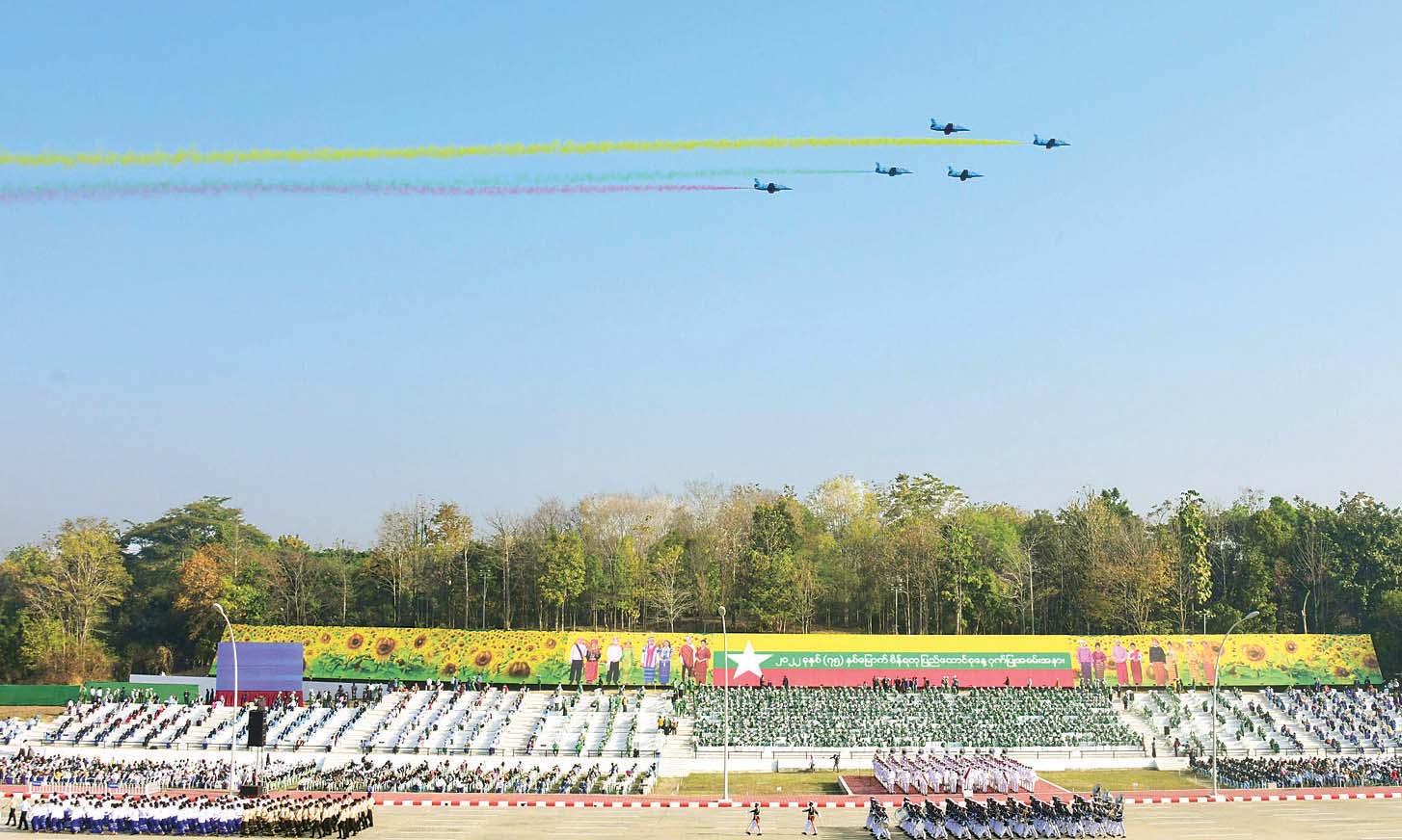 ထိုသို့ ချီတက်အလေးပြုနေစဉ် ဒုတိယဗိုလ်မှူးကြီး အောင်ဖြိုးကျော် ဦးဆောင်သည့် ကြိုးကြာ အုပ်ဖွဲ့ (၁) မှ Mi -17 ရဟတ်ယာဉ် တစ်စင်းသည် နိုင်ငံတော်အလံကို ချိတ်ဆွဲ၍ Eurocopter ရဟတ်ယာဉ် နှစ်စင်းတို့က စောင့်ကြပ်လိုက်ပါပျံသန်းကာ အမျိုးအစားမတူအုပ်ဖွဲ့ပုံသဏ္ဍာန် ပုံစံဖြင့်လည်းကောင်း၊ ဗိုလ်မှုးဇော်ဇော် ဦးဆောင်သည့် ကြိုးကြာအုပ်ဖွဲ့ (၂) သည် Mi-17 ရဟတ်ယာဉ် လေးစင်းနှင့် Mi-35P ရဟတ်ယာဉ် သုံးစင်းတို့က ပြည်နယ်နှင့်တိုင်းဒေသကြီး အလံများကို ချိတ်ဆွဲ၍လည်းကောင်း၊ ဗိုလ်မှူး ထင်အောင်လင်း ဦးဆောင်သည့် H-120 ရဟတ်ယာဉ် သုံးစင်း၊ H-125 ရဟတ်ယာဉ် နှစ်စင်းတို့ကလည်းကောင်း၊ အာကာအုပ်ဖွဲ့မှ ဗိုလ်မှူးနိုင်လင်း ဦးဆောင်သည့် Y-12 လေယာဉ် သုံးစင်းက မြားဦးသဏ္ဍာန်အုပ်ဖွဲ့ပုံစံဖြင့် လည်းကောင်း၊ ရန်အောင်အုပ်ဖွဲ့မှ ဗိုလ်မှူးထက်အောင်စံ ဦးဆောင်သည့် ATR-42 သယ်ယူ ပို့ဆောင်ရေး လေယာဉ် တစ်စင်း၊ Beech -1900 D သယ်ယူပို့ဆောင်ရေး လေယာဉ် နှစ်စင်းတို့သည် အမျိုးအစားမတူ အုပ်ဖွဲ့ပုံသဏ္ဍာန်ဖြင့် လည်းကောင်း၊ ရဲမာန်အုပ်ဖွဲ့မှ ဗိုလ်မှူးဝင်းမင်းထွန်း ဦးဆောင်သည့် K-8 W ဂျက်တိုက်လေယာဉ် ငါးစင်းတို့သည် မြားဦးပုံသဏ္ဍာန် အုပ်ဖွဲ့ပုံစံပျံသန်းပြီး နိုင်ငံတော်အလံကို ကိုယ်စားပြုသည့် အဝါရောင်၊ အစိမ်းရောင်၊ အနီရောင်မီးခိုးတန်း Smoke Trail များကို ထုတ်လွှတ်၍လည်းကောင်း၊ ယက္ခအုပ်ဖွဲ့မှ ဒုတိယဗိုလ်မှူးကြီး ဇော်မြင့်ထွန်း ဦးဆောင်သည့် Yak-130 တိုက်လေယာဉ် လေးစင်းတို့ကလည်းကောင်း၊ သူရိန်အုပ်ဖွဲ့မှ ဒုတိယဗိုလ်မှူးကြီး ထက်အောင်ခိုင် ဦးဆောင်သည့် F-7 ဂျက်တိုက်လေယာဉ် လေးစင်းတို့ကလည်းကောင်း၊ ရာဇာအုပ်ဖွဲ့မှ ဒုတိယဗိုလ်မှူးကြီး ရန်ကျော် ဦးဆောင်သည့် Mig -29 SE ဘက်စုံသုံး ဂျက်တိုက်လေယာဉ် ငါးစင်းတို့ကလည်းကောင်း၊ ရဲမာန်အုပ်ဖွဲ့မှ K-8 W ဂျက်တိုက်လေယာဉ် ငါးစင်းတို့သည် ဒုတိယအကြိမ်အဖြစ် ပျံသန်းပြီး နိုင်ငံတော်အလံကို ကိုယ်စားပြုသည့် အဝါရောင်၊ အစိမ်းရောင်၊ အနီရောင် မီးခိုးတန်း Smoke Trail များကို ထုတ်လွှတ်၍လည်းကောင်း ဂုဏ်ပြုပျံသန်း အလေးပြုကြသည်။