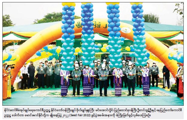 စိုက်ပျိုးရေး၊ မွေးမြူရေးနှင့် ဆည်မြောင်းဝန်ကြီးဌာန၊ စိုက်ပျိုးရေးဦးစီးဌာက ကျင်းပပြုလုပ်သည့် မျိုးစေ့ပြပွဲ ၂၀၂၂ (Seed Fair 2022) ဖွင့်ပွဲအခမ်းအနားကို ယနေ့နံနက်ပိုင်းတွင် နေပြည်တော်ကောင်စီနယ်မြေ ပျဉ်းမနားမြို့ စိုက်ပျိုးရေးသိပ္ပံကျောင်း၌ကျင်းပရာ နိုင်ငံတော်စီမံအုပ်ချုပ်ရေး ကောင်စီဥက္ကဋ္ဌ နိုင်ငံတော်ဝန်ကြီးချူပ် ဗိုလ်ချုပ်မှူးကြီး မင်းအောင်လှိုင် တက်ရောက်ဖွင့်လှစ်ပြီး အမှာစကားပြောကြားသည်။