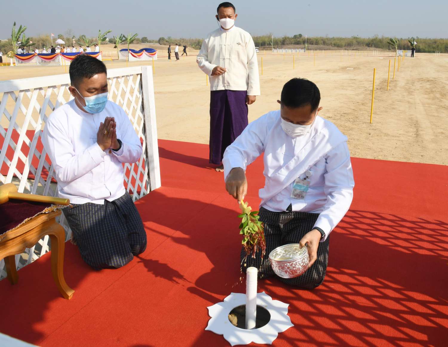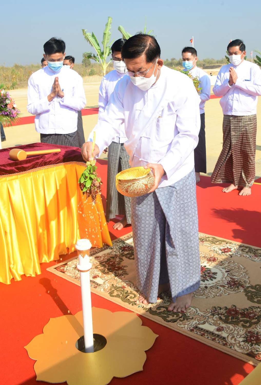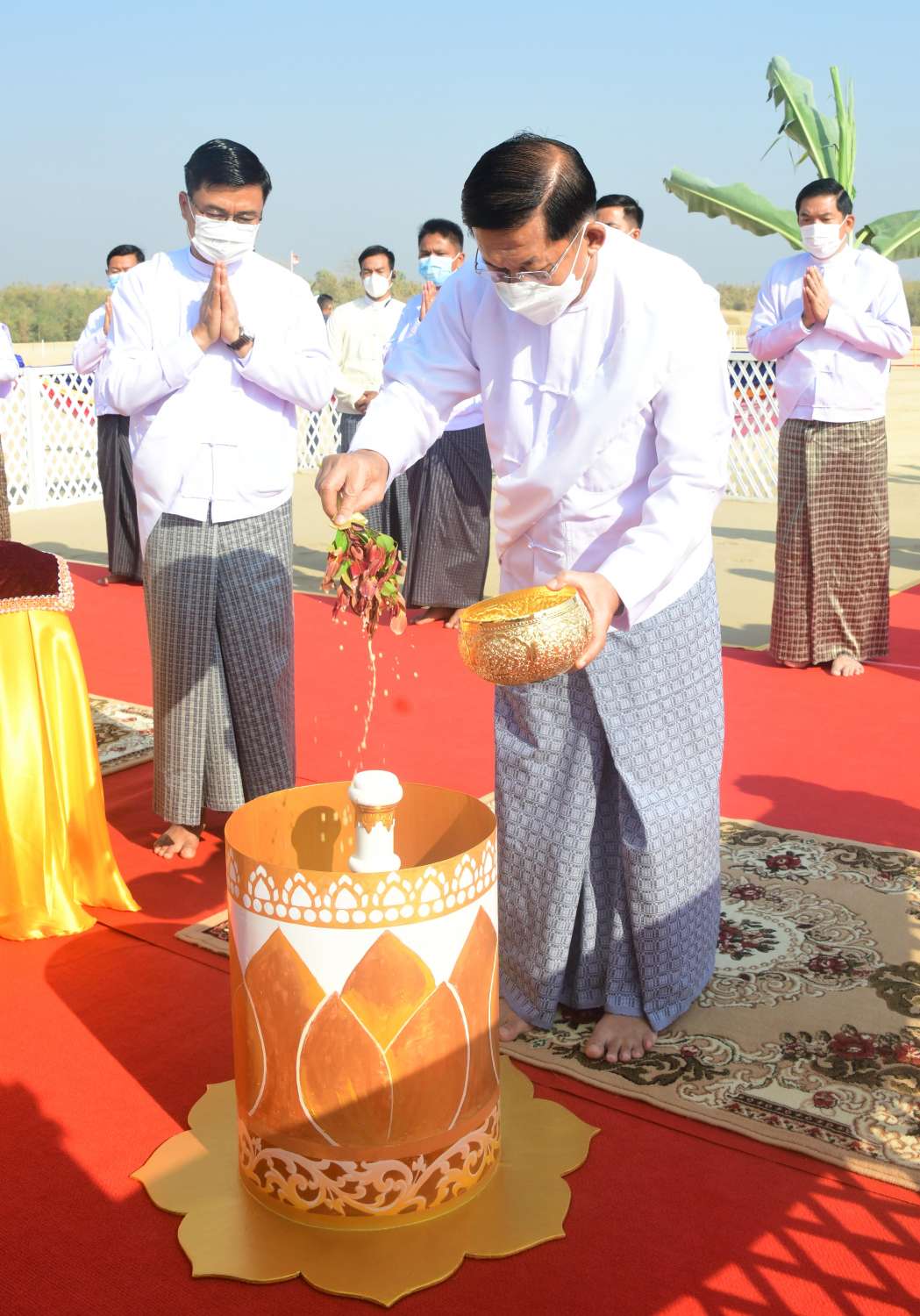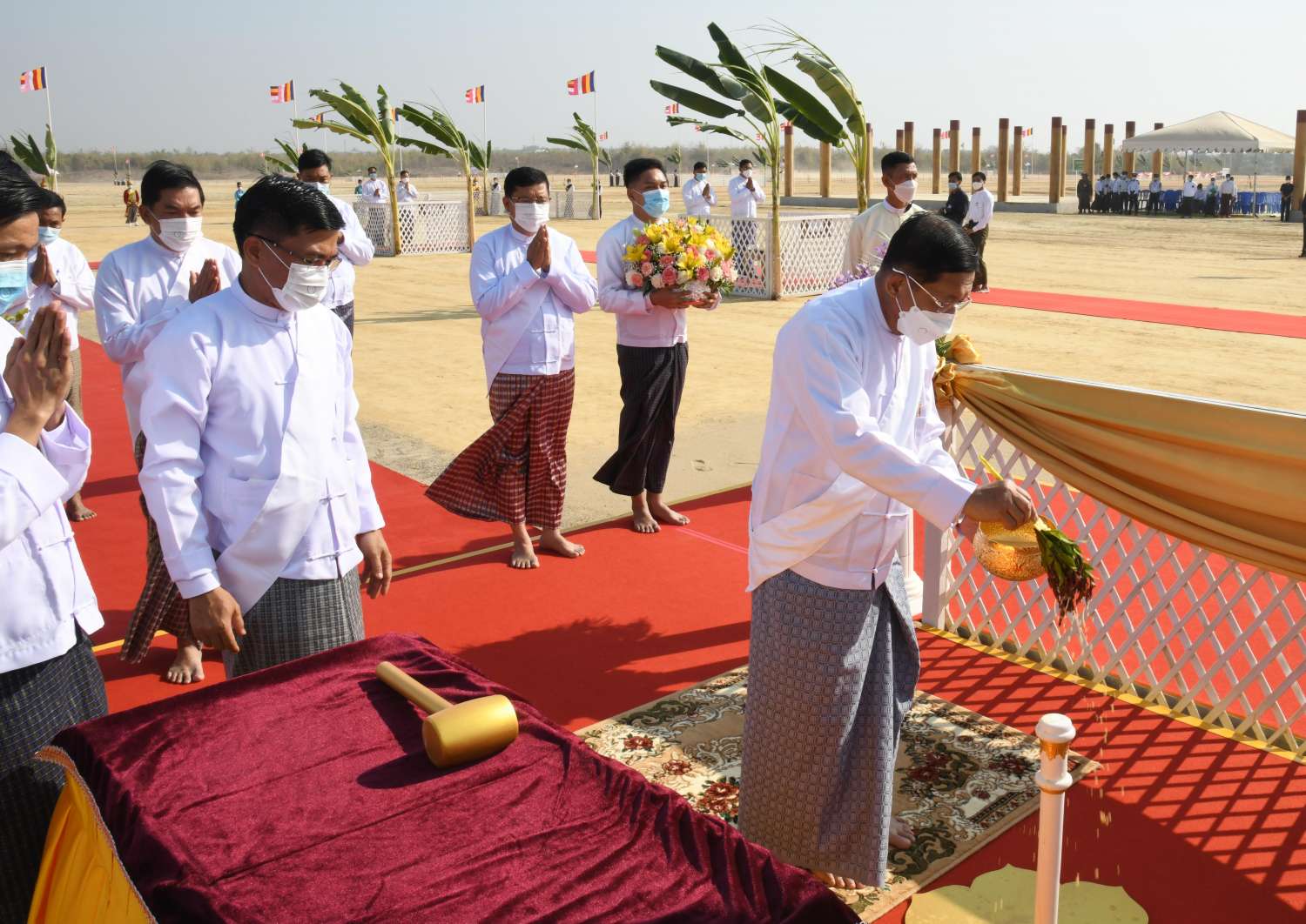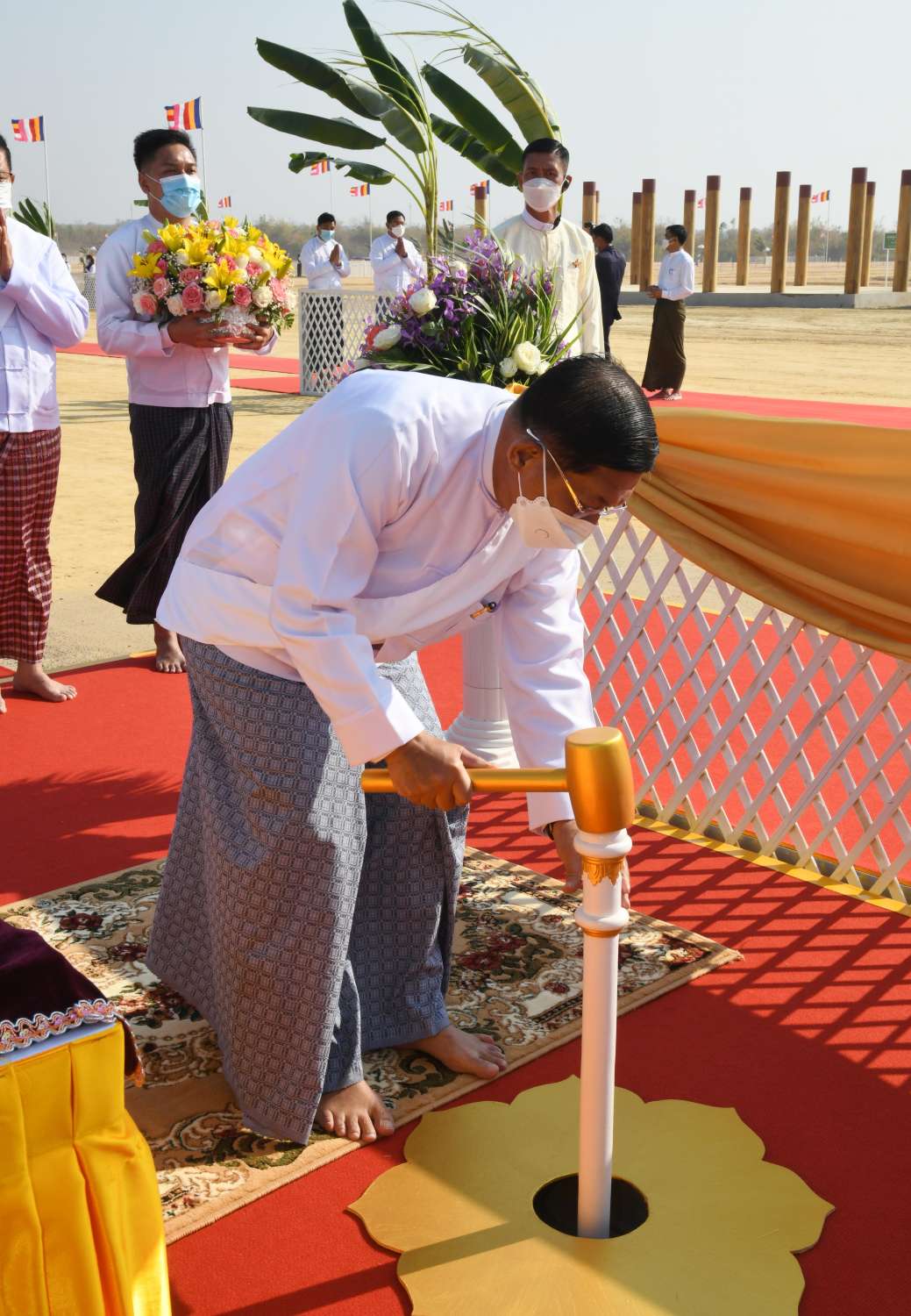 ယင်းနောက် ဦးဆောင်ဘုရားဒါယကာ နိုင်ငံတော်စီမံအုပ်ချုပ်ရေးကောင်စီဥက္ကဋ္ဌ နိုင်ငံတော်ဝန်ကြီးချုပ်နှင့် အဖွဲ့ဝင်များသည် ပန္နက်တော်စိုက်ထူပူဇော်သည့် ရှေးထုံးစဉ်လာ ကျမ်းဂန်တော်လာ အစဉ်အလာမြတ်များနှင့်အညီ ကျောက်စာရုံစေတီ ဗဟိုပန္နက်တော်ဌာနတွင် နေရာယူကြသည်။ ထို့နောက် မင်္ဂလာအချိန်တွင် ဦးဆောင် ဘုရားဒါယကာ နိုင်ငံတော်စီမံအုပ်ချုပ်ရေးကောင်စီဥက္ကဋ္ဌ နိုင်ငံတော်ဝန်ကြီးချုပ်က ကျောက်စာရုံစေတီ ဗဟိုပန္နက်တော်ဋ္ဌာနတွင် ရတနာပန္နက်တော်ကို စိုက်ထူ၍ ပရိတ်နံ့သာရည်များ ပက်ဖျန်းပူဇော်သည်။