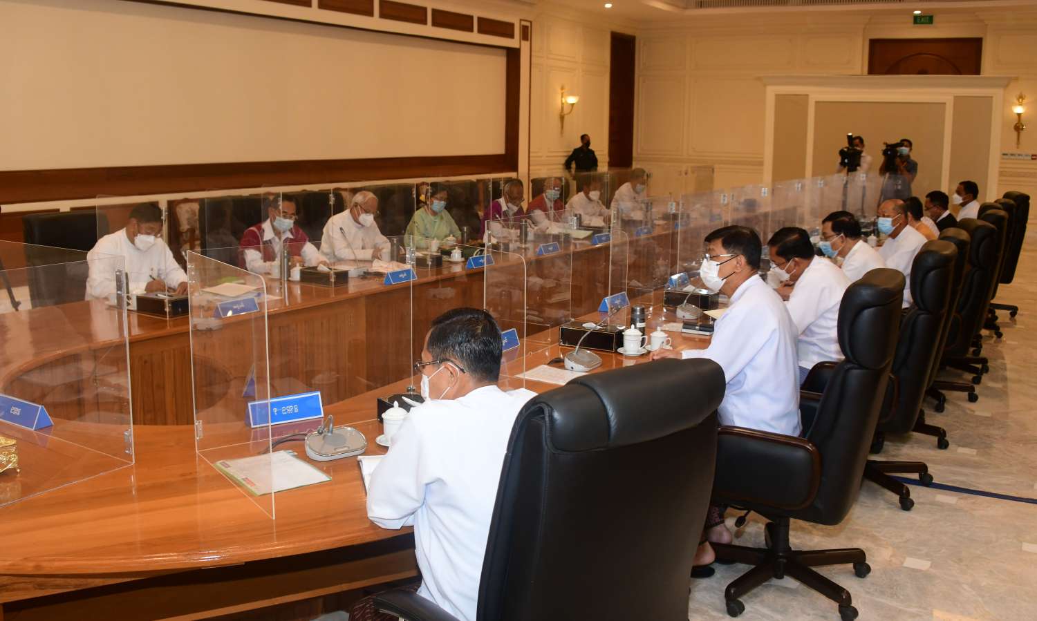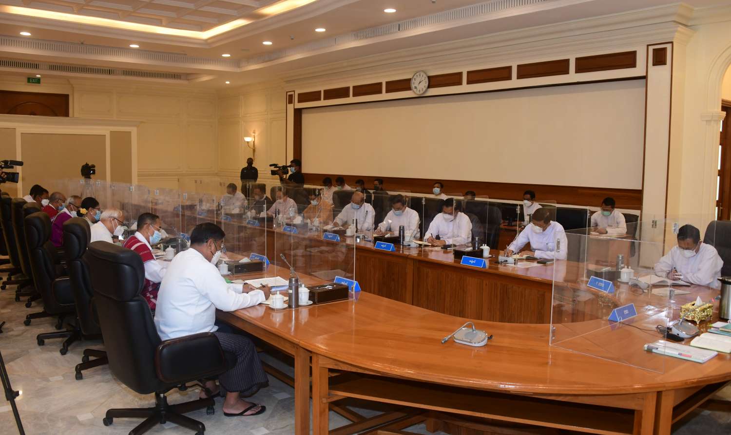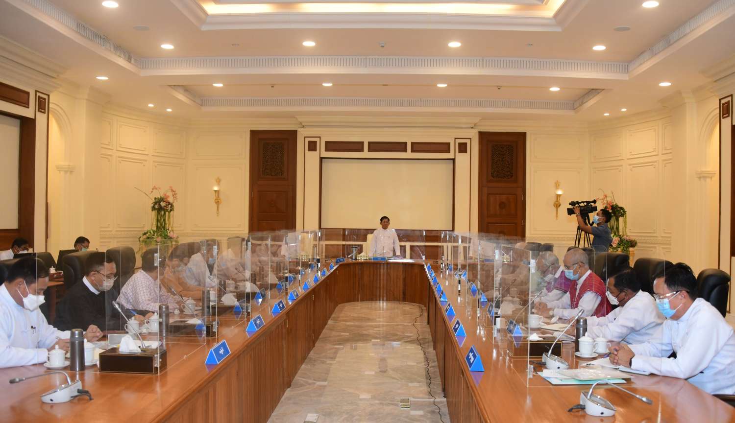 ယင်းနောက် နိုင်ငံတော်စီမံအုပ်ချုပ်ရေးကောင်စီဥက္ကဋ္ဌ၊ နိုင်ငံတာ်ဝန်ကြီးချုပ်က တင်ပြဆွေးနွေးချက်များနှင့် စပ်လျဉ်း၍ တရားဥပဒေစိုးမိုးရေးကို ထိခိုက်အောင် လုပ်ဆောင်မှုများကို ထိထိရောက်ရောက် အရေးယူဆောင်ရွက်လျက်ရှိကြောင်း၊ ငြိမ်းချမ်းရေးနှင့် ပတ်သက်၍ EAO များနှင့် တစ်ဖွဲ့ချင်းစီ တွေ့ဆုံဆွေးနွေးသွားမည် ဖြစ်ကြောင်း၊ အစိုးရနှင့် တပ်မတော်အနေဖြင့် ပါတီစုံဒီမိုကရေစီစနစ်နှင့် ဒီမိုကရေစီနှင့် ဖက်ဒရယ်ကို အခြေခံသော ပြည်ထောင်စုစနစ်ကို အာမခံထားပြီးဖြစ်ကြောင်း၊ မြို့အဝင် စစ်ဆေးရေးဂိတ်များ၌ လုံခြုံရေးဂရုပြု ဆောင်ရွက်သွားမည်ဖြစ်ပြီး Online Banking စနစ် ဆောင်ရွက်နိုင်ရေး စီစဉ်ဆောင်ရွက်လျက်ရှိကာ အခြေခံပြည်သူများ ဝင်ငွေရရှိရေးအတွက် အလုပ်အကိုင်အခွင့်အလမ်းများ ဖန်တီးပေးရန် လိုအပ်ကြောင်း။