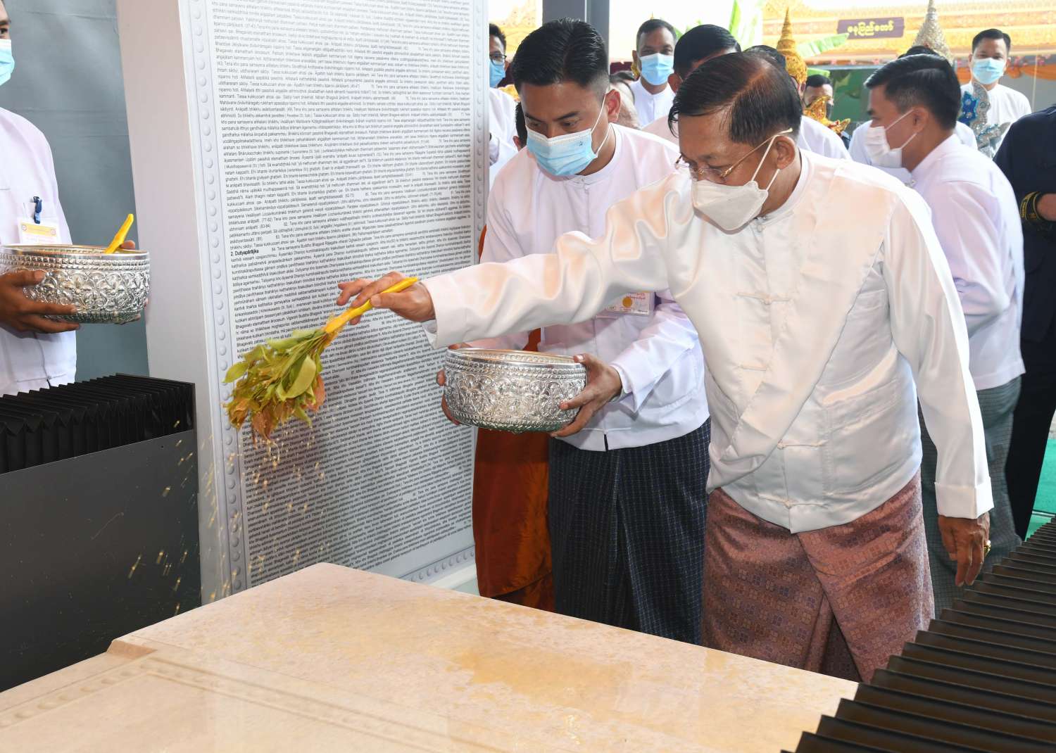 ထို့နောက် နိုင်ငံတော်စီမံအုပ်ချုပ်ရေးကောင်စီဥက္ကဋ္ဌ နိုင်ငံတော်ဝန်ကြီးချုပ် ဗိုလ်ချုပ်မှူးကြီး မင်းအောင်လှိုင်က စက်ယန္တရားများကို မင်္ဂလာစက်ခလုတ်နှိပ်၍ ပိဋကတ်ကျောက်စာတော် စတင်ရေးထိုးပူဇော်ပြီး ပရိတ်နံ့သာရည်များပက်ဖျန်းသည်။