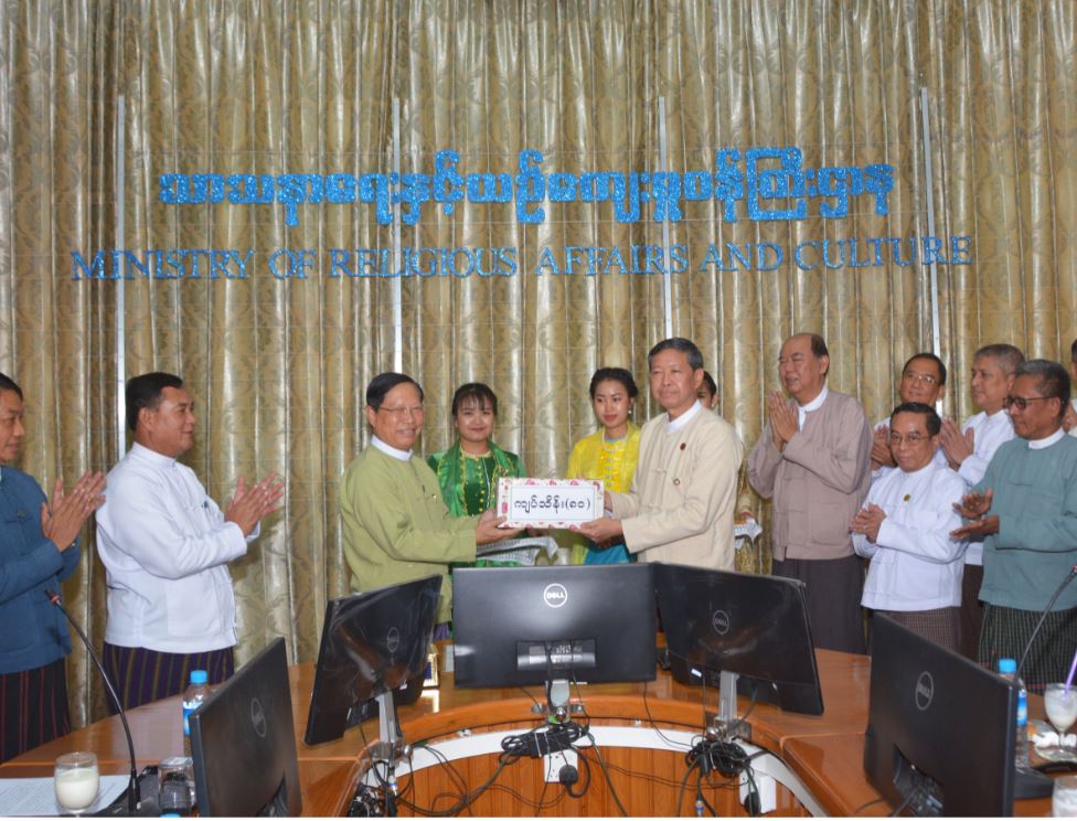 အလှူငွေပေးအပ်ပွဲတွင် စကျင်တာရာဇိုခင်းခြင်းလုပ်ငန်းအတွက် ပညာရေးဝန်ကြီးဌာန ပြည်ထောင်စုဝန်ကြီး ဒေါက်တာမျိုးသိမ်းကြီးနှင့် ဝန်ထမ်းမိသားစုများက အလှူတော်ငွေကျပ် သိန်း ၈၀ ကို ပေးအပ်လှူဒါန်းရာ သာသနာရေးနှင့် ယဉ်ကျေးမှုဝန်ကြီးဌာန ပြည်ထောင်စု ဝန်ကြီး သူရဦးအောင်ကိုက လက်ခံရယူပြီး ဂုဏ်ပြု မှတ်တမ်း လွှာ ပြန်လည်ပေးအပ်သည်။