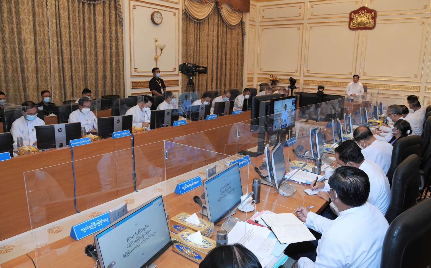 ပြည်ထောင်စုအစိုးရအဖွဲ့ အစည်းအဝေး အမှတ်စဉ်(၄/၂၀၂၂)ကို ယနေ့မွန်းလွဲပိုင်းတွင် နေပြည်တော်ရှိ နိုင်ငံတော်စီမံအုပ်ချုပ်ရေးကောင်စီဥက္ကဋ္ဌရုံး အစည်းအဝေးခန်းမ၌ ကျင်းပရာ နိုင်ငံတော်စီမံအုပ်ချုပ်ရေးကောင်စီဥက္ကဋ္ဌ နိုင်ငံတော်ဝန်ကြီးချုပ် ဗိုလ်ချုပ်မှူးကြီး မင်းအောင်လှိုင် တက်ရောက်အမှာစကား ပြောကြားသည်။