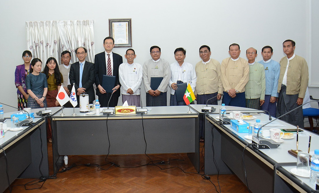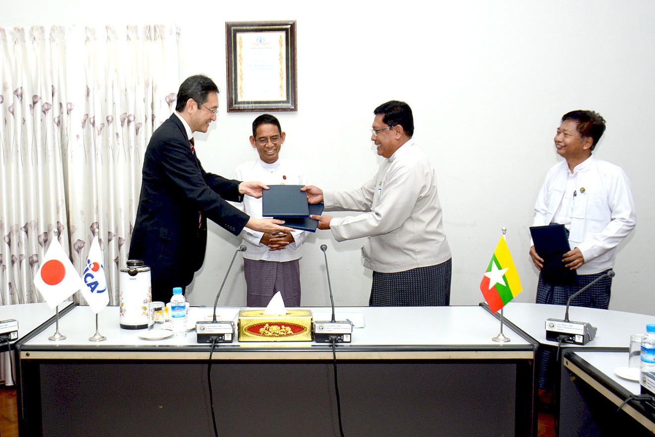ထို့နောက် စီမံကိန်းဦးစီးဌာန ညွှန်ကြားရေးမှူးချုပ် ဦးကျော်ဆွေလင်း၊ စိုက်ပျိုးရေးဦးစီးဌာန ညွှန်ကြားရေးမှူးချုပ် ဒေါက်တာရဲတင့်ထွန်းနှင့် JICA Myanmar ရုံးမှ Chief Representative Mr. Sakakura Noriji တို့က စိုက်ပျိုးရေး၊မွေးမြူရေးနှင့် ဆည်မြောင်းဝန်ကြီးဌာနနှင့် JICA တို့ ပူးပေါင်းဆောင်ရွက်မည့် နည်းပညာအထောက်အပံ့ စီမံကိန်းတစ်ခုဖြစ်သည့် အစားအစာ ဘေးကင်းလုံခြုံမှုမှတဆင့် ဥယျာဉ်ခြံသီးနှံများ၏ တန်ဖိုးကွင်းဆက် မြှင့်တင်ရေးစီမံကိန်း နားလည်မှုစာချွန်လွှာအား လက်မှတ်ရေးထိုး ခဲ့ကြသည်။