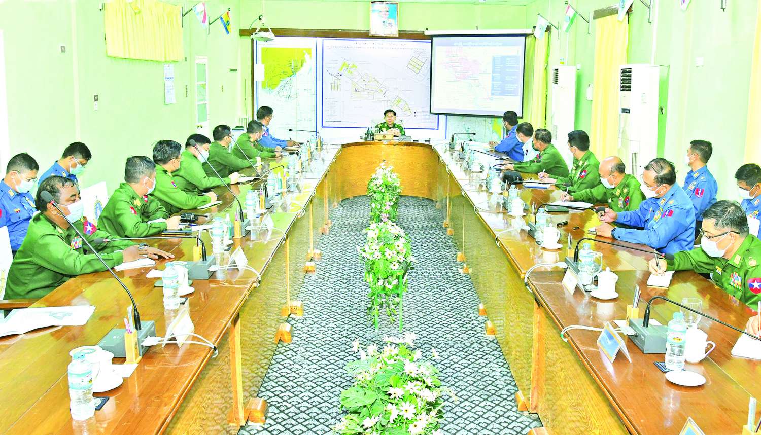 ဦးစွာ တာဝန်ရှိသူတစ်ဦးက တပ်ဌာနချုပ်သမိုင်းအကျဉ်း၊ တပ်တည်ဆောက်ရေးလုပ်ငန်းကြီး ၄ ရပ် အကောင်အထည်ဖော် ဆောင်ရွက်နေမှု၊ ဒေသခံပြည်သူများအား ကျန်းမာရေးအပါအဝင် အခြားလိုအပ်သည့် ကူညီကယ်ဆယ်ရေးလုပ်ငန်းများ ဆောင်ရွက်ပေးနိုင်မှု၊ ရန်ကုန်တိုင်းဒေသကြီးအတွင်း ရေကြောင်းလုံခြုံရေးဆိုင်ရာ ဆောင်ရွက်နေမှုအခြေအနေများနှင့် ပတ်သက်၍ ရှင်းလင်းတင်ပြရာ နိုင်ငံတော်စီမံအုပ်ချုပ်ရေးကောင်စီဥက္ကဋ္ဌ တပ်မတော်ကာကွယ်ရေးဦးစီးချုပ်က လိုအပ်သည်များ ပြန်လည်မှာကြားသည်။