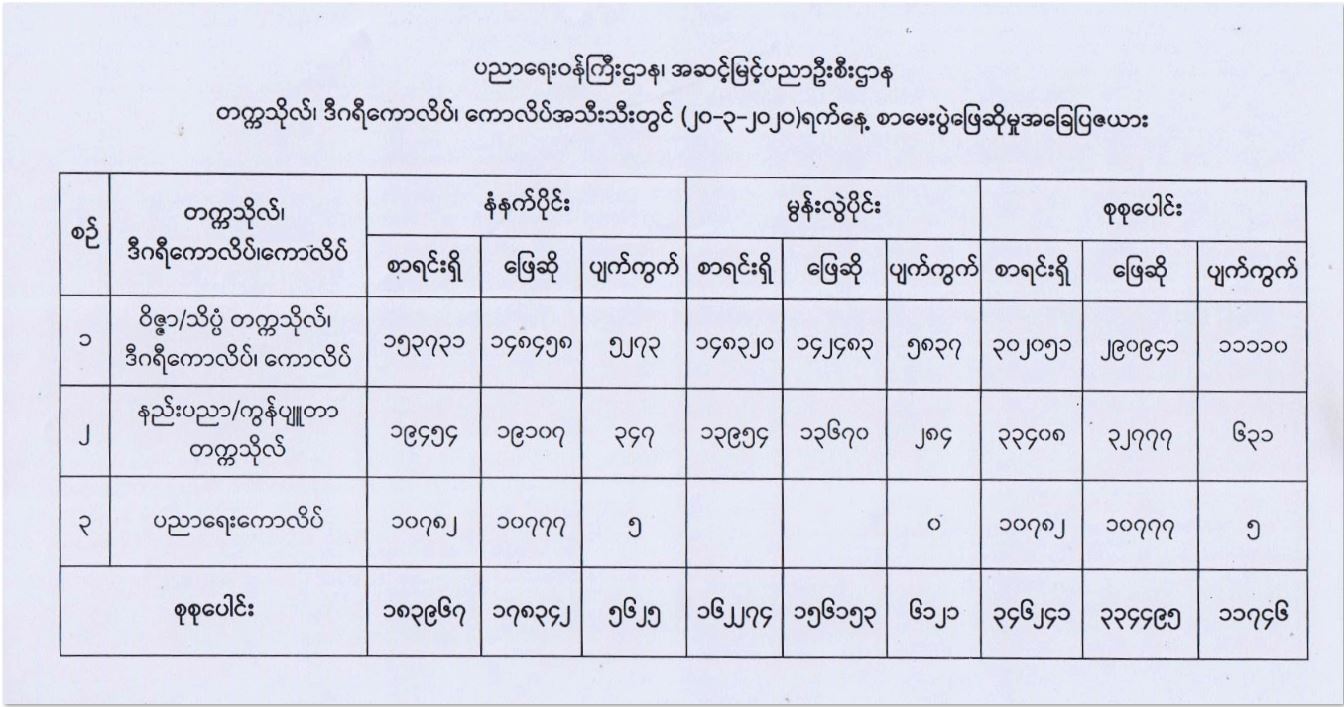 တက္ကသိုလ်၊ ဒီဂရီကောလိပ်နှင့် ကောလိပ်များ၏ ၂၀၁၉ - ၂၀၂၀ ပညာသင်နှစ် ပထမ နှစ်ဝက် စာမေးပွဲများကို ယနေ့တွင် နိုင်ငံ တစ်ဝန်း၌ ဆက်လက်ကျင်းပရာ ဝိဇ္ဇာ/သိပ္ပံ တက္ကသိုလ်၊ ဒီဂရီကောလိပ်နှင့် ကောလိပ်များ၌ ‌စာရင်းရှိ ၃၀၂၀၅၁ ဦးအနက် ၂၉၀၉၄၁ ဦး ဖြေဆိုသဖြင့် ပျက်ကွက် ၁၁၁၁၀ ၊ နည်းပညာတက္ကသိုလ်များနှင့် ကွန်ပျူတာတက္ကသိုလ်များ၌ စာရင်းရှိ ၃၃၄၀၈ အနက် ၃၂၇၇၇ ဦးဖြေဆိုသဖြင့် ပျက်ကွက် ၆၃၁ ဦးနှင့် ပညာရေးကောလိပ် များ၌ စာရင်းရှိ ၁၀၇၈၂ ဦးအနက် ၁၀၇၇၇ ဦးဖြေဆိုသဖြင့် ပျက်ကွက် ၅ ဦးရှိကြောင်း၊ နိုင်ငံ တစ်ဝန်း တက္ကသိုလ်၊ ဒီဂရီကောလိပ်နှင့် ကောလိပ်များ၏ စုစုပေါင်းစာရင်းရှိ ၃၄၆၂၄၁ ဦး အနက် ၃၃၄၄၉၅ ဦးဖြေဆိုကြပြီး ပျက်ကွက် ၁၁၇၄၆ ဦးရှိကြောင်း ပညာရေးဝန်ကြီးဌာနမှ သိရသည်။