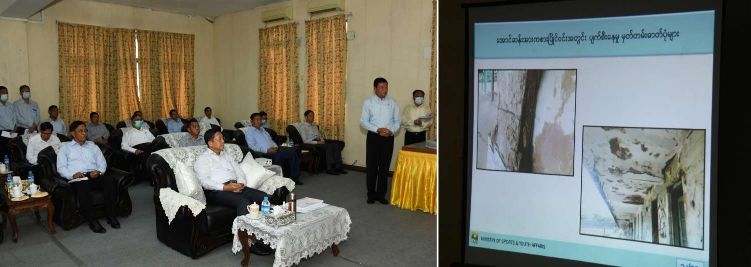 ဦးစွာ အစည်းအဝေးခန်းမတွင် ပြည်ထောင်စုဝန်ကြီးများ၊ ရန်ကုန်တိုင်းဒေသကြီးဝန်ကြီးချုပ်၊ စစ်အင်ဂျင်နီယာညွှန်ကြားရေးမှူးရုံး ညွှန်ကြားရေးမှူး ဗိုလ်ချုပ်မျိုးသန့်နှင့် တာဝန်ရှိသူများက အားကစားဝင်းဆိုင်ရာ အချက်အလက်များနှင့် သမိုင်းအကျဉ်း၊ ၂၀၂၁ ခုနှစ်အတွင်း နိုင်ငံတော်ဝန်ကြီးချုပ် လာရောက်စစ်ဆေးစဉ် လမ်းညွှန်မှာကြားချက်များအပေါ် လိုက်နာဆောင်ရွက်ပြီးစီးမှု၊ အားကစားကွင်း အဆင့်မြှင့်တင်ရေးအတွက် ကော်မတီများ ဖွဲ့စည်းဆောင်ရွက်ထားရှိမှု၊ အားကစားကွင်းအဆင့်မြှင့်တင်ရာတွင် အားကစားပရိတ်သတ်များ အားကစားကွင်းအတွင်း ဝင်၊ ထွက် သွားလာမှု အဆင်ပြေစေရန်အတွက် Under Pass နှင့် Over Pass များ လျာထားဆောင်ရွက်ထားရှိမှု၊ ပရိသတ် ၃၀၀၀ ဆန့် မိုးလုံလေလုံအားကစားရုံ တည်ဆောက်ရန် လျာထားမှုအခြေအနေများ၊ လျာထားအားကစားဝင်းပုံစံများကို power point presentation များ၊ အထူးပြုလုပ်ချက် Video Clip များဖြင့် ရှင်းလင်းတင်ပြကြသည်။