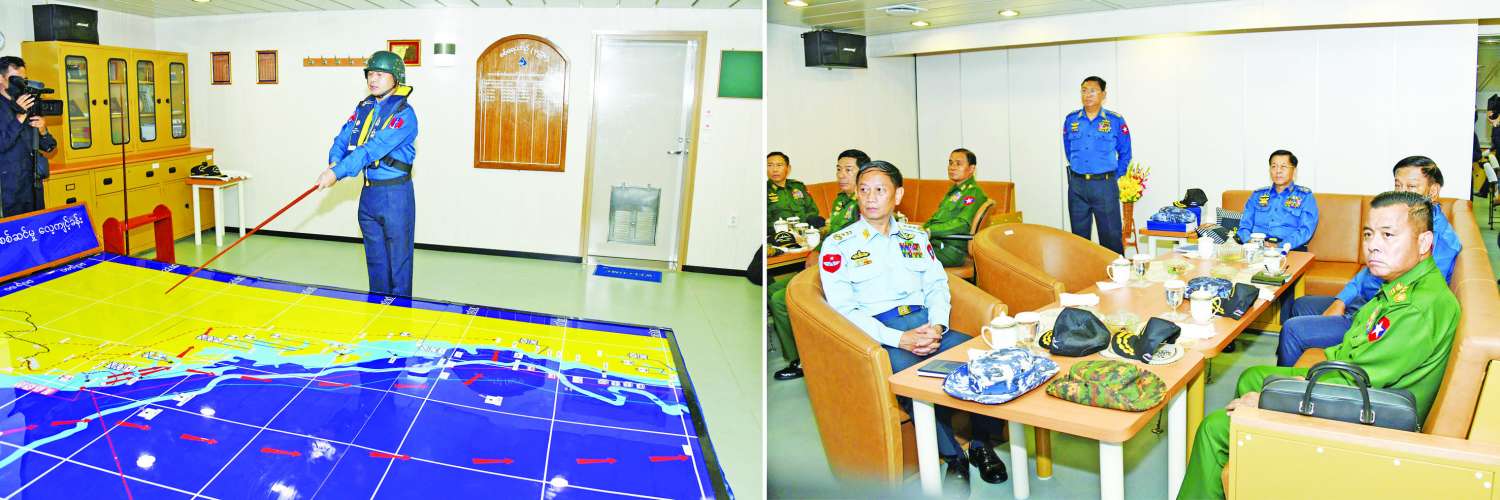 ယင်းနောက် ကာကွယ်ရေးဦးစီးချုပ်(ရေ)က တပ်မတော်ကာကွယ်ရေးဦးစီးချုပ်၏ လမ်းညွှန်မှာကြားချက်နှင့်အညီ စစ်နည်းဗျူဟာအဆင့် ရေပေါ်ရေအောက် ပူးပေါင်းစစ်ဆင်မှုလေ့ကျင့်ခန်း (Sea Shield-2022)ကို လေ့ကျင့်ဆောင်ရွက်ရသည့် ရည်ရွယ်ချက်နှင့် ရေပြင်သွားစစ်ရေယာဉ်များ၊ ရေငုပ်သင်္ဘောများနှင့် ရဟတ်ယာဉ်များအပါအဝင် ရေပေါ်ရေအောက်ပူးပေါင်း စစ်ဆင်ရေးလေ့ကျင့်ခဲ့မှု အခြေအနေများအား ရှင်းလင်းတင်ပြသည်။ ရှင်းလင်းတင်ပြမှုများအပေါ် နိုင်ငံတော်စီမံအုပ်ချုပ်ရေးကောင်စီဥက္ကဋ္ဌ တပ်မတော်ကာကွယ်ရေးဦးစီးချုပ်က နိုင်ငံတော်၏ ပိုင်နက်နယ်မြေအားလုံးကို ကာကွယ်စောင့်ရှောက်ရန် တပ်မတော်သည် အဓိကအခန်းကဏ္ဍမှ ပါဝင်လျက်ရှိသည့်အတွက် လုံခြုံရေးအသိ၊ လုံခြုံရေးသတိအမြဲရှိနေရမည်ဖြစ်ကြောင်း၊ ဖြစ်ပေါ်လာနိုင်သည်မှန်သမျှကို ကာကွယ်ရေးအမြင်ဖြင့် ကြိုတင်မျှော်တွေးပြီး သတင်းမပြတ်ဖော်ထုတ်ရန်နှင့်ရရှိလာသည့် သတင်းအချက်အလက်များကိုလည်း အကျိုးရှိရှိ အသုံးချနိုင်ရမည်ဖြစ်ကြောင်း၊ ယခုကဲ့သို့ လေ့ကျင့်ခန်းများမှတဆင့် သင်ခန်းစာဖော်ထုတ်ပြီး နောင်အနာဂတ်ရေတပ်အတွက် ဆက်လက်ဆောင်ရွက်သွားရန် လိုအပ်သည်များကို ဖော်ထုတ်ဆောင်ရွက်သွားကြရမည်ဖြစ်ကြောင်းဖြင့် ပြောကြားသည်။