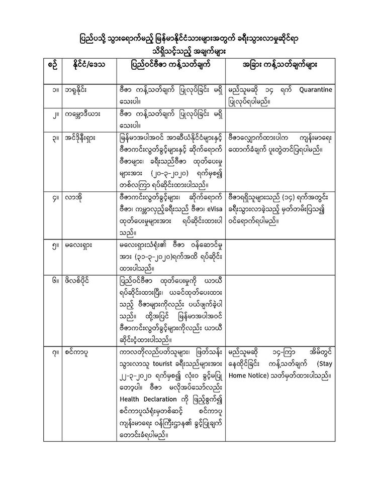 ထို့ပြင် မြန်မာနိုင်ငံသားများအနေဖြင့် မလွှဲမရှောင်သာ၍ ပြည်ပခရီးသွားရောက်ရန်ရှိပါက ခရီးမထွက်ခွာမီ သွားရောက်မည့်နိုင်ငံနှင့် ဖြတ်သန်းမည့် နိုင်ငံများမှ ခရီးသွားလာမှုဆိုင်ရာ ကန့်သတ်မှုနောက်ဆုံး အချက်အလက်များကို သက်ဆိုင်ရာ နိုင်ငံခြားသံရုံးများသို့ဖြစ်စေ၊ မြန်မာသံရုံးများ သို့ဖြစ်စေ ဆက်သွယ်စုံစမ်းကြရန်လည်း နှိုးဆော်ထားပြီး မြန်မာနိုင်ငံသားများနှင့် မြန်မာနိုင်ငံသို့ လာရောက်လည်ပတ်ခဲ့သူများအပေါ် အာဆီယံ နိုင်ငံများနှင့် အခြားပြည်ပနိုင်ငံအချို့က ခရီးသွားလာမှုနှင့်ပတ်သက်၍ ကန့်သတ်မှုများကို ဖော်ပြပါအတိုင်းချမှတ်ထားကြောင်း နိုင်ငံခြားရေး ဝန်ကြီးဌာနက အသိပေးအကြံပြုထားသည်။