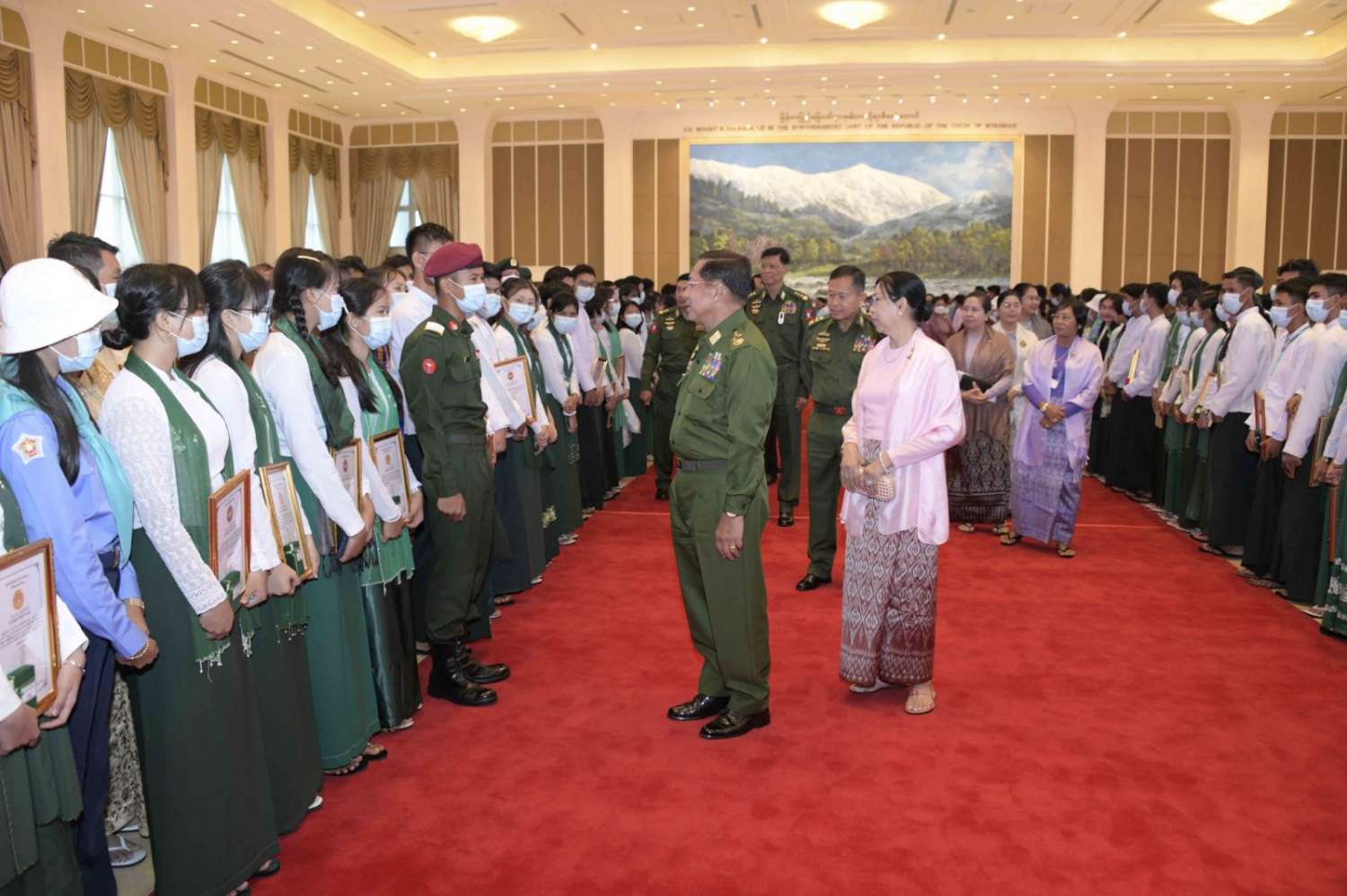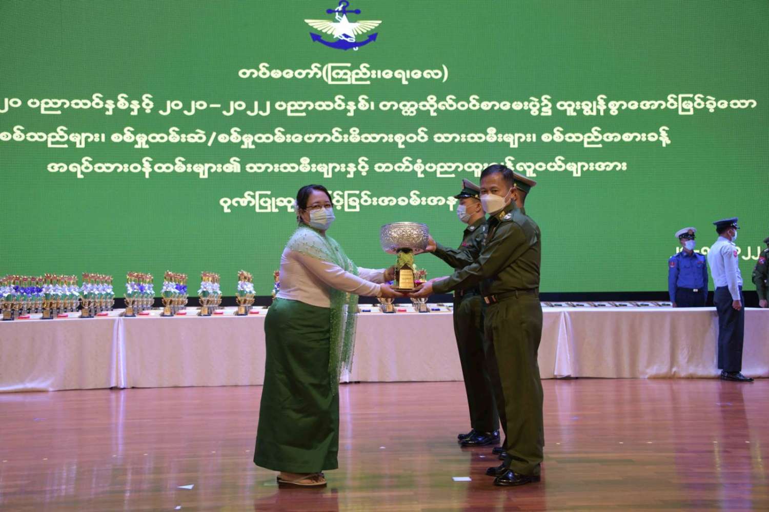နိုင်ငံတော်စီမံအုပ်ချုပ်ရေးကောင်စီဒုတိယဥက္ကဋ္ဌ၊ ဒုတိယတပ်မတော်ကာကွယ်ရေး ဦးစီးချုပ်ကာကွယ်ရေးဦးစီးချုပ် (ကြည်း)၏ ဇနီး ဒေါ်သန်းသန်းနွယ် က ဘက်စုံပညာ ထူးချွန်ဆုရရှိသူ ဗိုလ်မှူးကြီး နေဝင်းအောင်၏ သမီး မမေပီတိအောင်၊ အရာခံဗိုလ် အောင်ကြည်၏သား မောင်ရန်လင်းအောင်၊ ဗိုလ်ကြီး မင်းဝေ(အငြိမ်းစား)၏ သမီး မဖူးပြည့်ကိုကို၊ ဒုတိယအရာခံဗိုလ်/စာရေး ဆန်းမင်းဦး ၏ သမီး မခိုင်ခိုင်မင်းဦး၊ တပ်ကြပ်ကြီး/သားဖွား ဒေါ်မိုးစန္ဒာ၏ သမီး မခင်သံသာ၊ ၂၀၂၁-၂၀၂၂ ပညာသင်နှစ် တွင် (၆)ဘာသာဂုဏ်ထူးဖြင့် ထူးချွန်စွာအောင်မြင်ခဲ့သည့် ဗိုလ်မှူးကြီး ဇော်လွင်၏ သမီး မသင်းမြတ်ရတီ၊ ဒုတိယဗိုလ်မှူးကြီး သိန်းစိုးထွန်း၏ သမီး မမြင့်မြတ်သူ၊ အရာခံဗိုလ် ကြည်စိုး၏ သမီး မသန့်ရတီအောင်၊ ဒုတိယအရာခံဗိုလ်/စာရေး မင်းကြည်လေး၏ သမီး မသူသူနှင်း၊ ဗိုလ်ကြီး အောင်ရဲထွန်း(အငြိမ်းစား)၏ သမီး မမြသက်ချယ်တို့အား ဂုဏ်ပြုတံဆိပ်၊ ဂုဏ်ပြုဆုနှင့် ဂုဏ်ပြုမှတ်တမ်းလွှာများ ပေးအပ်သည်။