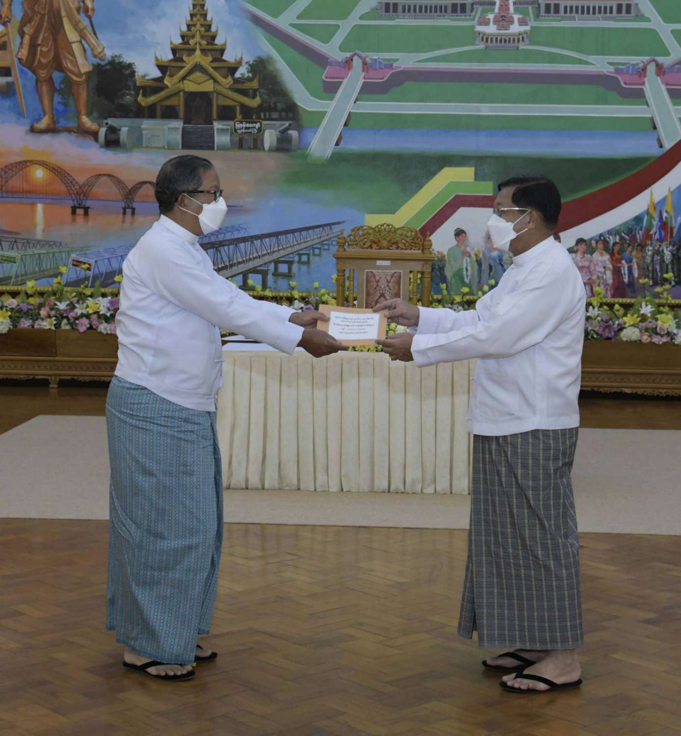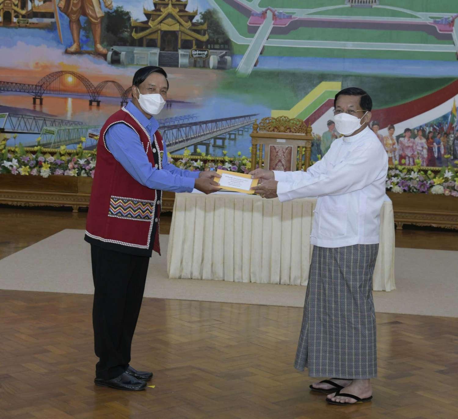 ထို့နောက် နိုင်ငံတော်စီမံအုပ်ချုပ်ရေးကောင်စီဥက္ကဋ္ဌ နိုင်ငံတော်ဝန်ကြီးချုပ်က နိုင်ငံ့စီးပွား မြှင့်တင်ရေး ရန်ပုံငွေမှ ထောက်ပံ့ငွေကို ပေးအပ်ရာ စိုက်ပျိုးရေး၊ မွေးမြူရေးနှင့် ဆည်မြောင်း ဝန်ကြီးဌာန ပြည်ထောင်စုဦးတင်ထွဋ်ဦး၊ သမဝါယမနှင့် ကျေးလက်ဖွံ့ဖြိုးရေးဝန်ကြီးဌာန ပြည်ထောင်စုဝန်ကြီး ဦးလှမိုး၊ ကချင်ပြည်နယ်၊ ကယား ပြည်နယ်၊ ကရင်ပြည်နယ်၊ ချင်းပြည်နယ်၊ တနင်္သာရီတိုင်းဒေသကြီး၊ မွန်ပြည်နယ်၊ ရခိုင်ပြည်နယ်၊ ရှမ်းပြည်နယ် အစိုးရအဖွဲ့တို့မှ ဝန်ကြီးချုပ်များ၊ နာဂ၊ ဓနု၊ ပအိုဝ့်၊ ပလောင်၊ ကိုးကန့် ကိုယ်ပိုင် အုပ်ချုပ်ခွင့်ရဒေသတို့နှင့် “ဝ” ကိုယ်ပိုင်အုပ်ချုပ်ခွင့်ရတိုင်း စီမံအုပ်ချုပ်ရေး အဖွဲ့တို့မှ ဥက္ကဋ္ဌများက အသီးသီး လက်ခံရယူကြသည်။