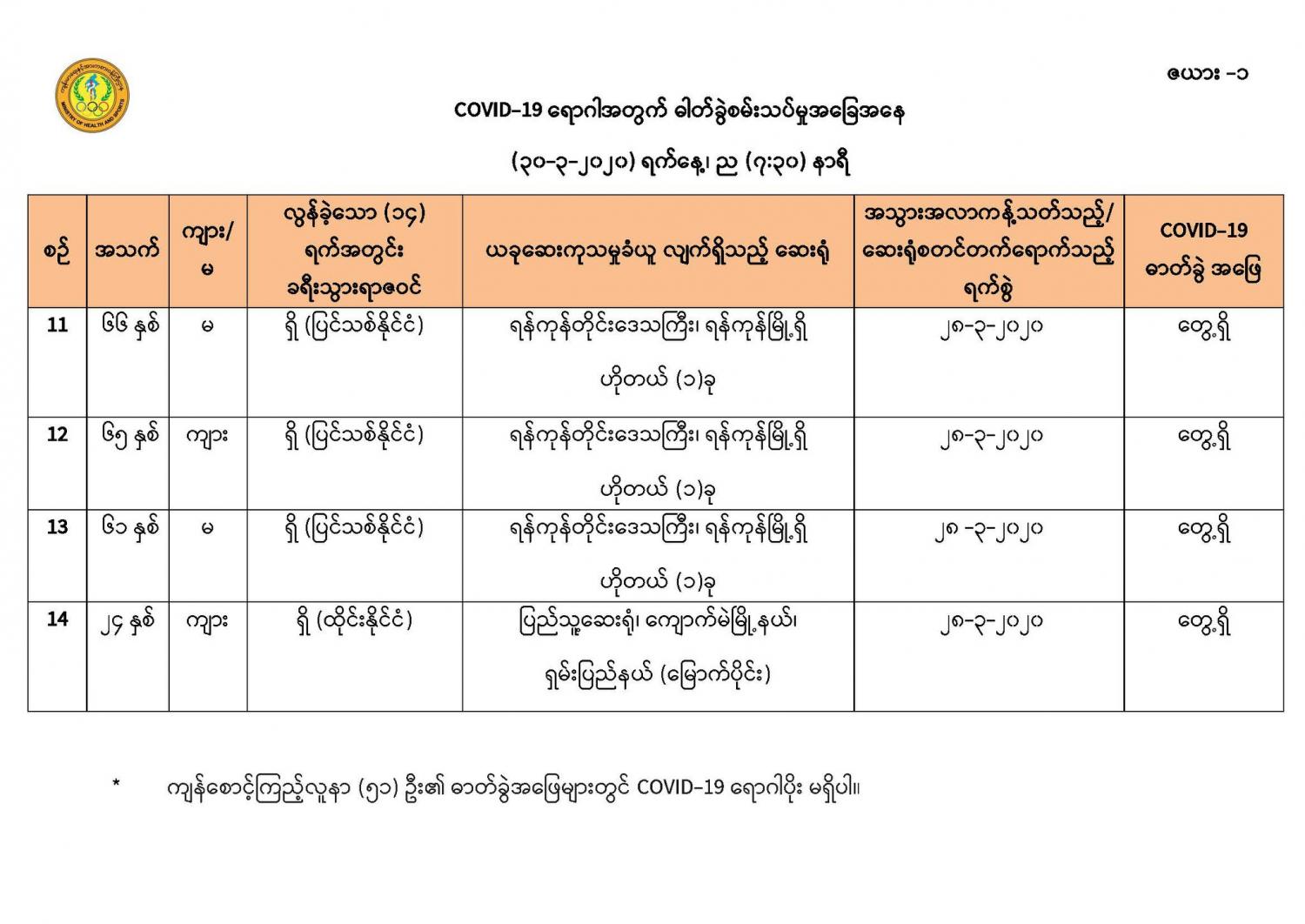 ၃။ ဓာတ်ခွဲအတည်ပြုလူနာ (Case-14) သည် ရှမ်းပြည်နယ် (မြောက်ပိုင်း)၊ ကျောက်မဲမြို့နယ် တွင် နေထိုင်သော အသက် (၂၄) နှစ်အရွယ် မြန်မာနိုင်ငံသား အမျိုးသားတစ်ဦးဖြစ်ပြီး (၂၅-၃-၂၀၂၀) ရက်နေ့တွင် ထိုင်းနိုင်ငံ၊ ဘန်ကောက်မြို့မှ မြန်မာနိုင်ငံ တာချီလိတ်မြို့သို့ ပြန်လည်ရောက်ရှိခဲ့ကာ တာချီလိတ် မြို့တွင် (၂)ညတာတည်းခိုနေထိုင်ခဲ့ပါသည်။ (၂၇-၃-၂၀၂၀)ရက်နေ့၊ ညနေတွင် တာချီလိတ်မြို့မှ မန္တလေးမြို့သို့ လေကြောင်းဖြင့်ရောက်ရှိခဲ့ပြီး အဆိုပါနေ့ ညနေပိုင်းတွင် ကိုယ်ပိုင်မော်တော်ယာဉ်ဖြင့် မန္တလေးမြို့မှ ကျောက်မဲမြို့သို့ ရောက်ရှိခဲ့ပါသည်။ (၂၈-၃-၂၀၂၀) ရက်နေ့တွင် အလွန်အမင်း အန်ခြင်း၊ ချောင်းဆိုးခြင်း လက္ခဏာများခံစားခဲ့ရသဖြင့် ပြည်သူ့ဆေးရုံ၊ ကျောက်မဲမြို့သို့ (၂၈-၃-၂၀၂၀) ရက်နေ့၊ ညပိုင်းတွင် လာရောက်ပြသခဲ့ပြီး စောင့်ကြည့်လူနာအဖြစ် သီးသန့်ထားရှိ၍ ဆေးကု သမှုခံယူကာ ဓာတ်ခွဲနမူနာအား ပေးပို့စစ်ဆေးခဲ့ခြင်းဖြစ်ပါသည်။ အဆိုပါ လူနာ၏ လတ်တလော ကျန်းမာရေးအခြေအနေမှာ ကောင်းမွန်လျက်ရှိပါသည်။