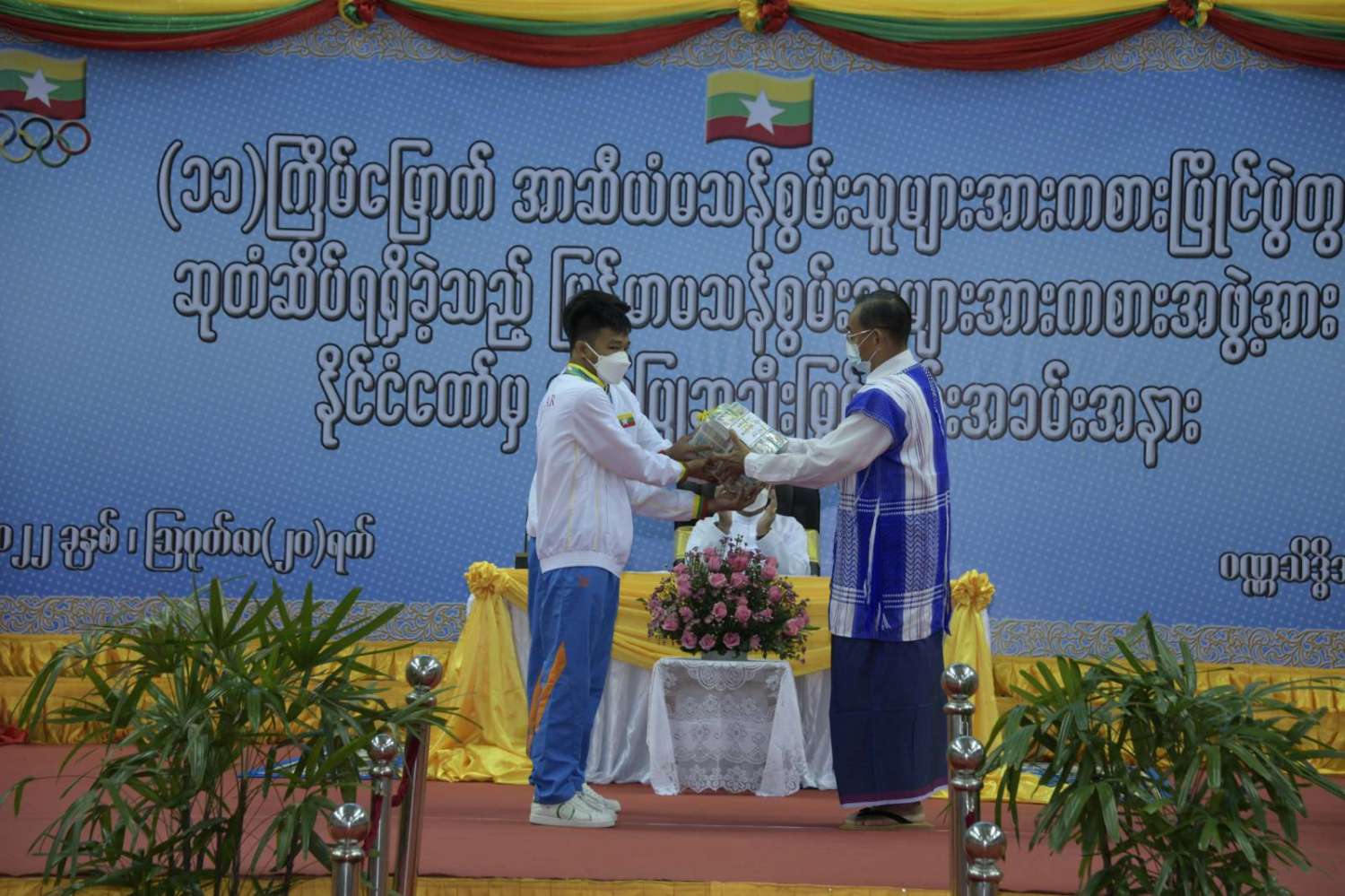 ဆက်လက်၍ နိုင်ငံတော်စီမံအုပ်ချုပ်ရေးကောင်စီဝင်များ ဖြစ်ကြသည့် ဗိုလ်ချုပ်ကြီး မြထွန်းဦး၊ ဗိုလ်ချုပ်ကြီး တင်အောင်စန်း၊ မန်းငြိမ်းမောင်၊ ဒေါ်အေးနုစိန်၊ Jang Phange နော်တောင်၊ ဦးမောင်းဟာ၊ ဦးစိုင်းလုံးဆိုင်နှင့် စောဒန်နီယယ် တို့က ငွေတံဆိပ်၊ ကြေးတံဆိပ် ရရှိကြသည့် နိုင်ငံ့ဂုဏ်ဆောင် ဆုရအားကစားသမားများ၊ အုပ်ချုပ်မှုအဖွဲ့နှင့် နည်းပြများကို ဂုဏ်ပြုဆုငွေများ အသီးသီးပေးအပ်ချီးမြှင့်ကြသည်။