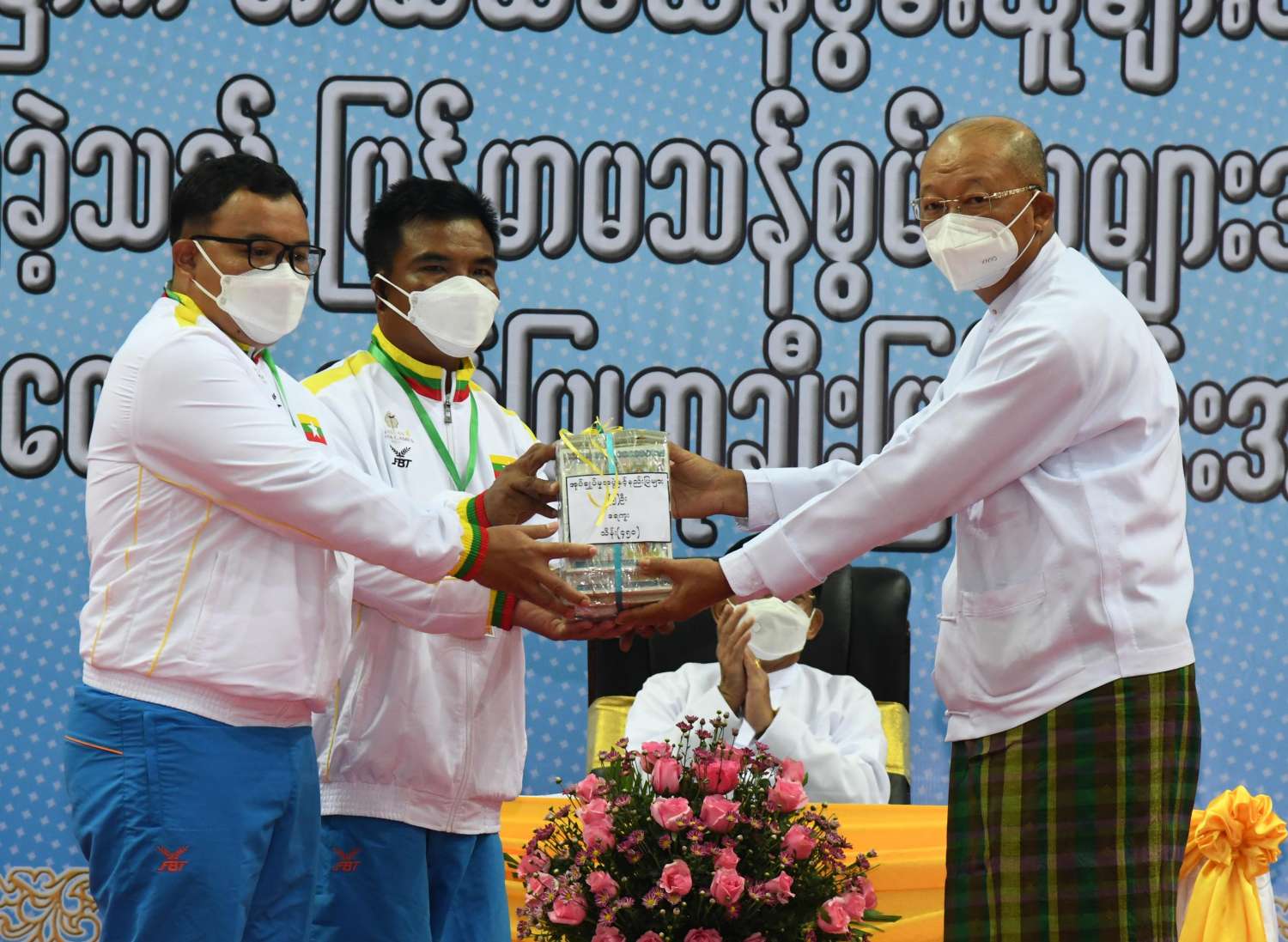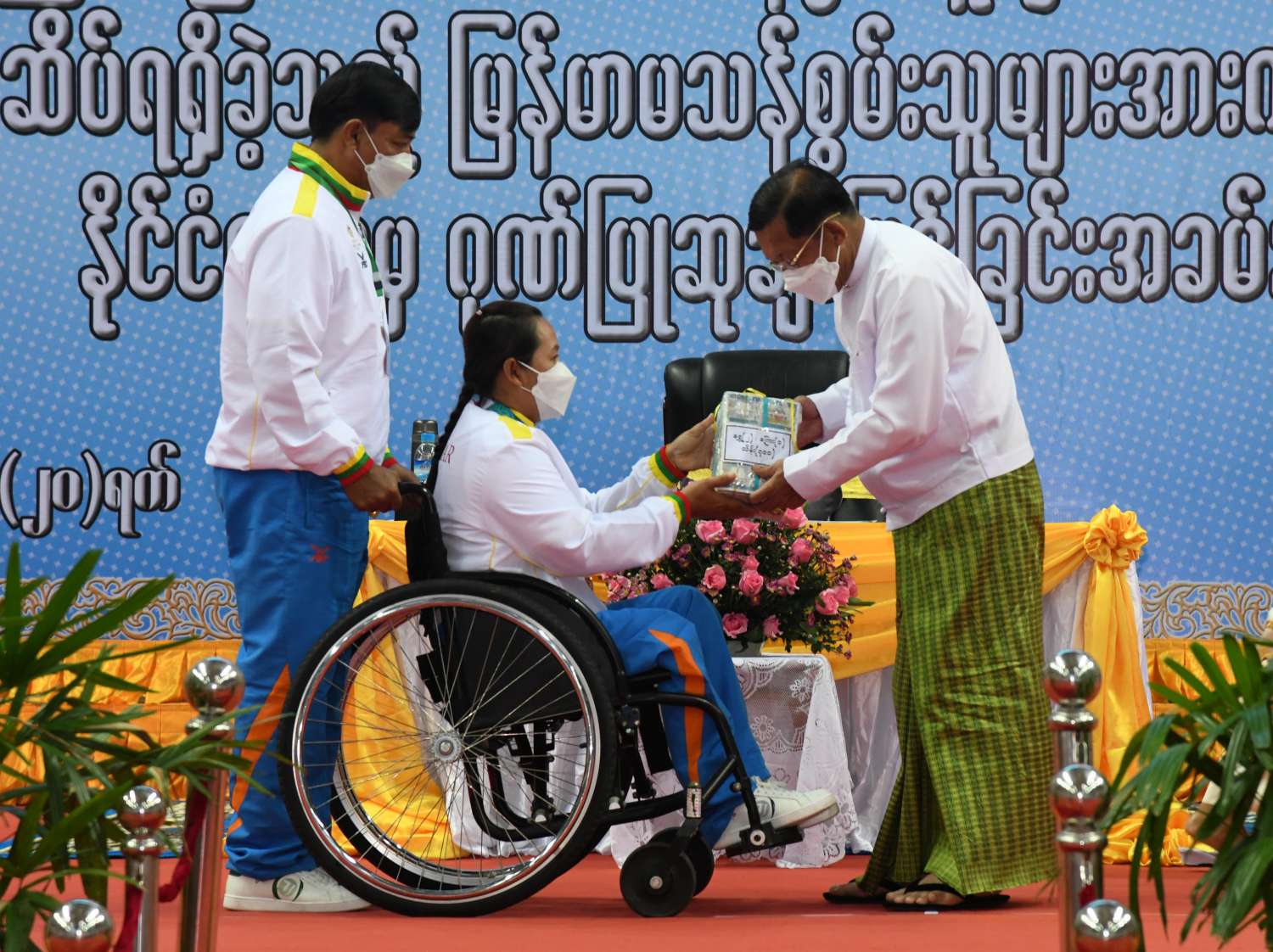 ထို့နောက် (၁၁)ကြိမ်မြောက် အာဆီယံမသန်စွမ်းသူများ အားကစားပြိုင်ပွဲတွင် ဆုတံဆိပ်ရရှိခဲ့သည့် နိုင်ငံ့ဂုဏ်ဆောင် ဆုရအားကစားသမားများ၊ နည်းပြများနှင့် အုပ်ချုပ်သူများကို ဂုဏ်ပြုဆုငွေများ ပေးအပ်ချီးမြှင့်ရာ နိုင်ငံတော်စီမံအုပ်ချုပ်ရေးကောင်စီဥက္ကဋ္ဌ နိုင်ငံတော်ဝန်ကြီးချုပ်က ရွှေတံဆိပ်ဆုရရှိခဲ့ကြသည့် ပြေးခုန်ပစ်အားကစားနည်းမှ မီတာ ၁၀၀ နှင့် မီတာ ၂၀၀ အပြေးပြိုင်ပွဲတွင် ရွှေတံဆိပ် ၂ ခုနှင့် အသင်းလိုက်မီတာ ၄၀၀ လက်ဆင့်ကမ်းအပြေးပြိုင်ပွဲတွင် ငွေတံဆိပ် ၁ ခု ရရှိခဲ့သည့် အားကစားသမား ဒုတပ်ကြပ် စိုးပေ ကိုလည်းကောင်း၊ ပြေးခုန်ပစ်အားကစားနည်းမှ သံပြားပစ်နှင့် သံလုံးပစ်ပြိုင်ပွဲတွင် ရွှေတံဆိပ် ၂ ခုနှင့် လှံတံပစ်ပြိုင်ပွဲတွင် ကြေးတံဆိပ်၁ ခု ရရှိခဲ့သည့် အားကစားသမား မထက်ထက်အေးကို လည်းကောင်း၊ ရေကူး အားကစားနည်းမှ မီတာ ၂၀၀ အလွတ်ကူးနှင့် မီတာ ၁၀၀ ပတ်လည်ကူးပြိုင်ပွဲတွင် ရွှေတံဆိပ် ၂ ခုနှင့် မီတာ ၅၀ အလွတ်ကူးပြိုင်ပွဲတွင် ကြေးတံဆိပ် ၁ ခု ရရှိခဲ့သည့် အားကစားသမား မောင်အောင်မြင့်မြတ် ကိုလည်းကောင်း၊ ပြေးခုန်ပစ်အားကစားနည်းမှ သံလုံးပစ်နှင့် သံပြားပစ်ပြိုင်ပွဲတွင် ရွှေတံဆိပ် ၂ ခု ရရှိခဲ့သည့် အားကစားသမား မောင်အောင်ဘုန်းမြတ် ကိုလည်းကောင်း၊ ပြေးခုန်ပစ်အားကစားနည်းမှ မီတာ ၄၀၀ အပြေးပြိုင်ပွဲတွင်ရွှေတံဆိပ် ၁ ခု၊ အသင်းလိုက် မီတာ ၄၀၀ လက်ဆင့်ကမ်းအပြေး ပြိုင်ပွဲတွင် ငွေတံဆိပ် ၁ ခုနှင့် မီတာ ၂၀၀ အပြေးပြိုင်ပွဲတွင် ကြေးတံဆိပ် ၁ ခု ရရှိခဲ့သည့် အားကစားသမား အရာခံဗိုလ် ကျော်ကျော်ဝင်းကိုလည်းကောင်း၊ ပြေးခုန်ပစ်အားကစားနည်းမှ သံလုံးပစ်ပြိုင်ပွဲ တွင် ရွှေတံဆိပ် ၁ ခုနှင့် သံပြားပစ်ပြိုင်ပွဲတွင် ငွေတံဆိပ် ၁ ခုရရှိခဲ့သည့် အားကစားသမား ဒုတပ်ကြပ် ဇော်မင်းလွင်ကိုလည်းကောင်း၊ ရေကူးအားကစားနည်းမှ မီတာ ၁၀၀ ရင်ဘောင်တန်းကူးပြိုင်ပွဲနှင့် မီတာ ၅၀ အလွတ်ကူးပြိုင်ပွဲတွင် ရွှေတံဆိပ် ၁ ခုနှင့် ငွေတံဆိပ် ၁ ခုရရှိခဲ့သည့် အားကစားသမား မောင်အောင်ဖုန်းကိုလည်းကောင်း၊ ရေကူးအားကစားနည်းမှ မီတာ ၅၀ ပတ်လည် ကူးပြိုင်ပွဲတွင် ရွှေတံဆိပ် ၁ ခုနှင့် မီတာ၅၀ လိပ်ပြာကူးပြိုင်ပွဲတွင် ငွေတံဆိပ် ၁ ခု ရရှိခဲ့သည့် အားကစားသမား မောင်ကျော်ထူးကိုလည်းကောင်း၊ ပြေးခုန်ပစ် အားကစားနည်းမှ လှံတံပစ်ပြိုင်ပွဲတွင် ရွှေတံဆိပ်(၁)ခုနှင့် သံလုံးပစ်ပြိုင်ပွဲတွင် ကြေးတံဆိပ် ၁ ခုရရှိခဲ့သည့် အားကစားသမား တပ်ကြပ်တင်ညိုကိုလည်းကောင်း၊ ရေကူးအားကစားနည်းမှ မီတာ ၁၀၀ ရင်ဘောင်တန်းကူး ပြိုင်ပွဲတွင် ရွှေတံဆိပ် ၁ ခု ရရှိခဲ့သည့် အားကစားသမား မောင်နန္ဒာစိုးမင်းကိုလည်းကောင်း ဂုဏ်ပြုချီးမြှင့်ငွေများ ပေးအပ်ချီးမြှင့်သည်။