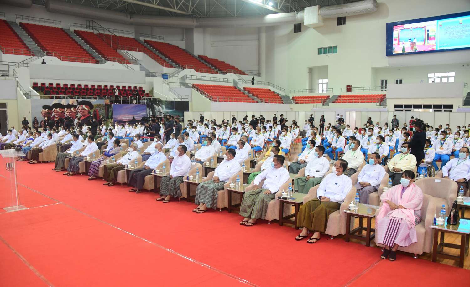 အခမ်းအနားသို့ နိုင်ငံတော်စီမံအုပ်ချုပ်ရေးကောင်စီဥက္ကဋ္ဌ နိုင်ငံတော်ဝန်ကြီးချုပ်နှင့်အတူ ကောင်စီဒုတိယဥက္ကဋ္ဌ ဒုတိယဝန်ကြီးချုပ် ဒုတိယဗိုလ်ချုပ်မှူးကြီး စိုးဝင်း၊ နိုင်ငံတော်စီမံအုပ်ချုပ်ရေးကောင်စီအဖွဲ့ဝင်များ၊ ပြည်ထောင်စုအဆင့်ပုဂ္ဂိုလ်များ၊ ပြည်ထောင်စုဝန်ကြီးများ၊ နေပြည်တော်ကောင်စီဥက္ကဋ္ဌ၊ ကာကွယ်ရေးဦးစီးချုပ်ရုံးမှ တပ်မတော်အရာရှိကြီးများ၊ နေပြည်တော်တိုင်းစစ်ဌာနချုပ် တိုင်းမှူး၊ ဒုတိယဝန်ကြီးများ၊ မြန်မာနိုင်ငံအားကစားအဖွဲ့ချုပ်များမှ ဥက္ကဋ္ဌများ၊ ဒုတိယဥက္ကဋ္ဌများ၊ ဖိတ်ကြားထားသူများ၊ နိုင်ငံ့ဂုဏ်ဆောင်အားကစားသမားများ၊ အုပ်ချုပ်သူများ၊ နည်းပြများနှင့် တာဝန်ရှိသူများ တက်ရောက်ကြသည်။