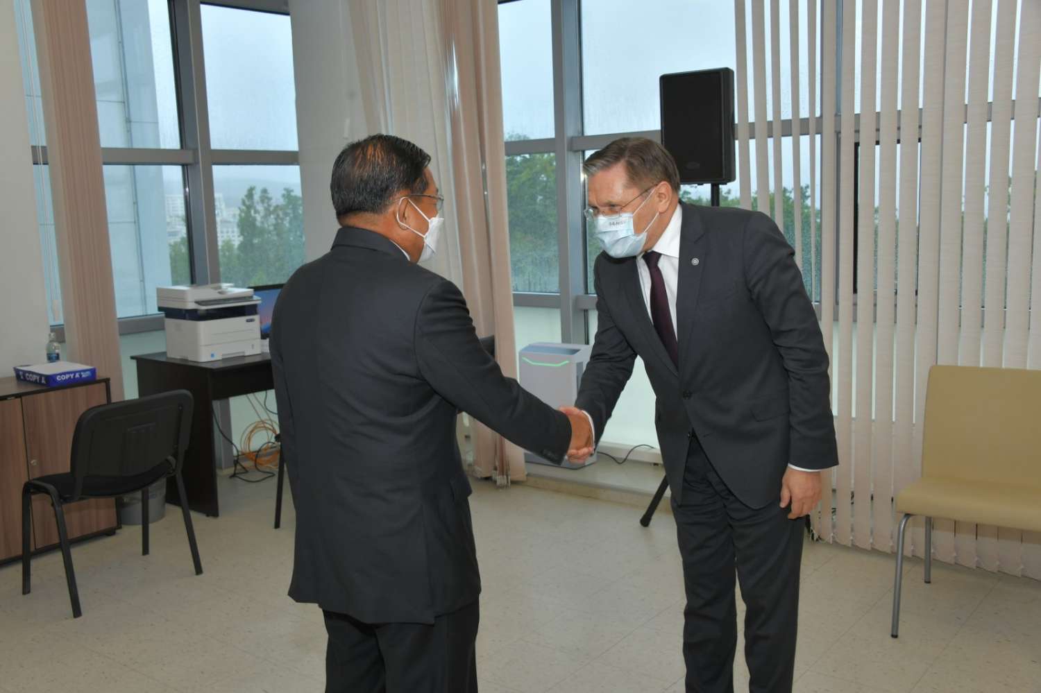 ထို့နောက် မွန်းလွဲပိုင်းတွင် နိုင်ငံတော်စီမံအုပ်ချုပ်ရေးကောင်စီဥက္ကဋ္ဌ နိုင်ငံတော်ဝန်ကြီးချုပ်နှင့် အဖွဲ့ဝင်များသည် ရုရှားနိုင်ငံပိုင် အဏုမြူကော်ပိုရေးရှင်း Rosatom State Corporations ၏ အမှုဆောင်အရာရှိချုပ် Mr. Alexey Evgenievich Likhachev ဦးဆောင်သည့် အဖွဲ့ဝင်များအား FEFU Campus အတွင်း တွေ့ဆုံ၍ နျူကလီးယား စွမ်းအင်နည်းပညာ ပူးပေါင်းဆောင်ရွက်မှု နယ်ပယ်များတွင် အတွေ့အကြုံနှင့် နည်းပညာများကို လေ့လာခွင့်ရရှိနိုင်မည့် အခြေအနေများနှင့် နှစ်နိုင်ငံပြည်သူလူထု အကျိုးရှိစေနိုင်မည့် ကဏ္ဍများ၌ ပူးပေါင်းဆောင်ရွက်နိုင်မည့် အခြေအနေများ၊ နျူကလီးယားစွမ်းအင်ကို နိုင်ငံသူ၊ နိုင်ငံသားများ၏ လူမှုဘဝစီးပွား ဖွံ့ဖြိုးတိုးတက်ရေးအတွက် ငြိမ်းချမ်းစွာ အသုံးပြုနိုင်ရန် ပူးပေါင်းဆောင်ရွက်မှုအတွက် လုပ်ငန်းစဉ်များ(Road Map) ချမှတ်ဆောင်ရွက်မည့် အစီအစဉ်များ၊ နျူကလီးယားစွမ်းအင်ကို လျှပ်စစ်ဓာတ်အား ထုတ်လုပ်ရေးကဲ့သို့သော လုပ်ငန်းအပါအဝင် သိပ္ပံနှင့် သုတေသန စမ်းသပ်ခြင်း၊ ဆေးဝါးထုတ်လုပ်ခြင်း၊ စက်မှုကဏ္ဍနှင့် ကဏ္ဍပေါင်းစုံတွင် အကျိုးရှိစွာ အသုံးပြုဆောင်ရွက်နိုင်မည့် အခြေအနေများနှင့် ပတ်သက်၍ ဆွေးနွေးသည်။