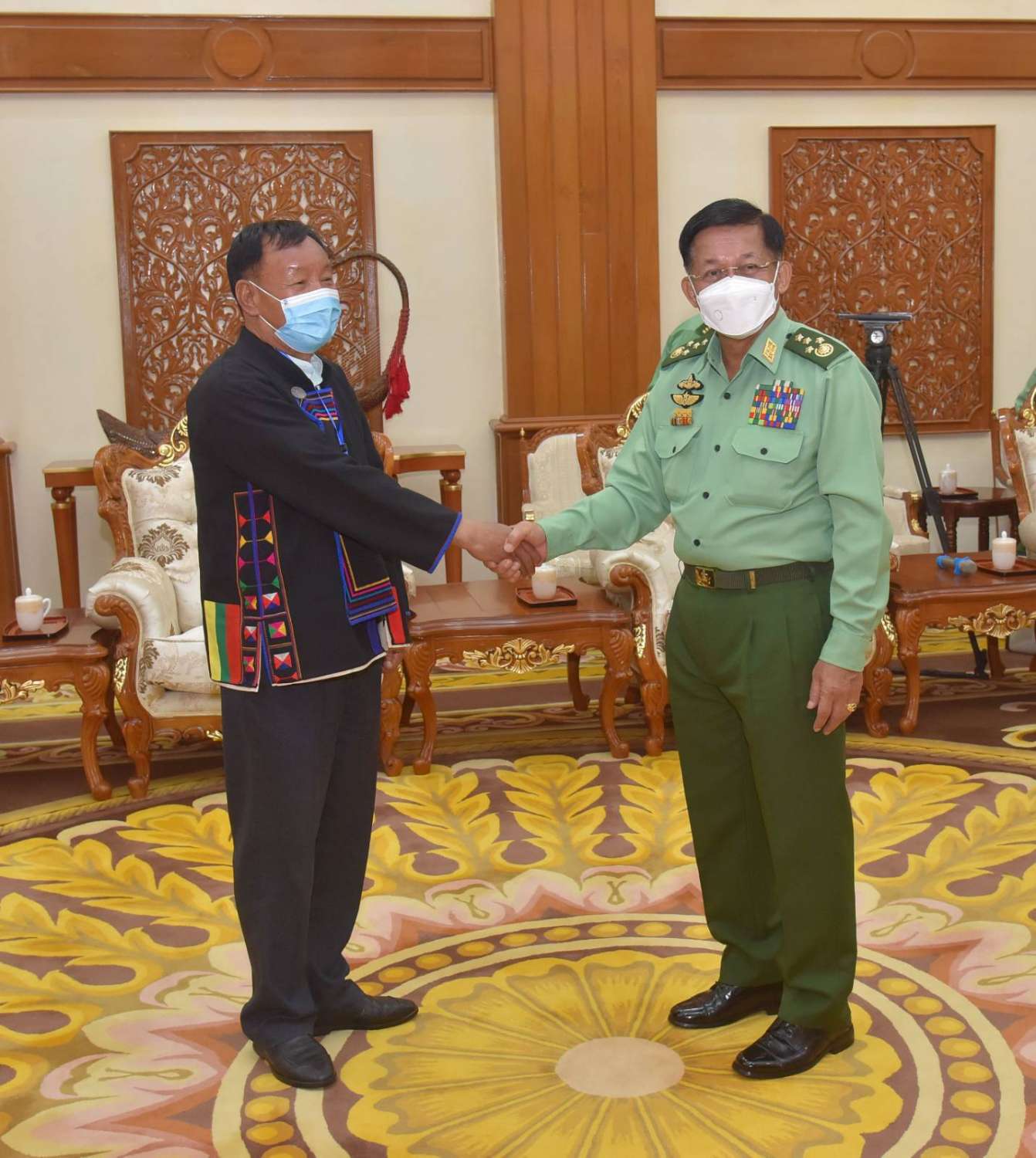 နိုင်ငံတော်စီမံအုပ်ချုပ်ရေးကောင်စီဥက္ကဋ္ဌ တပ်မတော်ကာကွယ်ရေးဦးစီးချုပ် ဗိုလ်ချုပ်မှူးကြီး မင်းအောင်လှိုင်သည် “ဝ”ပြည် သွေးစည်းညီညွတ်ရေးပါတီ (UWSP) ဒုတိယဥက္ကဋ္ဌ ဦးလော့ယာကု၊ အမျိုးသားဒီမိုကရက်တစ်မဟာမိတ်အဖွဲ့ (NDAA) ဒုတိယဥက္ကဋ္ဌ ဦးစန်ပေ့နှင့် ရှမ်းပြည်တိုးတက်ရေးပါတီ (SSPP) ဒုတိယဥက္ကဋ္ဌ(၂) စဝ်ခွန်ဆိုင်တို့ ဦးဆောင်သည့် ငြိမ်းချမ်းရေးကိုယ်စားလှယ်အဖွဲ့အား ယနေ့နံနက်ပိုင်းတွင် နေပြည်တော်ရှိ ဘုရင့်နောင်ရိပ်သာ ဧည့်ခန်းမဆောင်၌ တွေ့ဆုံ၍ ငြိမ်းချမ်းရေးဆိုင်ရာကိစ္စရပ်များ ဆွေးနွေးသည်။