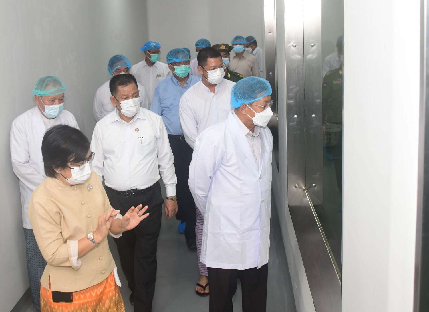 ထို့နောက် နိုင်ငံတော် စီမံအုပ်ချုပ်ရေး ကောင်စီဥက္ကဋ္ဌ နိုင်ငံတော် ဝန်ကြီးချုပ်နှင့် အဖွဲ့ဝင်များသည် စက်ရုံအတွင်း ဆေးဝါးများ ထုတ်လုပ်နေမှုကို လှည့်လည် ကြည့်ရှု လေ့လာကြရာ ဒေါက်တာ ဒေါ်ဌေးဌေးခိုင်က လိုက်လံ ရှင်းလင်းတင်ပြသည်။ ယင်းနောက် စက်ရုံခန်းမတွင် စက်ရုံမှူး ဦးနေဝင်းက မောရိယ တိုင်းဆေးဝါးကို ရှေးယခင် နှစ်ပေါင်း ၁၆၀ မှစ၍ ထုတ်လုပ်ခဲ့မှု၊ လက်ရှိအချိန်တွင် ဆေးဝါးများကို အဆင့်မီစွာဖြင့် ဆက်လက် ထုတ်လုပ်နေမှု အခြေအနေများကို Video clip ဖြင့် ရှင်းလင်း တင်ပြသည်။
