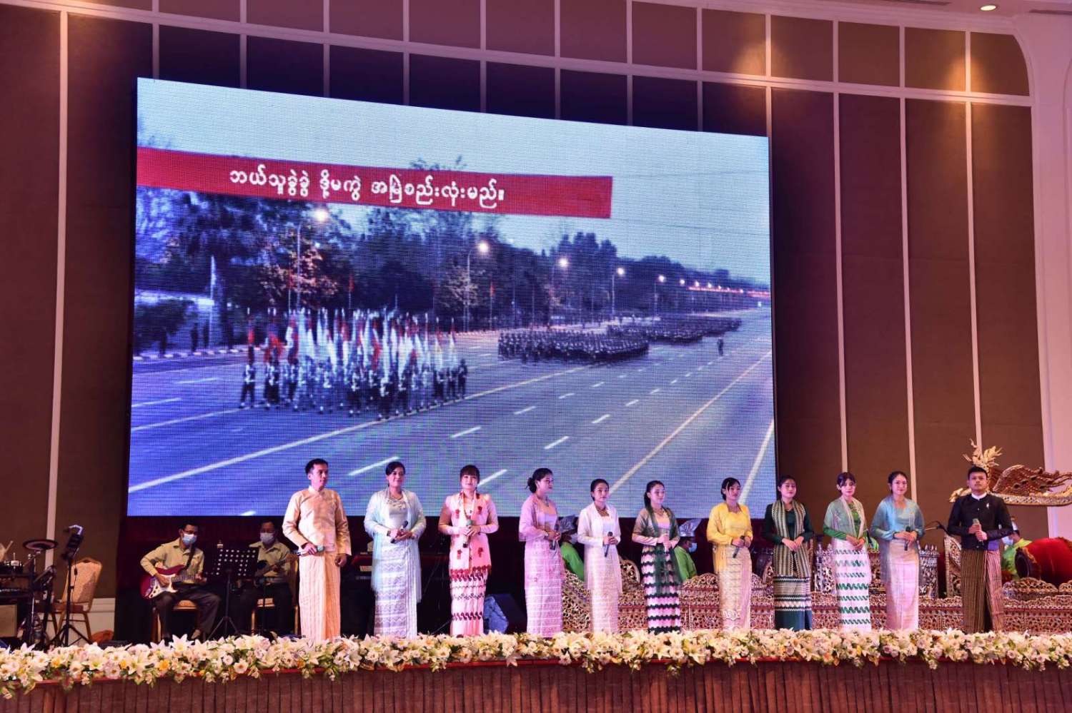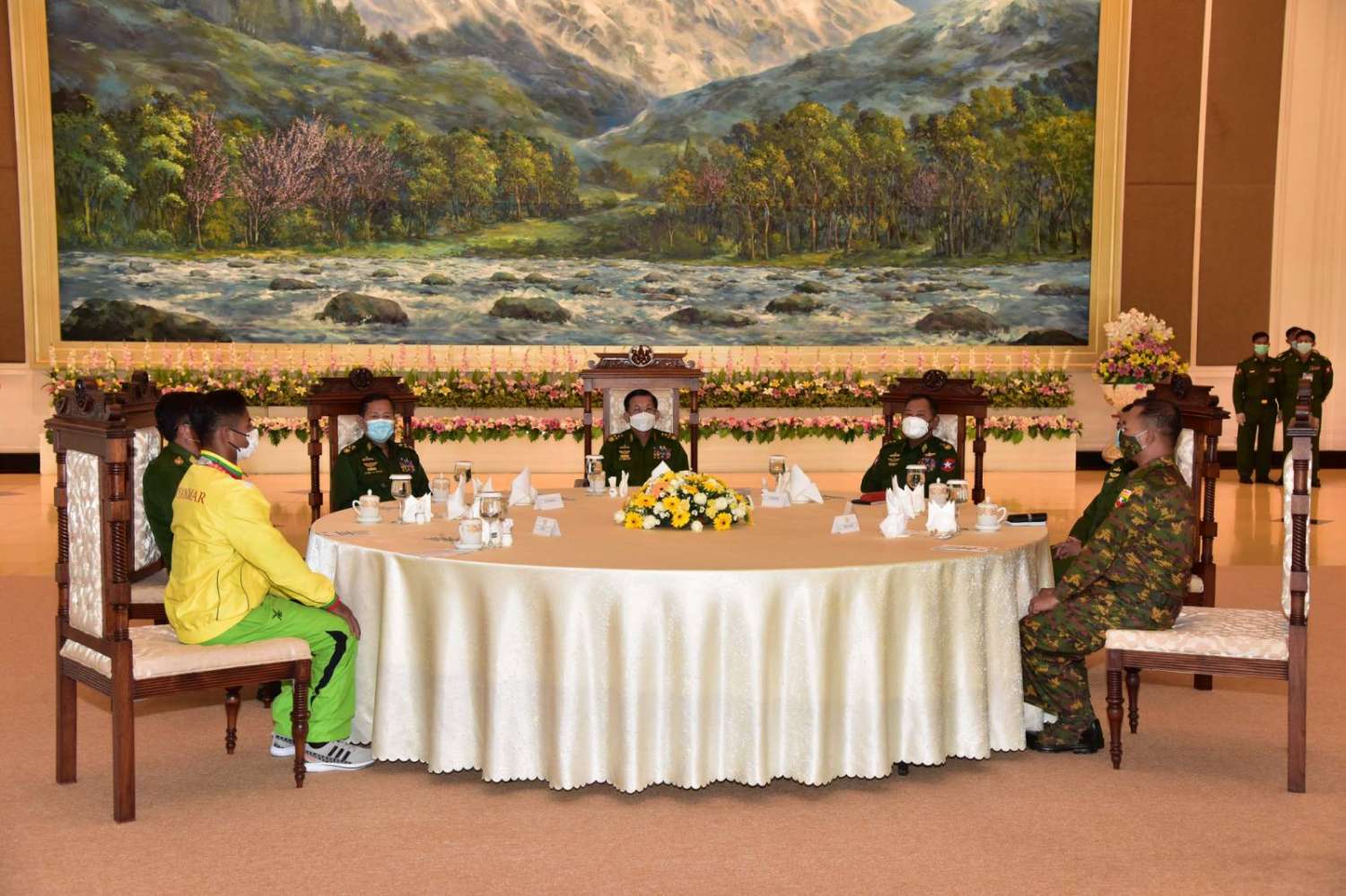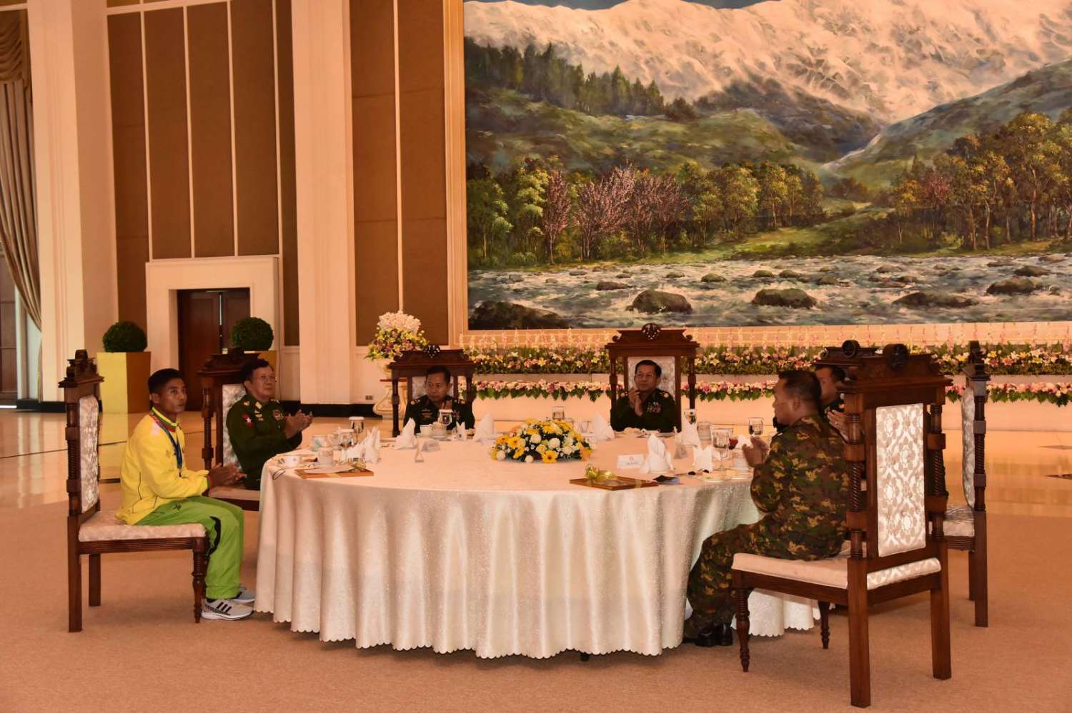 ယင်းနောက် နိုင်ငံတော်စီမံအုပ်ချုပ်ရေးကောင်စီဥက္ကဋ္ဌ တပ်မတော်ကာကွယ်ရေးဦးစီးချုပ်နှင့် အဖွဲ့ဝင်များသည် အားကစားဖြင့် တပ်မတော်ဂုဏ်ဆောင်ခဲ့ကြသည့် တပ်မတော်သားအားကစားသမားများ၊ နည်းပြများကို ဂုဏ်ပြုလက်ဖက်ရည်ဝိုင်းဖြင့် တည်ခင်းဧည့်ခံခဲ့ပြီး မြဝတီတေးဂီတအဖွဲ့မှလည်း တေးသီချင်းများဖြင့် ဂုဏ်ပြုဖျော်ဖြေတင်ဆက်သည်။