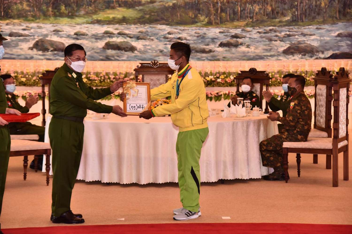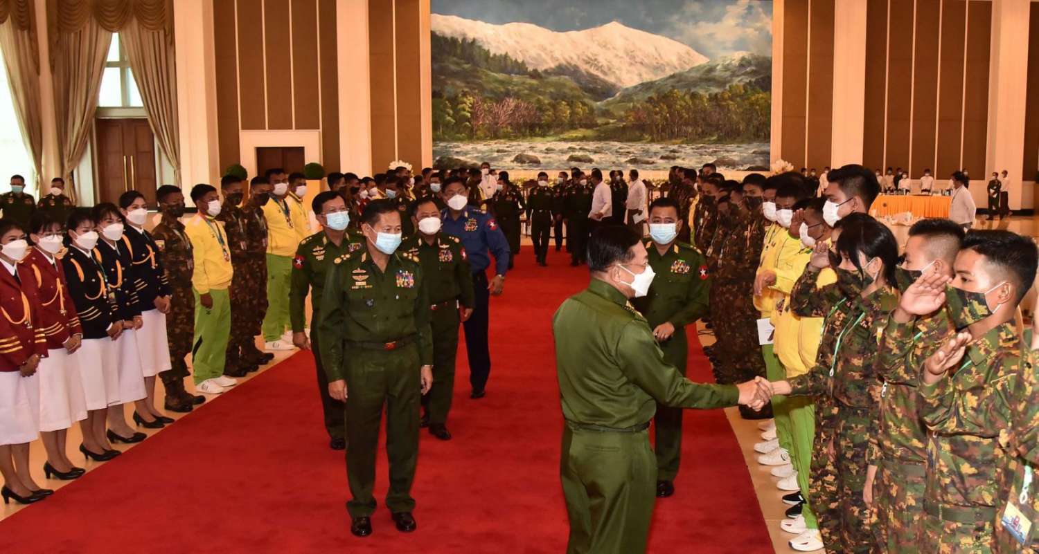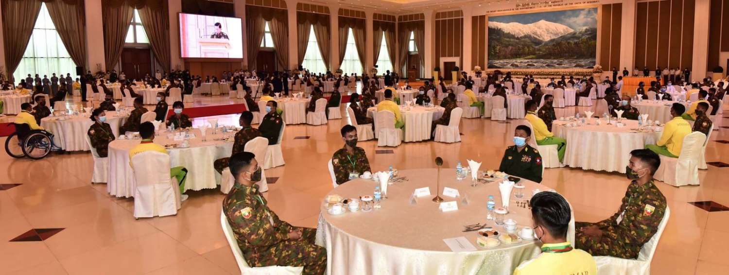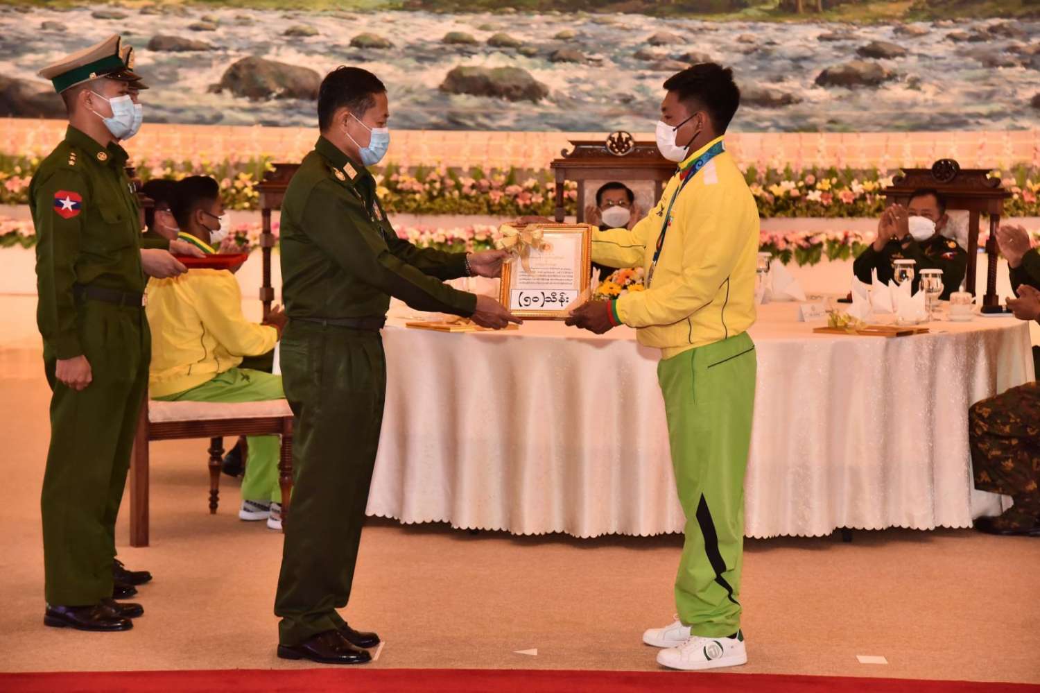 (၁၁) ကြိမ်မြောက် အာဆီယံမသန်စွမ်းသူများ အားကစားပြိုင်ပွဲတွင်ဆုရရှိခဲ့သော တပ်မတော်မှအားကစားသမားများနှင့် ဆုရရှိအောင်စွမ်းဆောင်ပေးနိုင်ခဲ့သည့် နည်းပြများ၊ နိုင်ငံတကာတပ်မတော်အားကစားပြိုင်ပွဲ (International Army Games-2022) နှင့် နိုင်ငံတကာဗိုလ်လောင်းများအားကစားပြိုင်ပွဲ (3rd World Cadet Games-2022) တို့တွင် ဆုရရှိခဲ့ကြသူများအား ဂုဏ်ပြုဆုများ ပေးအပ်ချီးမြှင့်ခြင်းအခမ်းအနားကို ယနေ့မွန်းလွဲပိုင်းတွင် နေပြည်တော်ရှိ ဇေယျာသီရိဗိမာန်ဧည့်ခန်းမဆောင်၌ ကျင်းပပြုလုပ်ရာ နိုင်ငံတော် စီမံအုပ်ချုပ်ရေးကောင်စီဥက္ကဋ္ဌ တပ်မတော်ကာကွယ်ရေးဦးစီးချုပ် ဗိုလ်ချုပ်မှူးကြီး မင်းအောင်လှိုင် တက်ရောက်၍ ဂုဏ်ပြုဆုများပေးအပ်ချီးမြှင့်သည်။