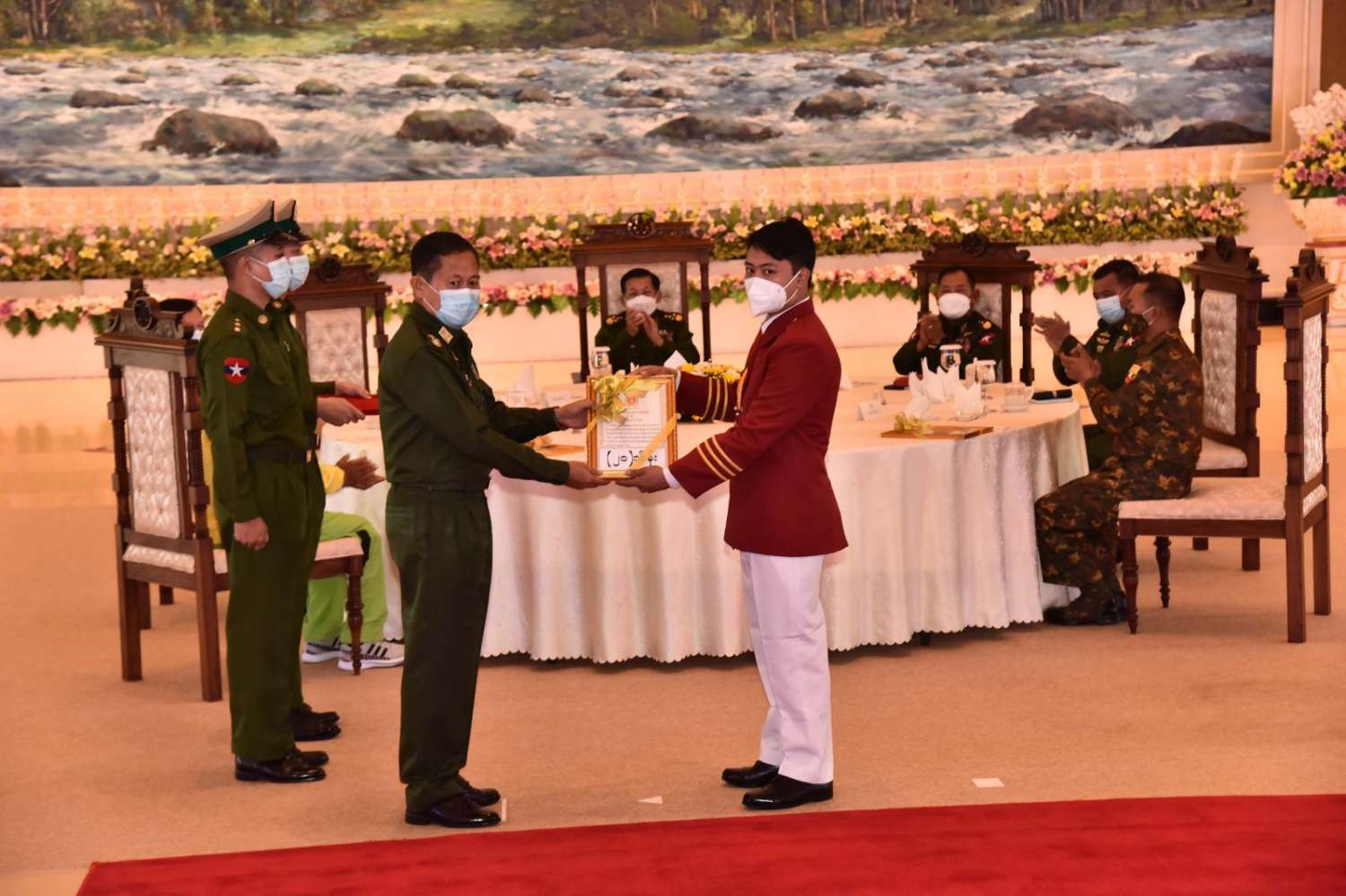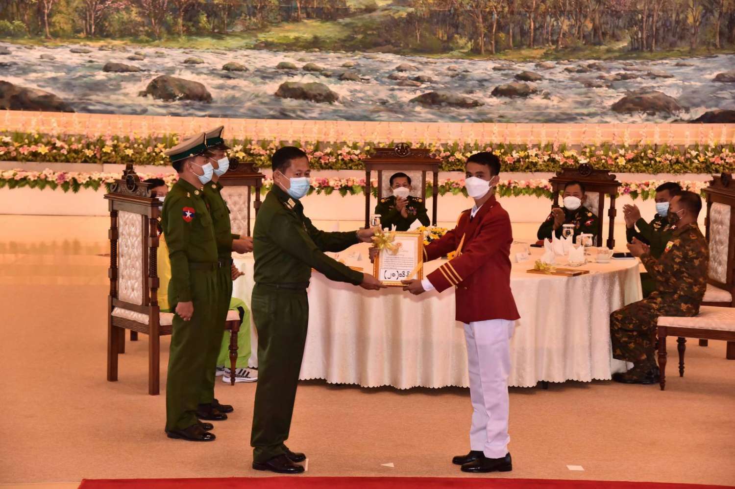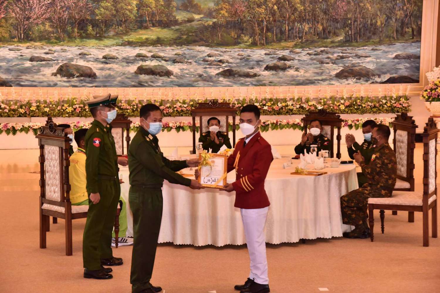 ယင်းနောက် နိုင်ငံတော်စီမံအုပ်ချုပ်ရေးကောင်စီဒုတိယဥက္ကဋ္ဌ ဒုတိယတပ်မတော် ကာကွယ်ရေးဦးစီးချုပ် ကာကွယ်ရေးဦးစီးချုပ် (ကြည်း) က (၁၁) ကြိမ်မြောက်အာဆီယံ မသန်စွမ်းသူများ အားကစားပြိုင်ပွဲတွင် ပြေးခုန်ပစ် (သံလုံးပစ်) (တစ်ဦးချင်းပြိုင်ပွဲ) ၌ ငွေ တံဆိပ်ဆု၊ (လှံတံပစ်) (တစ်ဦးချင်းပြိုင်ပွဲ) ၌ ကြေးတံဆိပ်ဆု၊ သံပြားပစ် (တစ်ဦးချင်း ပြိုင်ပွဲ) ၌ ကြေးတံဆိပ်ဆုတို့ကိုရရှိခဲ့သည့် ဒုတိယတပ်ကြပ် အောင်ထွန်းလင်း၊ ပြေးခုန်ပစ် (လှံတံပစ်) (တစ်ဦးချင်းပြိုင်ပွဲ) ၌ ငွေတံဆိပ်ဆု၊ ပြေးခုန်ပစ် (အမြင့်ခုန်) (တစ်ဦးချင်းပြိုင်ပွဲ) ၌ ကြေးတံဆိပ်ဆုတို့ကို ရရှိခဲ့သည့် ဒုတိယတပ်ကြပ် စိုးသန်း၊ နိုင်ငံတကာတပ်မတော် အားကစားပြိုင်ပွဲ (International Army Games-2022) ရိုးရာယဉ်ကျေးမှုဆိုင်ရာပြိုင်ပွဲ၊ အတီးပြိုင်ပွဲတွင် အသင်းလိုက်ပထမဆုရရှိခဲ့သည့် တပ်ကြပ်အောင်အောင်ထက်နှင့် တပ်သား (အစားခန့်) ပိုင်ကျော် ၊ ရိုးရာယဉ်ကျေးမှုဆိုင်ရာပြိုင်ပွဲ၊ ရုရှားသီချင်းဆို ပြိုင်ပွဲတွင် စုံတွဲပထမဆု ရရှိခဲ့သည့် တပ်ကြပ်ကြီး (အစားခန့်) စိုးမင်းနိုင်၊ ရုရှားသီချင်းဆိုပြိုင်ပွဲ စုံတွဲပထမဆုနှင့် တစ်ဦးချင်း ဒုတိယဆုတို့ကိုရရှိခဲ့သည့် တပ်ကြပ်ကြီး (အစားခန့်) ထူးဣန္ဒာကျော် တို့ကို တပ်မတော်ကာကွယ်ရေးဦးစီးချုပ်၏ ဂုဏ်ပြုမှတ်တမ်းလွှာနှင့် ဂုဏ်ပြုဆုငွေများကို ပေးအပ်ချီးမြှင့်သည်။