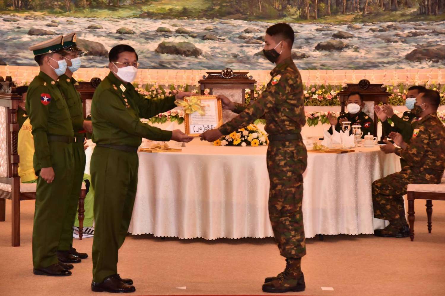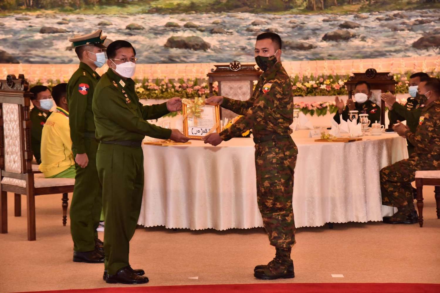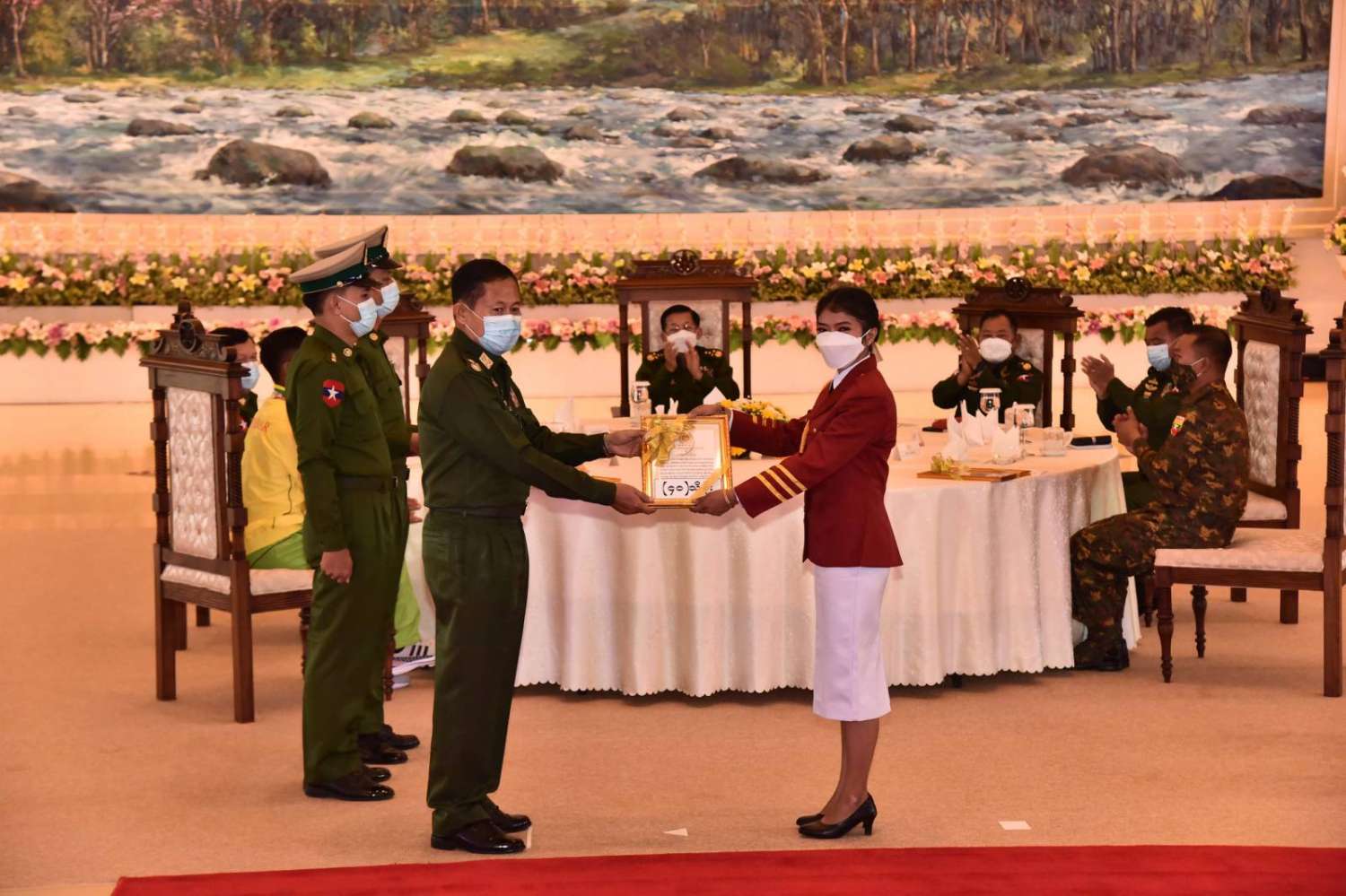 ယင်းနောက် နိုင်ငံတော်စီမံအုပ်ချုပ်ရေးကောင်စီဒုတိယဥက္ကဋ္ဌ ဒုတိယတပ်မတော် ကာကွယ်ရေးဦးစီးချုပ် ကာကွယ်ရေးဦးစီးချုပ် (ကြည်း) က (၁၁) ကြိမ်မြောက်အာဆီယံ မသန်စွမ်းသူများ အားကစားပြိုင်ပွဲတွင် ပြေးခုန်ပစ် (သံလုံးပစ်) (တစ်ဦးချင်းပြိုင်ပွဲ) ၌ ငွေ တံဆိပ်ဆု၊ (လှံတံပစ်) (တစ်ဦးချင်းပြိုင်ပွဲ) ၌ ကြေးတံဆိပ်ဆု၊ သံပြားပစ် (တစ်ဦးချင်း ပြိုင်ပွဲ) ၌ ကြေးတံဆိပ်ဆုတို့ကိုရရှိခဲ့သည့် ဒုတိယတပ်ကြပ် အောင်ထွန်းလင်း၊ ပြေးခုန်ပစ် (လှံတံပစ်) (တစ်ဦးချင်းပြိုင်ပွဲ) ၌ ငွေတံဆိပ်ဆု၊ ပြေးခုန်ပစ် (အမြင့်ခုန်) (တစ်ဦးချင်းပြိုင်ပွဲ) ၌ ကြေးတံဆိပ်ဆုတို့ကို ရရှိခဲ့သည့် ဒုတိယတပ်ကြပ် စိုးသန်း၊ နိုင်ငံတကာတပ်မတော် အားကစားပြိုင်ပွဲ (International Army Games-2022) ရိုးရာယဉ်ကျေးမှုဆိုင်ရာပြိုင်ပွဲ၊ အတီးပြိုင်ပွဲတွင် အသင်းလိုက်ပထမဆုရရှိခဲ့သည့် တပ်ကြပ်အောင်အောင်ထက်နှင့် တပ်သား (အစားခန့်) ပိုင်ကျော် ၊ ရိုးရာယဉ်ကျေးမှုဆိုင်ရာပြိုင်ပွဲ၊ ရုရှားသီချင်းဆို ပြိုင်ပွဲတွင် စုံတွဲပထမဆု ရရှိခဲ့သည့် တပ်ကြပ်ကြီး (အစားခန့်) စိုးမင်းနိုင်၊ ရုရှားသီချင်းဆိုပြိုင်ပွဲ စုံတွဲပထမဆုနှင့် တစ်ဦးချင်း ဒုတိယဆုတို့ကိုရရှိခဲ့သည့် တပ်ကြပ်ကြီး (အစားခန့်) ထူးဣန္ဒာကျော် တို့ကို တပ်မတော်ကာကွယ်ရေးဦးစီးချုပ်၏ ဂုဏ်ပြုမှတ်တမ်းလွှာနှင့် ဂုဏ်ပြုဆုငွေများကို ပေးအပ်ချီးမြှင့်သည်။