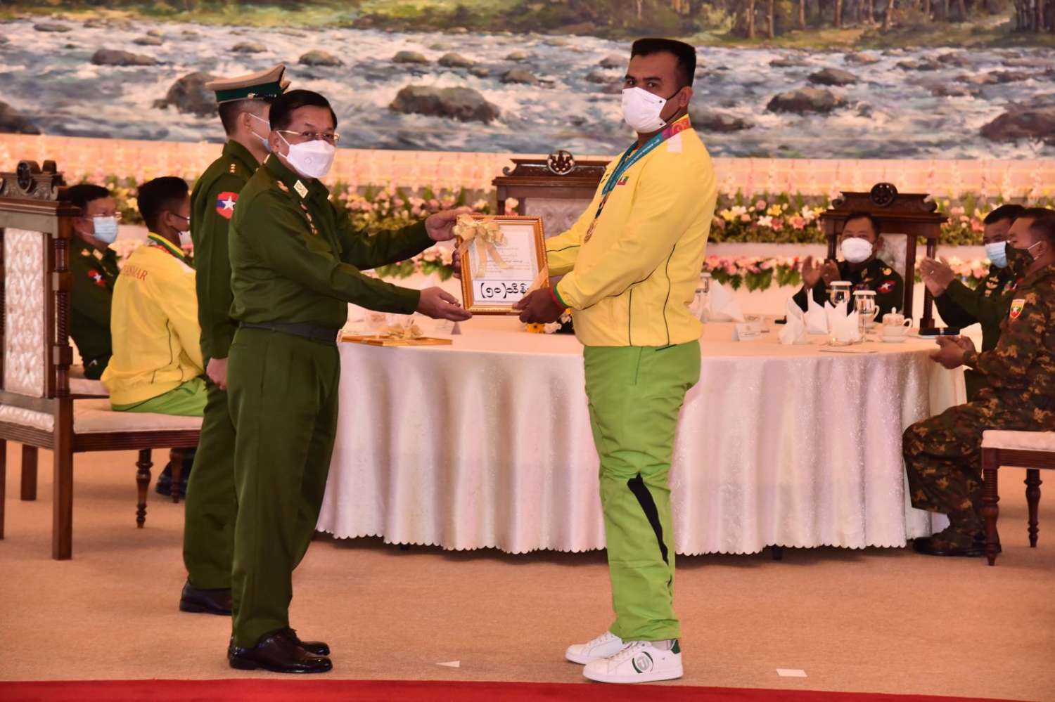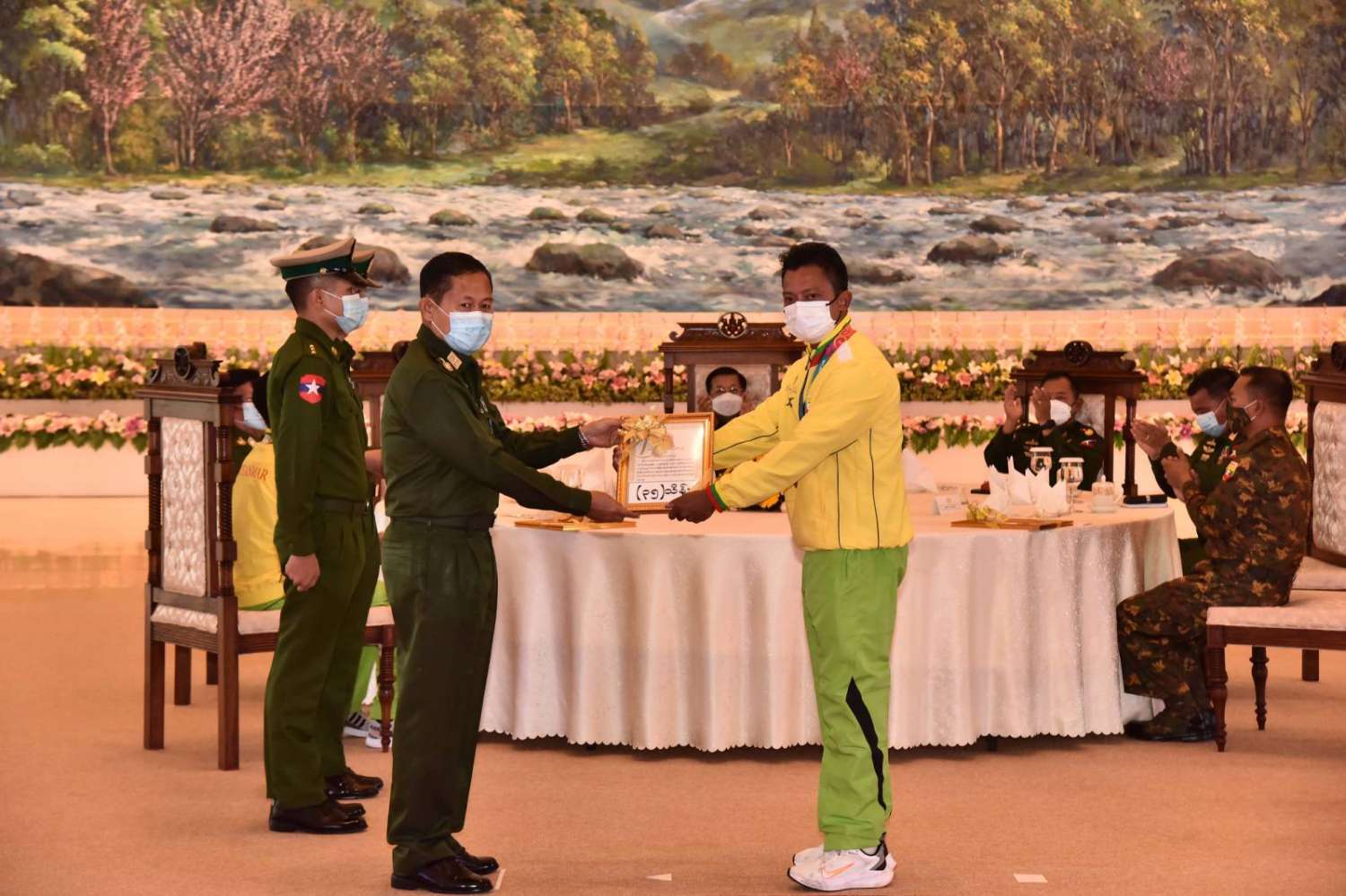 ဆက်လက်ပြီး ညှိနှိုင်းကွပ်ကဲရေးမှူး (ကြည်း၊ ရေ၊ လေ) ဗိုလ်ချုပ်ကြီး မောင်မောင်အေး၊ ကာကွယ်ရေးဦးစီးချုပ် (ရေ) ဗိုလ်ချုပ်ကြီး မိုးအောင်၊ စစ်ရေးချုပ် ဒုတိယဗိုလ်ချုပ်ကြီး မျိုးဇော်သိန်းနှင့် စစ်ထောက်ချုပ် ဒုတိယဗိုလ်ချုပ်ကြီး ကျော်စွာလင်းတို့က (၁၁) ကြိမ်မြောက် အာဆီယံမသန်စွမ်းသူများ အားကစားပြိုင်ပွဲ၊ နိုင်ငံတကာတပ်မတော်အားကစားပြိုင်ပွဲ (International Army Games-2022) နှင့် နိုင်ငံတကာဗိုလ်လောင်းများအားကစားပြိုင်ပွဲ (3rd World Cadet Games-2022) တို့တွင် ဆုရရှိအောင်စွမ်းဆောင်ခဲ့ကြသည့် တပ်မတော်သား အားကစားသမားများနှင့် ဆုရရှိအောင်နည်းပြပေးခဲ့ကြသည့် နည်းပြများအား တပ်မတော်ကာကွယ်ရေးဦးစီးချုပ်၏ ဂုဏ်ပြုမှတ်တမ်းလွှာနှင့် ဂုဏ်ပြုဆုငွေများကို အသီးသီး ပေးအပ်ချီးမြှင့်ကြသည်။
