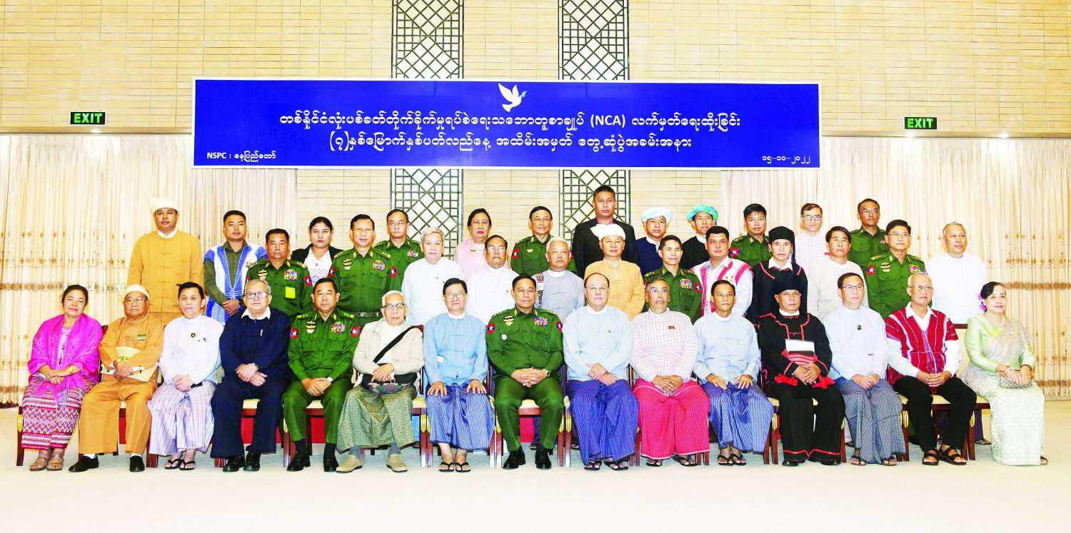 တစ်နိုင်ငံလုံးပစ်ခတ်တိုက်ခိုက်မှု ရပ်စဲရေးသဘောတူ စာချုပ်(NCA)လက်မှတ်ရေးထိုးခြင်း(၇)နှစ်မြောက် နှစ်ပတ်လည်နေ့ တွေ့ဆုံပွဲအခမ်းအနားကို ယနေ့နံနက်ပိုင်းတွင် နေပြည်တော်ရှိ အမျိုးသားစည်းလုံးညီညွတ်ရေးနှင့် ငြိမ်းချမ်းရေးဖော်ဆောင်မှုဗဟိုဌာန၌ ကျင်းပပြုလုပ်ရာ နိုင်ငံတော်စီမံအုပ်ချုပ်ရေးကောင်စီဥက္ကဋ္ဌ နိုင်ငံတော်ဝန်ကြီးချုပ် အမျိုးသားစည်းလုံးညီညွတ်ရေးနှင့် ငြိမ်းချမ်းရေးဖော်ဆောင်မှုဗဟိုကော်မတီဥက္ကဋ္ဌ၊ တပ်မတော်ကာကွယ်ရေးဦးစီးချုပ် ဗိုလ်ချုပ်မှူးကြီး မင်းအောင်လှိုင်က Video Message ပေးပို့၍ မိန့်ခွန်းပြောကြားသည်။