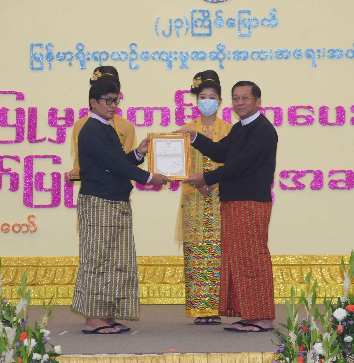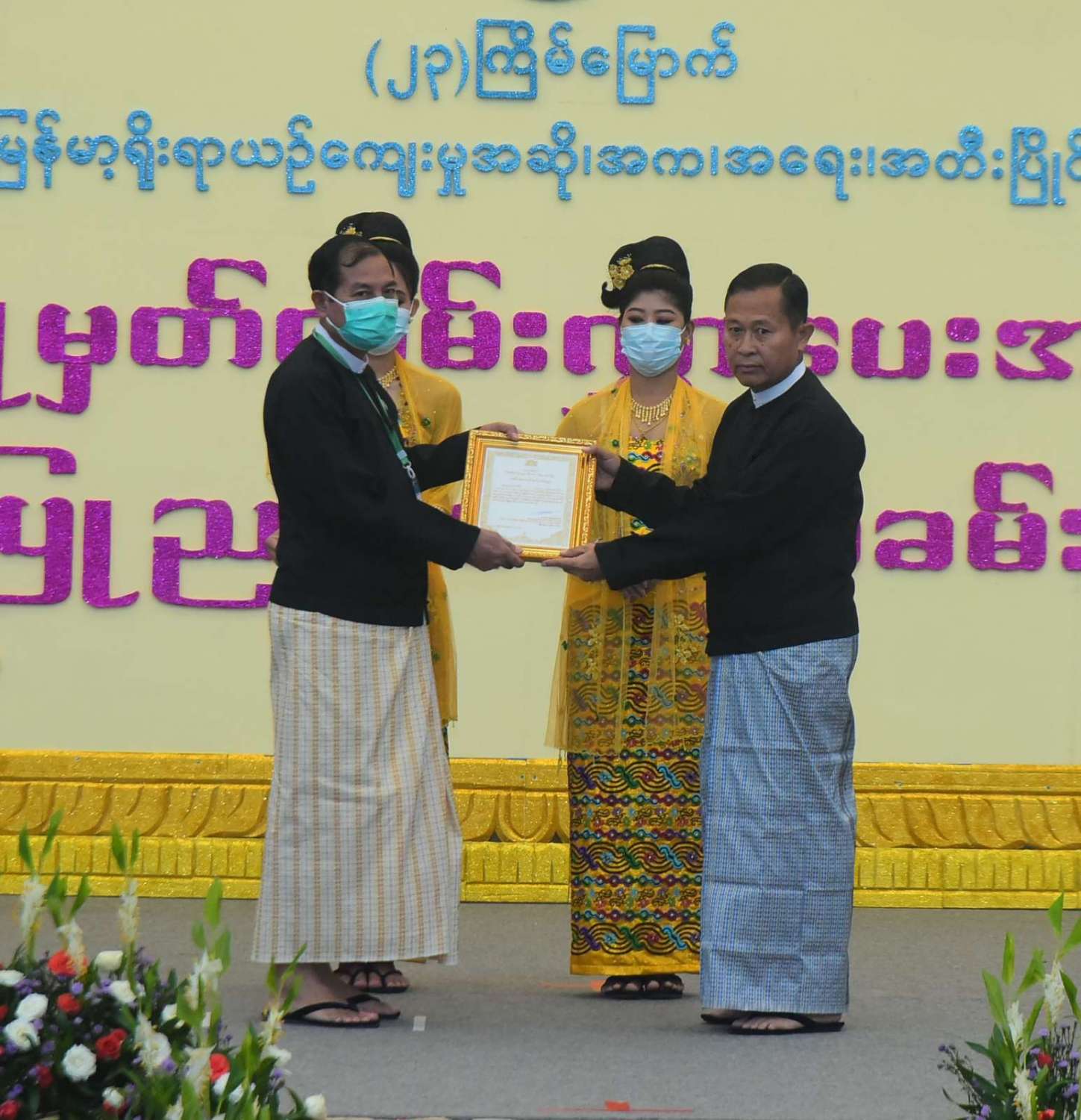 ယင်းနောက် နိုင်ငံတော်စီမံအုပ်ချုပ်ရေးကောင်စီဥက္ကဋ္ဌ နိုင်ငံတော်ဝန်ကြီးချုပ်က အဆိုအကဲဖြတ်လုပ်ငန်းအဖွဲ့ကိုယ်စား ဥက္ကဋ္ဌဒေါ်သင်းသင်းမြတ်၊ အကအကဲဖြတ်လုပ်ငန်းအဖွဲ့ကိုယ်စား ဥက္ကဋ္ဌဦးအောင်တင်ဝင်း၊ အရေးအကဲဖြတ်လုပ်ငန်းအဖွဲ့ကိုယ်စား အတွင်းရေးမှူး ဦးမင်းယုနှင့် အတီးအကဲဖြတ်လုပ်ငန်းအဖွဲ့ကိုယ်စား ဥက္ကဋ္ဌဦးအောင်ကိန်းတို့ကိုလည်းကောင်း၊ ပြိုင်ပွဲကျင်းပရေး ဦးစီးကော်မတီနာယက ကောင်စီဒုတိယဥက္ကဋ္ဌ ဒုတိယဝန်ကြီးချုပ် ဒုတိယဗိုလ်ချုပ်မှူးကြီးစိုးဝင်းက တိုင်းဒေသကြီးနှင့် ပြည်နယ်များမှ အုပ်ချုပ်သူများနှင့် အခမ်းအနားမှူးများကိုလည်းကောင်း ဂုဏ်ပြုမှတ်တမ်းလွှာများ ပေးအပ်ချီးမြှင့်ကြသည်။