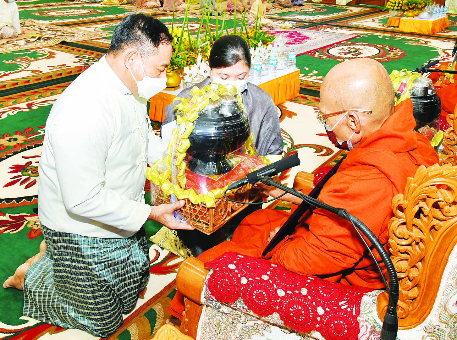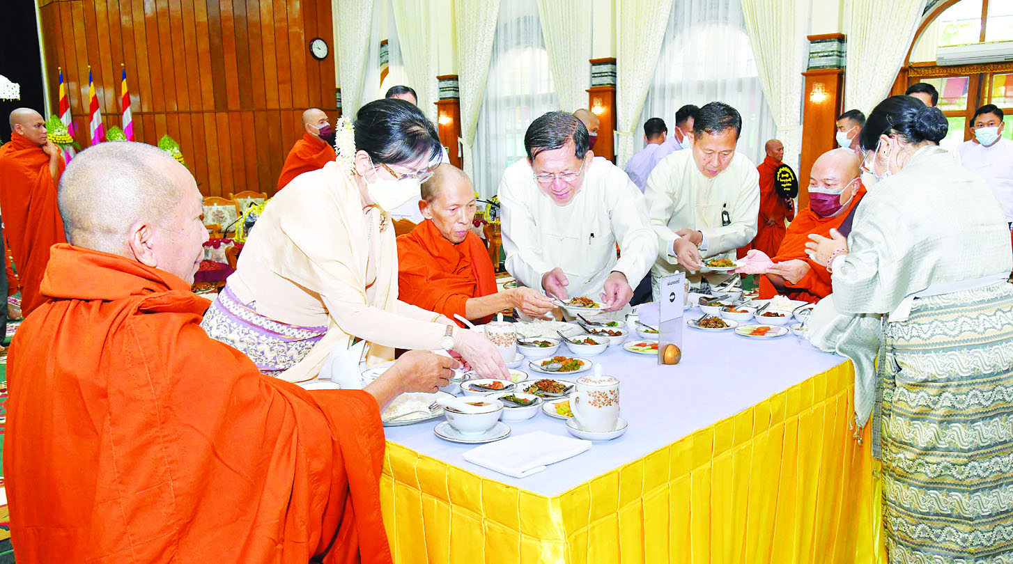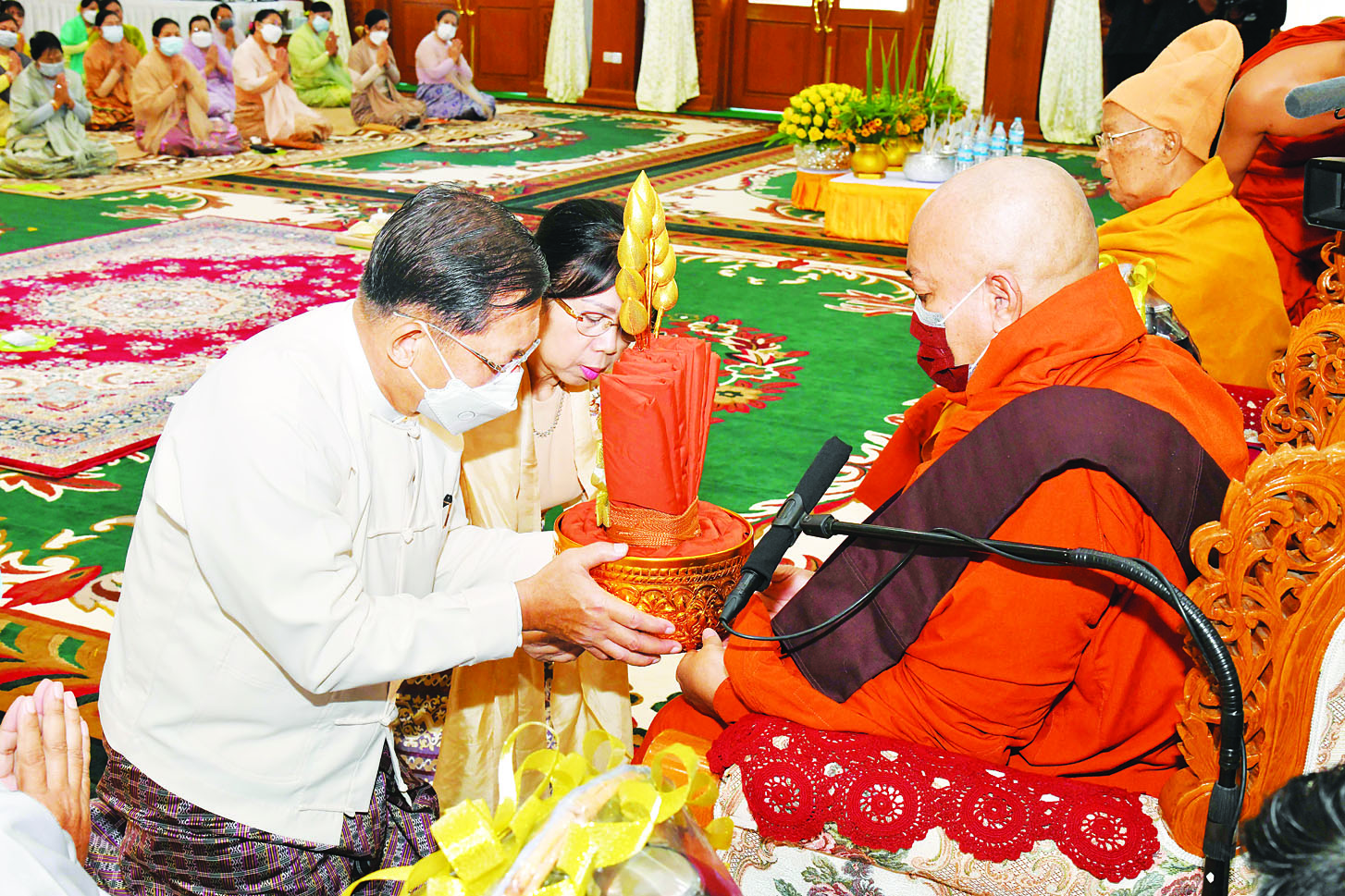 ဦးစွာ နိုင်ငံတော်စီမံအုပ်ချုပ်ရေးကောင်စီဥက္ကဋ္ဌ တပ်မတော်ကာကွယ်ရေးဦးစီးချုပ်၊ ဇနီးနှင့် ဧည့်ပရိသတ်များသည် ဘုန်းတော်ကြီးကျောင်းအသီးသီးသို့ လှူဒါန်းရန် ခင်းကျင်းပြင်ဆင်ထားသည့် ကထိန်လျာသင်္ကန်း၊ လှူဖွယ်ပစ္စည်းများနှင့် ပဒေသာပင်များအား လှည့်လည်ကြည့်ရှုကြသည်။ ထို့နောက် နိုင်ငံတော်စီမံအုပ်ချုပ်ရေးကောင်စီဥက္ကဋ္ဌ တပ်မတော်ကာကွယ်ရေးဦးစီးချုပ်နှင့် ဇနီးတို့သည် အနော်ရထာခန်းမအတွင်းရှိ ဗုဒ္ဓရုပ်ပွားတော်မြတ်အား ဖူးမြော်ကြည်ညို၍ မြသပိတ်ဆွမ်းတော်နှင့် ပန်း၊ သောက်တော်ရေချမ်း၊ ဆီမီး၊ သစ်သီးတို့ကို ဆက်ကပ်လှူဒါန်းသည်။