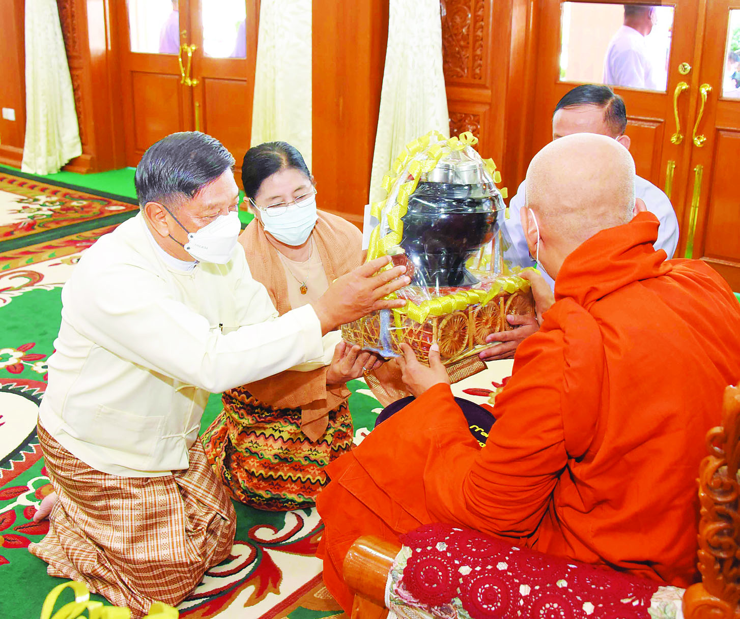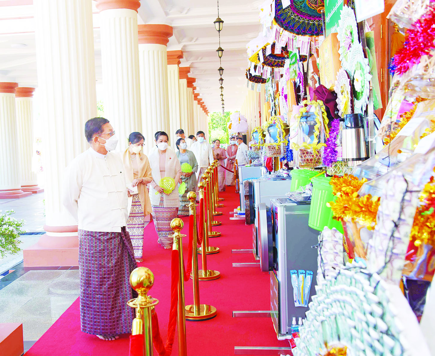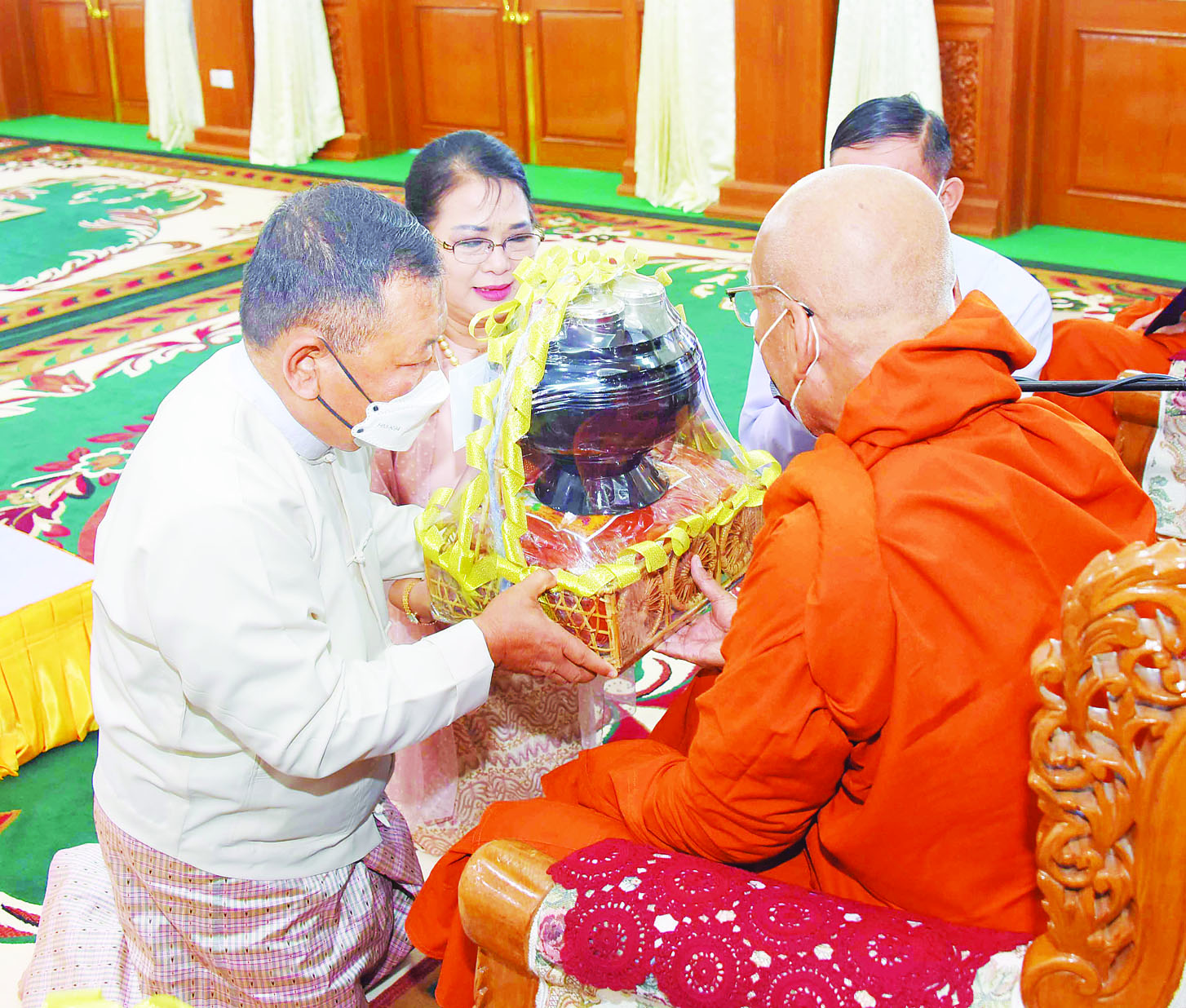 ဦးစွာ နိုင်ငံတော်စီမံအုပ်ချုပ်ရေးကောင်စီဥက္ကဋ္ဌ တပ်မတော်ကာကွယ်ရေးဦးစီးချုပ်၊ ဇနီးနှင့် ဧည့်ပရိသတ်များသည် ဘုန်းတော်ကြီးကျောင်းအသီးသီးသို့ လှူဒါန်းရန် ခင်းကျင်းပြင်ဆင်ထားသည့် ကထိန်လျာသင်္ကန်း၊ လှူဖွယ်ပစ္စည်းများနှင့် ပဒေသာပင်များအား လှည့်လည်ကြည့်ရှုကြသည်။ ထို့နောက် နိုင်ငံတော်စီမံအုပ်ချုပ်ရေးကောင်စီဥက္ကဋ္ဌ တပ်မတော်ကာကွယ်ရေးဦးစီးချုပ်နှင့် ဇနီးတို့သည် အနော်ရထာခန်းမအတွင်းရှိ ဗုဒ္ဓရုပ်ပွားတော်မြတ်အား ဖူးမြော်ကြည်ညို၍ မြသပိတ်ဆွမ်းတော်နှင့် ပန်း၊ သောက်တော်ရေချမ်း၊ ဆီမီး၊ သစ်သီးတို့ကို ဆက်ကပ်လှူဒါန်းသည်။