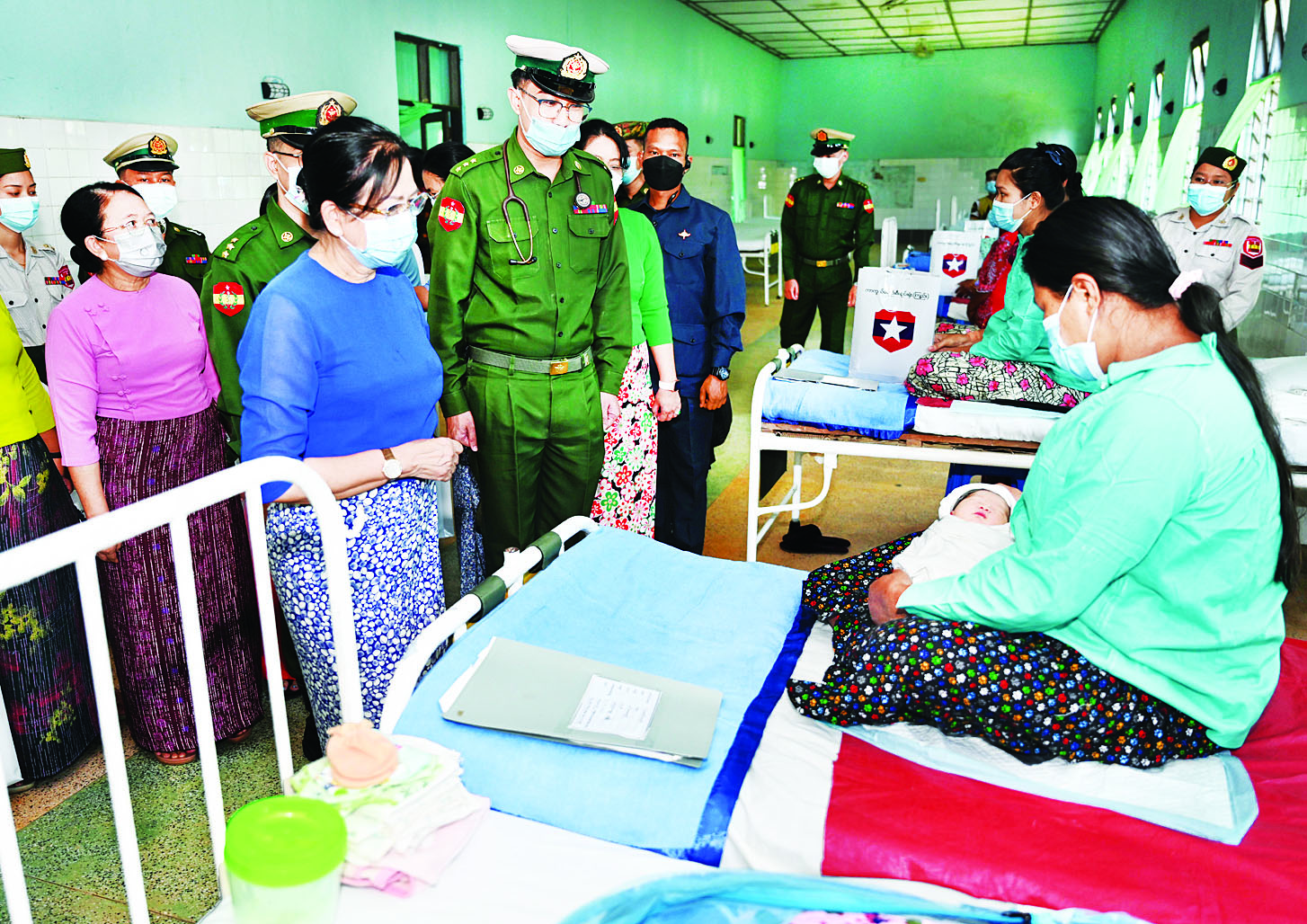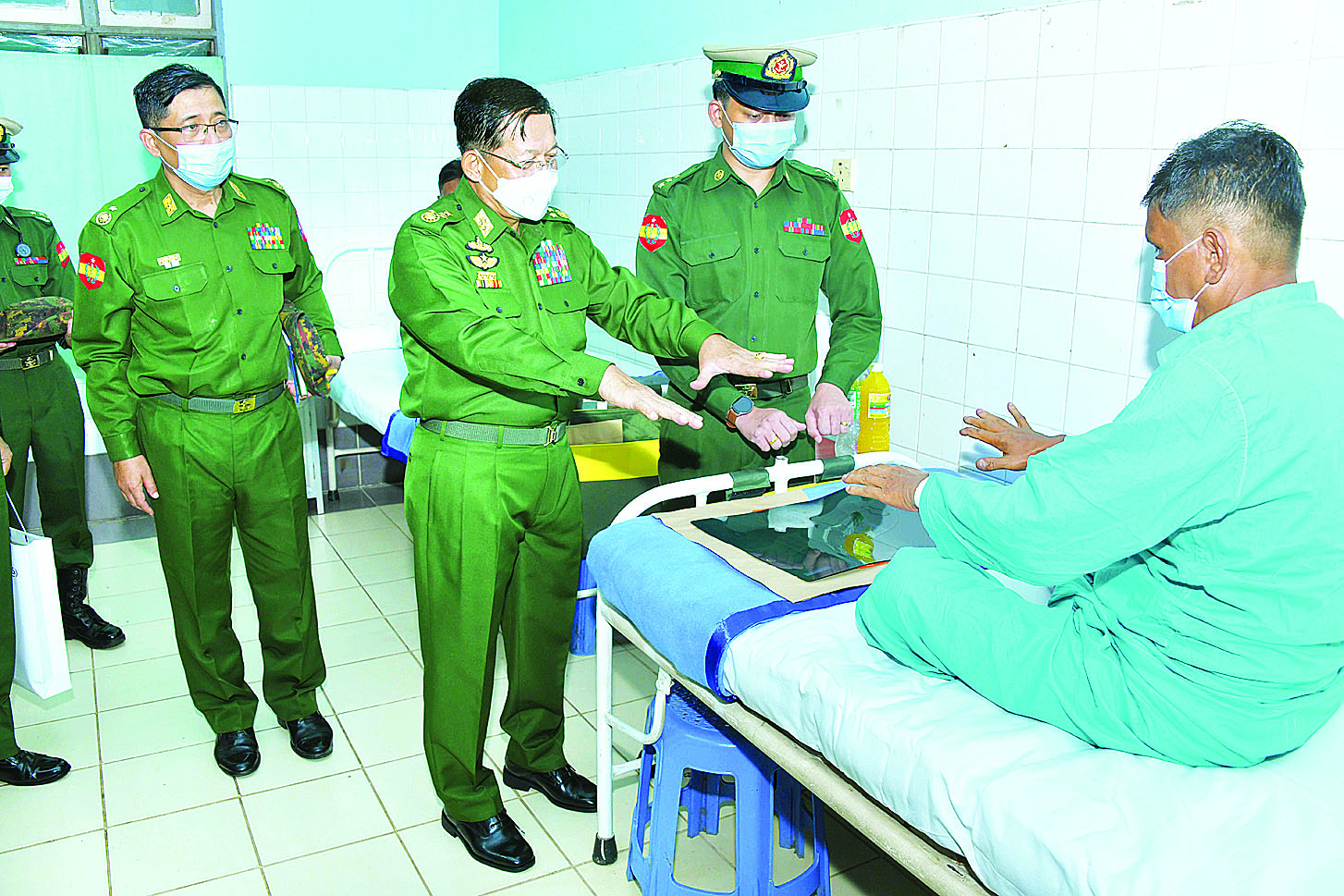ထို့နောက် နိုင်ငံတော်စီမံအုပ်ချုပ်ရေးကောင်စီဥက္ကဋ္ဌ တပ်မတော်ကာကွယ်ရေးဦးစီးချုပ်၊ ဇနီးနှင့် အဖွဲ့ဝင်များသည် ထားဝယ်မြို့ရှိ နယ်မြေခံတပ်မတော်ဆေးရုံသို့သွားရောက်၍ ဆေးရုံတက်ရောက်ကုသမှုခံယူလျက်ရှိသည့် အရာရှိ၊ စစ်သည်၊ မိသားစုဝင်များ၏ ကျန်းမာရေးအခြေအနေများကို တစ်ဦးချင်း ရင်းရင်းနှီးနှီးမေးမြန်းအားပေးစကားပြောကြားကာ စားသောက်ဖွယ်ရာပစ္စည်းများ ပေးအပ်သည်။