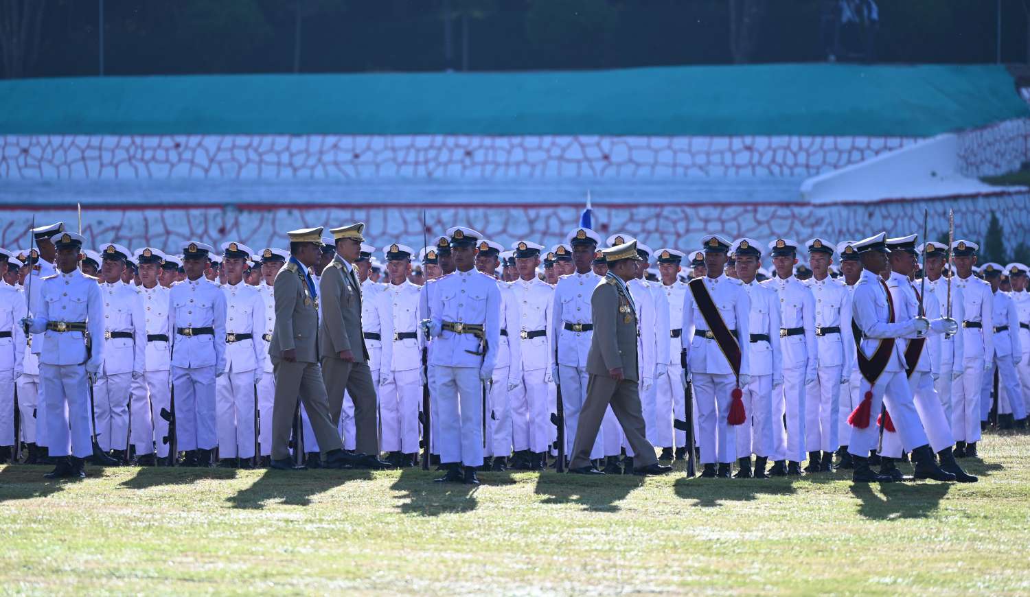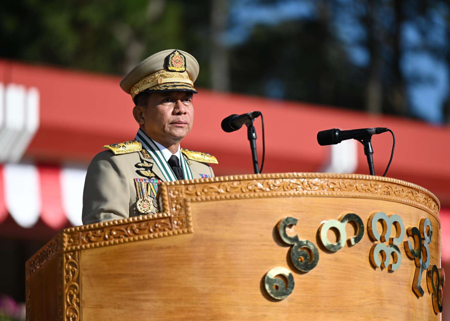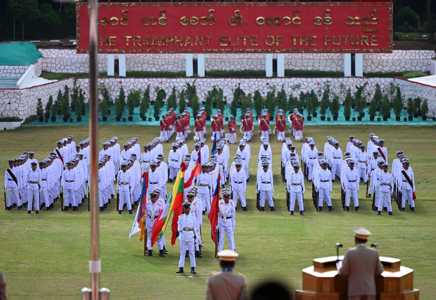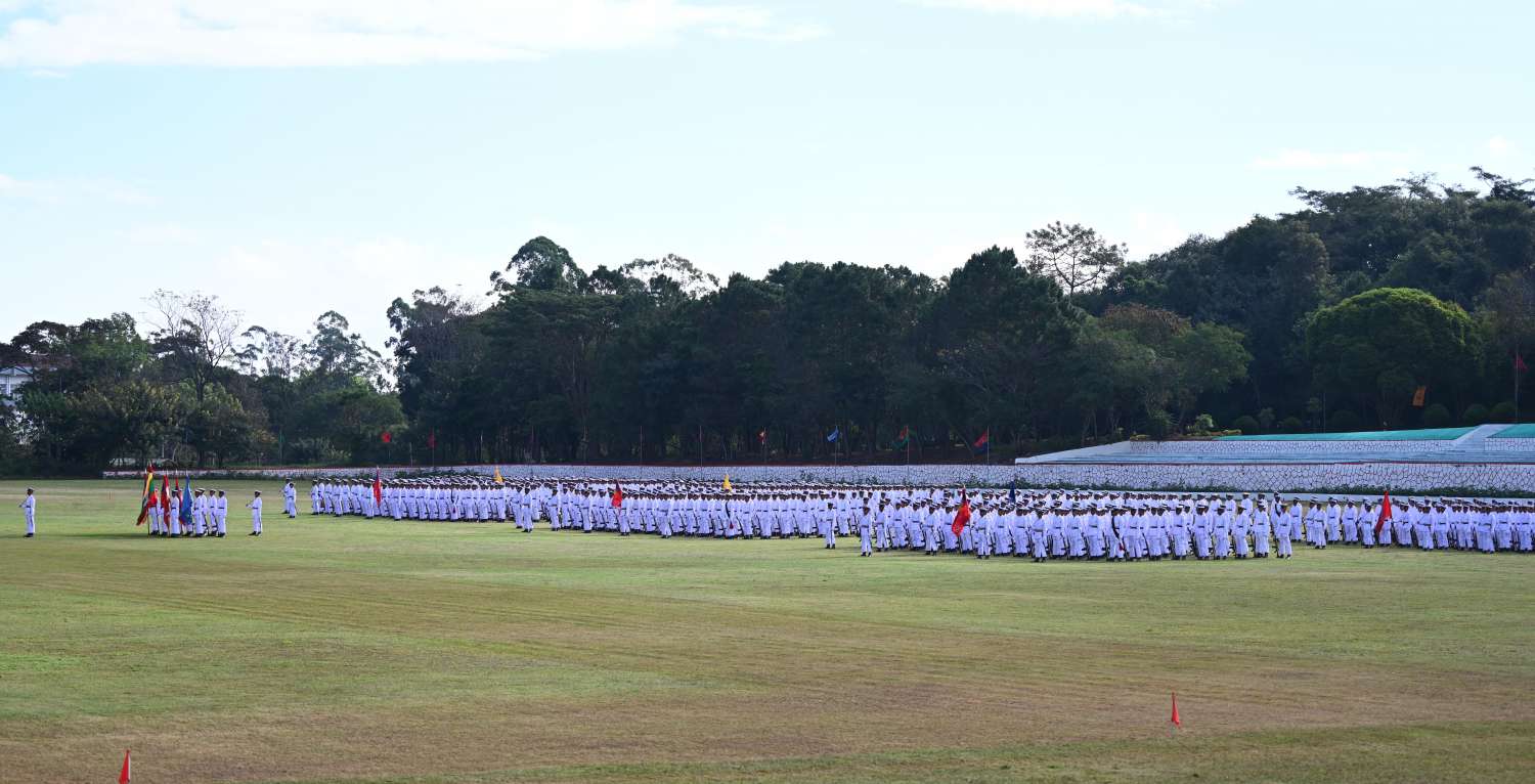 စစ်တက္ကသိုလ် ဗိုလ်လောင်းသင်တန်းအမှတ်စဉ် (၆၄) သင်တန်းဆင်းဂုဏ်ပြု စစ်ရေးပြအခမ်းအနားကို ယနေ့နံနက်ပိုင်းတွင် ပြင်ဦးလွင်မြို့၊ စစ်တက္ကသိုလ် စစ်ရေးပြကွင်း၌ ကျင်းပပြုလုပ်ရာ နိုင်ငံတော်စီမံအုပ်ချုပ်ရေးကောင်စီဥက္ကဋ္ဌ တပ်မတော်ကာကွယ်ရေးဦးစီးချုပ် ဗိုလ်ချုပ်မှူးကြီး မဟာသရေစည်သူ မင်းအောင်လှိုင် တက်ရောက်မိန့်ခွန်း ပြောကြားသည်။