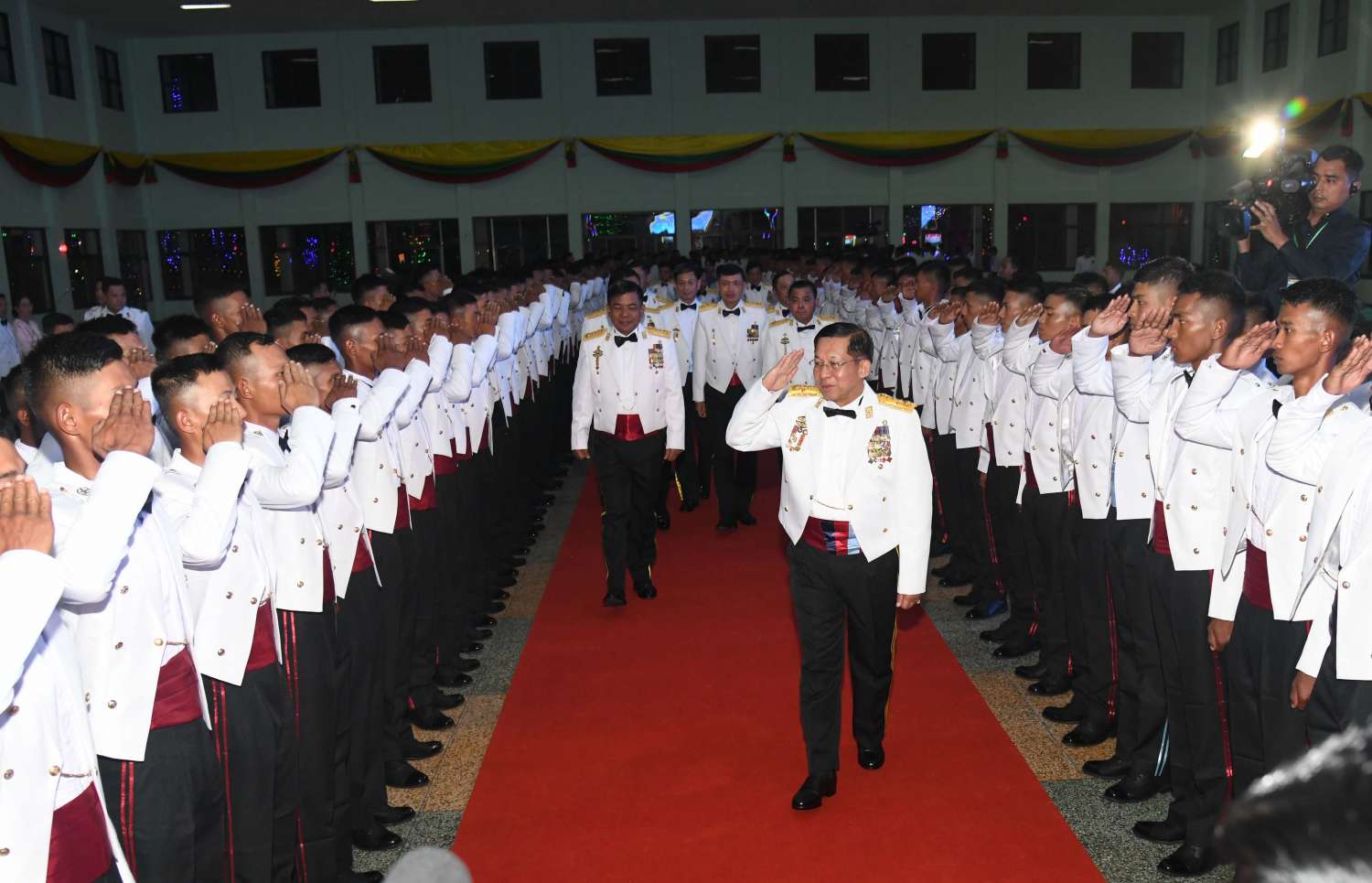 စစ်တက္ကသိုလ် ဗိုလ်လောင်းသင်တန်းအမှတ်စဉ် (၆၄) သင်တန်းဆင်းဂုဏ်ပြု ညစာစားပွဲ အခမ်းအနားကို ယနေ့ညနေပိုင်းတွင် ပြင်ဦးလွင်မြို့၊ စစ်တက္ကသိုလ်၊ အနော်ရထာတပ်ရင်း ဗိုလ်လောင်းစားရိပ်သာ၌ ကျင်းပပြုလုပ်ရာ နိုင်ငံတော်စီမံအုပ်ချုပ်ရေးကောင်စီဥက္ကဋ္ဌ တပ်မတော်ကာကွယ်ရေးဦးစီးချုပ် ဗိုလ်ချုပ်မှူးကြီး မင်းအောင်လှိုင် တက်ရောက်ချီးမြှင့်သည်။