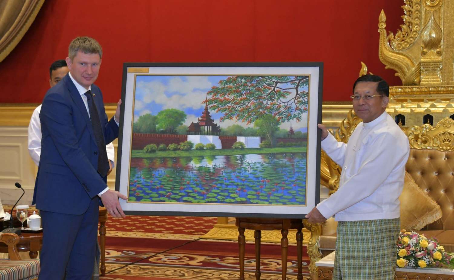 နိုင်ငံတော်စီမံအုပ်ချုပ်ရေးကောင်စီဥက္ကဋ္ဌ နိုင်ငံတော်ဝန်ကြီးချုပ် ဗိုလ်ချုပ်မှူးကြီး မင်းအောင်လှိုင်ထံ ရုရှားဖက်ဒရေးရှင်းနိုင်ငံ၊ စီးပွားရေးဖွံ့ဖြိုးတိုးတက်မှုဝန်ကြီးဌာနဝန်ကြီး H.E. Mr. Maxim RESHETNIKOV က ယနေ့နေ့လယ်ပိုင်းတွင် နေပြည်တော်ရှိ နိုင်ငံတော်စီမံအုပ်ချုပ်ရေးကောင်စီဥက္ကဋ္ဌရုံး သံတမန်ဆောင်ဧည့်ခန်းမ၌ လာရောက် ဂါရဝပြုတွေ့ဆုံသည်။