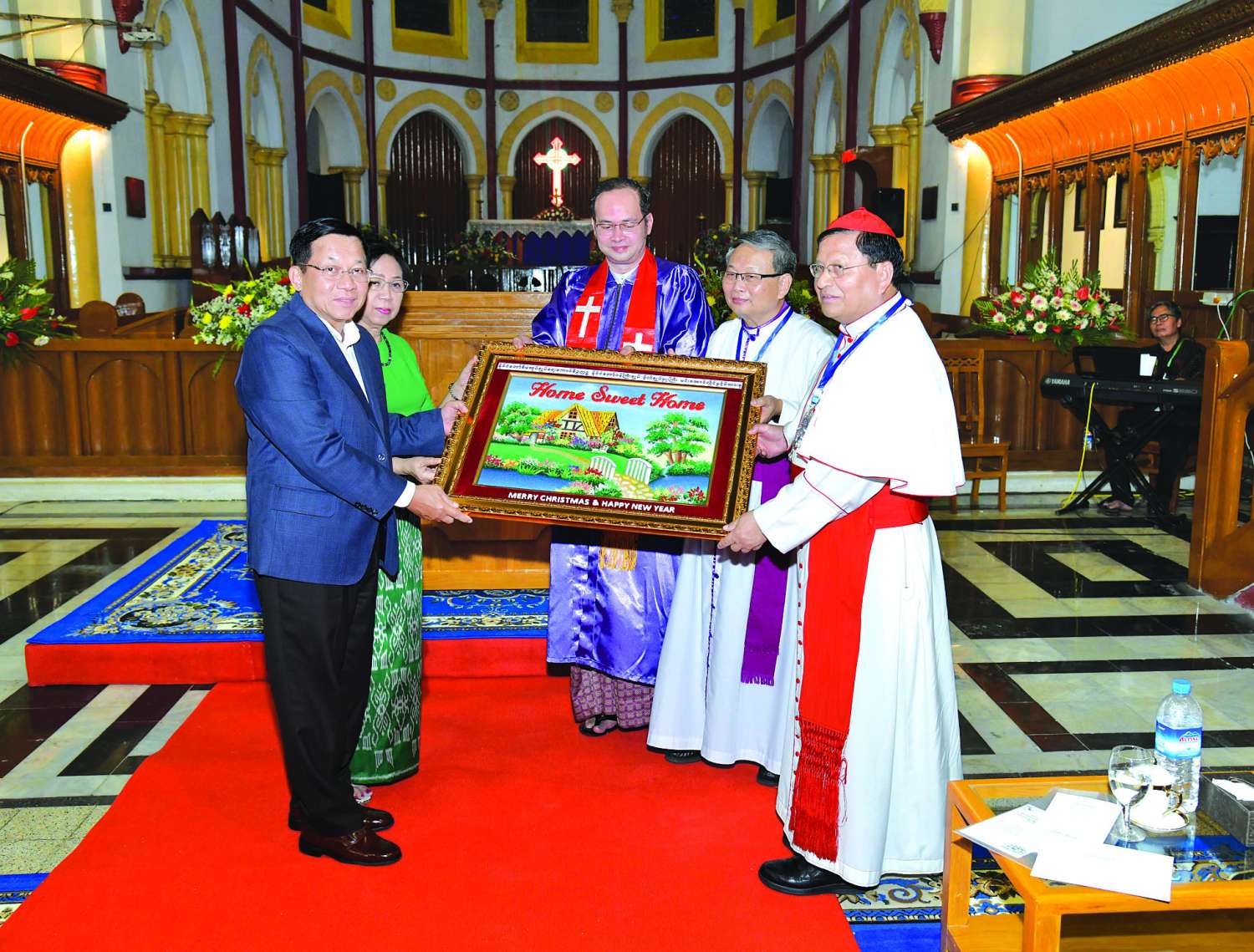 ထို့နောက် နိုင်ငံတော်စီမံအုပ်ချုပ်ရေးကောင်စီဥက္ကဋ္ဌ နိုင်ငံတော်ဝန်ကြီးချုပ်နှင့် ဇနီးတို့အားဂိုဏ်းချုပ်ဆရာတော်ကြီး ကာဒီနယ်ချားလ်စ်ဘို၊ သာသနာပိုင်ချုပ်ကြီး စတီဗင်သန်းမြင့်ဦးနှင့် သိက္ခာတော်ရဆရာ ဒေါက်တာအေးမင်းတို့က ခရစ္စမတ်အမှတ်တ ရမေတ္တာလက်ဆောင်ပန်းချီကားကိုပေးအပ်ရာ နိုင်ငံတော်စီမံအုပ်ချုပ်ရေးကောင်စီဥက္ကဋ္ဌ နိုင်ငံတော်ဝန်ကြီးချုပ်နှင့်ဇနီးတို့က ခရစ္စမတ်အထိမ်းအမှတ်လက်ဆောင်နှင့်အလှူငွေများ ပြန်လည်ပေးအပ်သည်။