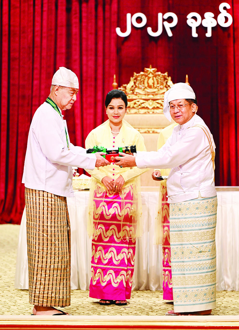 ထို့နောက် နိုင်ငံတော်စီမံအုပ်ချုပ်ရေးကောင်စီဥက္ကဋ္ဌ နိုင်ငံတော်ဝန်ကြီးချုပ် ဗိုလ်ချုပ်မှူးကြီး သတိုးမဟာသရေစည်သူ၊ သတိုးသီရိသုဓမ္မ မင်းအောင်လှိုင်က ဂုဏ်ထူးဆောင်ဘွဲ့များချီးမြှင့်ပေးအပ်ရာ အဂ္ဂမဟာသီရိသုဓမ္မဘွဲ့နှင့် အဂ္ဂမဟာသရေစည်သူဘွဲ့ရရှိကြသည့် နိုင်ငံတော်ဝန်ကြီးချုပ်(ငြိမ်း)ဦးနု(ကိုယ်စား)သမီး ဒေါ်သန်းသန်းနုကိုလည်းကောင်း၊ နိုင်ငံတော်သမ္မတ(ငြိမ်း) ဦးစန်းယု (ကိုယ်စား)သမီး ဒေါ်လဲ့လဲ့ယုကိုလည်းကောင်း၊ နိုင်ငံတော်ဝန်ကြီးချုပ်(ငြိမ်း) ဗိုလ်ချုပ်မှူးကြီး စောမောင်(ကိုယ်စား)သား ဦးသီဟစောကိုလည်းကောင်း ဂုဏ်ထူးဆောင်ဘွဲ့များပေးအပ်ချီးမြှင့်သည်။