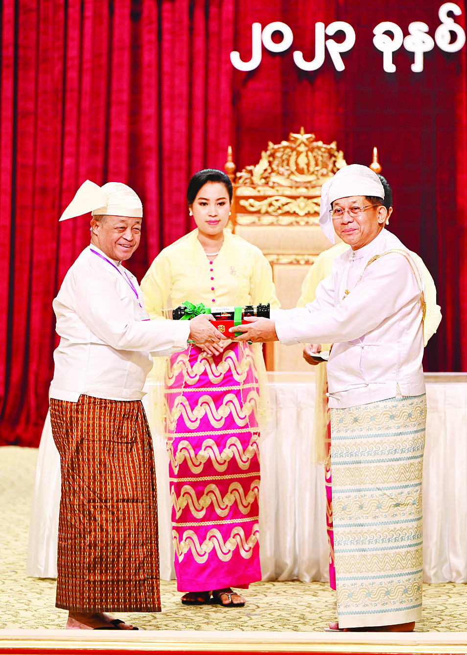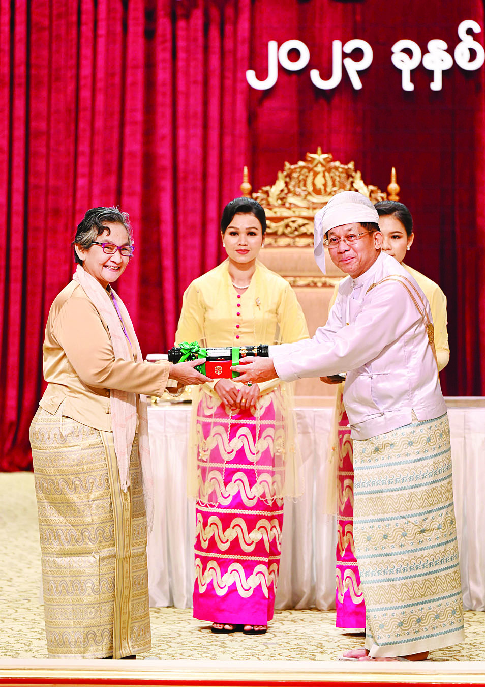 နိုင်ငံတော်စီမံအုပ်ချုပ်ရေးကောင်စီဥက္ကဋ္ဌ နိုင်ငံတော်ဝန်ကြီးချုပ် ဗိုလ်ချုပ်မှူးကြီး သတိုးမဟာသရေစည်သူ၊ သတိုးသီရိသုဓမ္မ မင်းအောင်လှိုင်နှင့် ဇနီး ဒေါ်ကြူကြူလှ ၂၀၂၃ ခုနှစ် (၇၅)နှစ်မြောက် စိန်ရတုလွတ်လပ်ရေးနေ့အထိမ်းအမှတ် ဂုဏ်ထူးဆောင်ဘွဲ့များ ချီးမြှင့်အပ်နှင်းခြင်းအခမ်းအနားသို့ တက်ရောက်ချီးမြှင့်