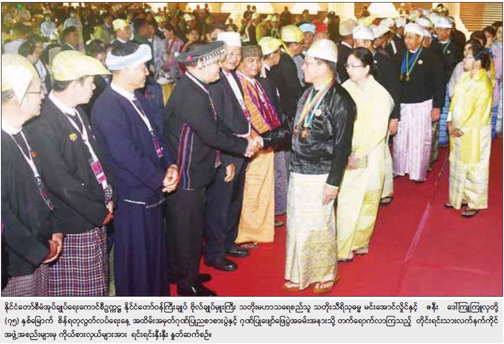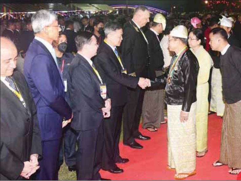 ထို့နောက် နိုင်ငံတော်စီမံအုပ်ချုပ်ရေးကောင်စီဥက္ကဋ္ဌ နိုင်ငံတော်ဝန်ကြီးချုပ် ဗိုလ်ချုပ်မှူးကြီး သတိုးမဟာသရေစည်သူ သတိုးသီရိသုဓမ္မ မင်းအောင်လှိုင်နှင့်ဇနီး ဒေါ်ကြူကြူလှတို့သည် ညစာစားပွဲအခမ်းအနား ကျင်းပရာနေရာသို့ ရောက်ရှိကြပြီး နိုင်ငံတော်စီမံအုပ်ချုပ်ရေးကောင်စီ ဒုတိယဥက္ကဋ္ဌ ဒုတိယဝန်ကြီးချုပ်နှင့် ဇနီးတို့နှင့်အတူ နိုင်ငံရေးပါတီများမှ ဥက္ကဋ္ဌများနှင့် ကိုယ်စားလှယ်များ၊ နိုင်ငံခြားသံရုံးများမှ သံအမတ်ကြီးများနှင့် သံရုံးတာဝန်ခံများ၊ ဂုဏ်ထူးဆောင် ကောင်စစ်ဝန်များနှင့် အထူးဖိတ်ကြားထားသည့် ဧည့်သည်တော်များကို ရင်းရင်းနှီးနှီး နှုတ်ဆက်သည်။