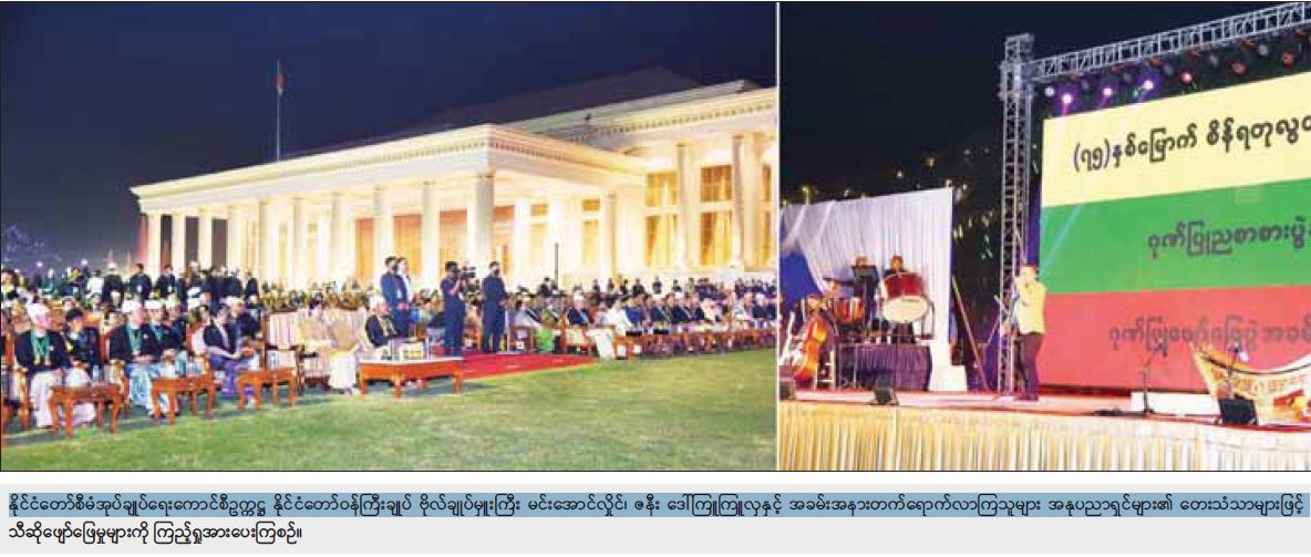 ပြည်ထောင်စုသမ္မတ မြန်မာနိုင်ငံတော်၊ နိုင်ငံတော်စီမံအုပ်ချုပ်ရေးကောင်စီဥက္ကဋ္ဌ နိုင်ငံတော်ဝန်ကြီးချုပ် ဗိုလ်ချုပ်မှူးကြီး သတိုးမဟာ သရေစည်သူ သတိုးသီရိသုဓမ္မ မင်းအောင်လှိုင်နှင့်ဇနီး ဒေါ်ကြူကြူလှတို့က တည်ခင်းဧည့်ခံသည့် (၇၅) နှစ်မြောက် စိန်ရတုလွတ်လပ်ရေးနေ့ အထိမ်းအမှတ် ဂုဏ်ပြုညစာစားပွဲနှင့် ဂုဏ်ပြုဖျော်ဖြေပွဲအခမ်းအနားကို ယနေ့ညနေပိုင်းတွင် နေပြည်တော်ရှိ နိုင်ငံတော်စီမံအုပ်ချုပ်ရေးကောင်စီဥက္ကဋ္ဌရုံး ဥပစာမြက်ခင်းပြင်၌ ကျင်းပသည်။
