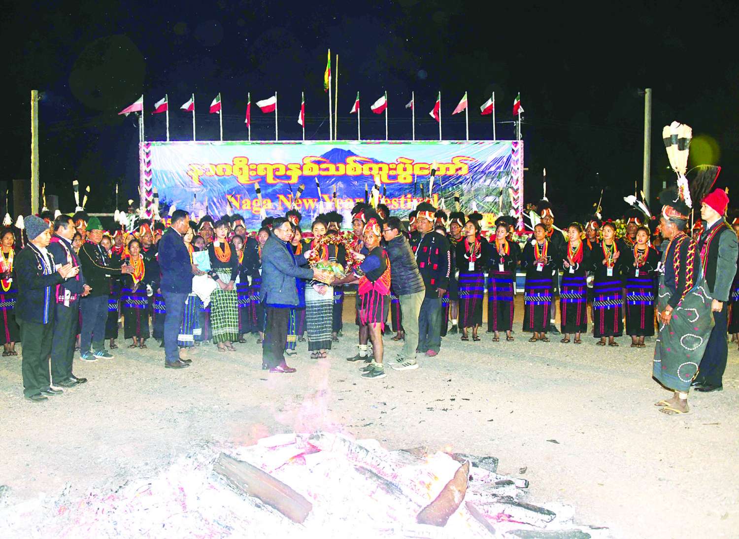 ထို့နောက် နိုင်ငံတော်စီမံအုပ်ချုပ်ရေးကောင်စီဥက္ကဋ္ဌ နိုင်ငံတော်ဝန်ကြီးချုပ်နှင့် အဖွဲ့ဝင်များသည် ညပိုင်းတွင် နာဂရိုးရာယဉ်ကျေးမှုမီးပုံပွဲသို့ တက်ရောက်ပြီး ဒေသခံတိုင်းရင်းသားများနှင့် အတူတကွပါဝင်ဆင်နွှဲသည်။ ဦးစွာနိုင်ငံတော်စီမံအုပ်ချုပ်ရေး ကောင်စီဥက္ကဋ္ဌ နိုင်ငံတော်ဝန်ကြီးချုပ်နှင့် လဟယ်မြို့နယ်၊ နာဂရိုးရာယဉ်ကျေးမှု ကော်မတီဥက္ကဋ္ဌ တို့သည် နာဂရိုးရာယဉ်ကျေးမှုမီးပုံပွဲကို မီးထွန်းညှိဖွင့်လှစ်ပေးသည်။