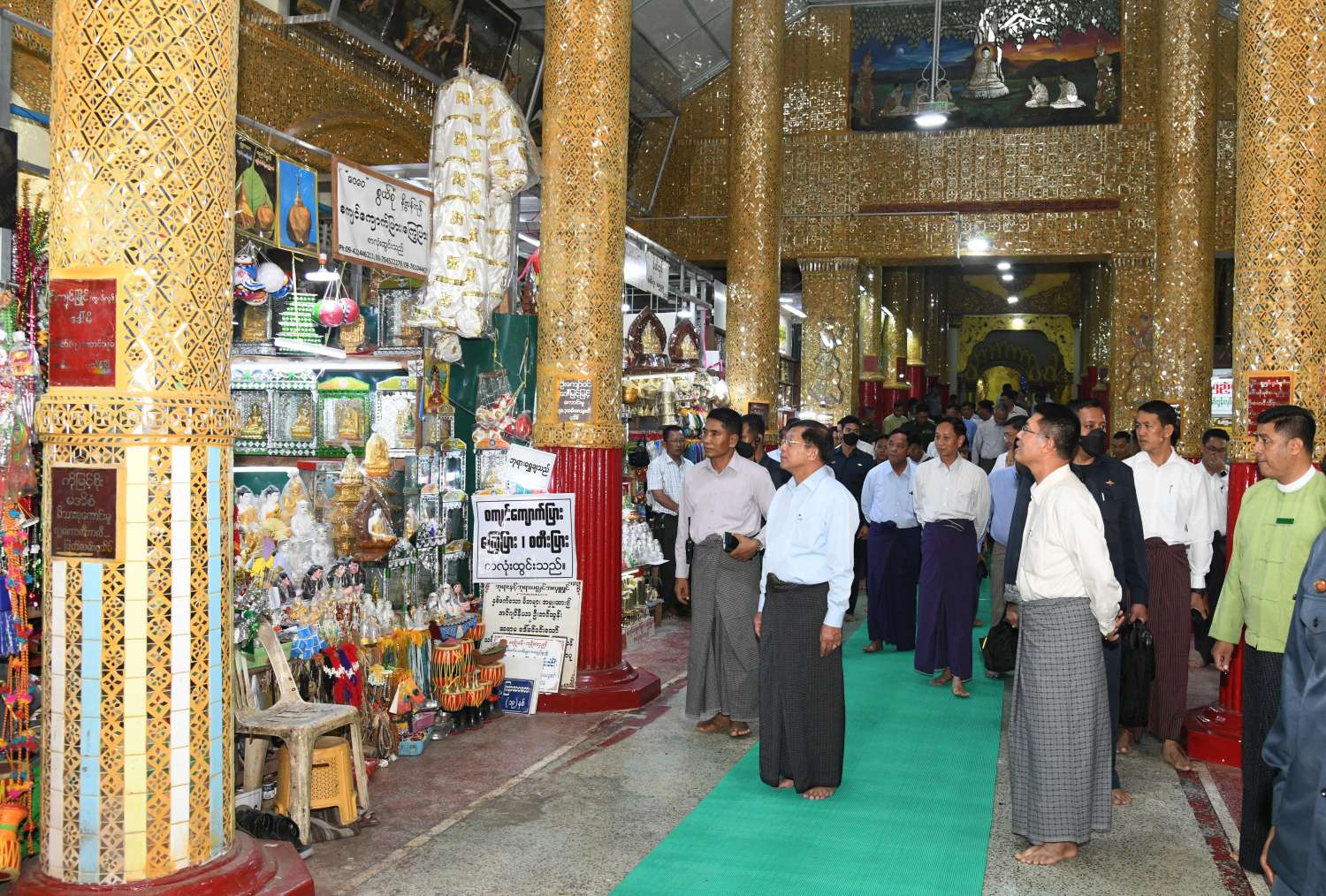 နိုင်ငံတော်စီမံအုပ်ချုပ်ရေးကောင်စီဥက္ကဋ္ဌ နိုင်ငံတော်ဝန်ကြီးချုပ် ဗိုလ်ချုပ်မှူးကြီးမင်းအောင်လှိုင်သည် ယနေ့ညပိုင်းတွင် ခရီးစဉ်တွင်လိုက်ပါလာသည့် အဖွဲ့ဝင်များ၊ ဧရာဝတီတိုင်းဒေသကြီးဝန်ကြီးချုပ် ဦးတင်မောင်ဝင်း၊ အနောက်တောင်တိုင်း စစ်ဌာနချုပ်တိုင်းမှူး ဗိုလ်မှူးချုပ်ကြည်ခိုင်နှင့် တာဝန်ရှိသူများလိုက်ပါ၍ ပုသိမ်မြို့ကျက်သရေဆောင် ရွှေမုဋ္ဌောမဟာစေတီတော်မြတ်ကြီးသို့ သွားရောက်ဖူးမြော် ကြည်ညိုသည်။