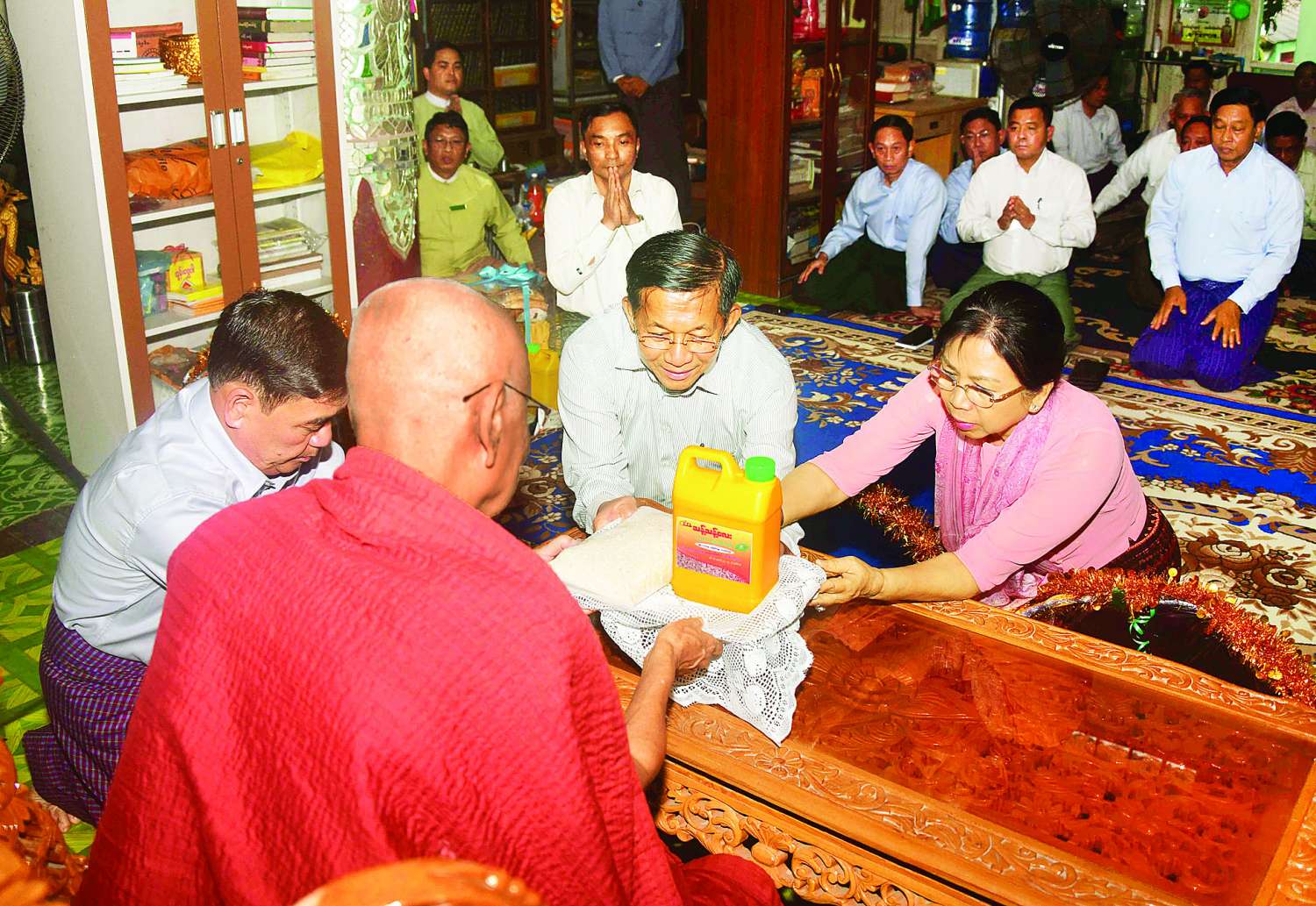 ဦးစွာ နိုင်ငံတော်စီမံအုပ်ချုပ်ရေးကောင်စီဥက္ကဋ္ဌ နိုင်ငံတော်ဝန်ကြီးချုပ်နှင့်ဇနီးတို့က နန္ဒာရာမပရိယတ္တိစာသင်တိုက် ကျောင်းထိုင်ဆရာတော်အား ဖူးမြော်ကြည်ညို၍ ဆရာတော်ကြီး၏ ကျန်းမာရေးအခြေအနေများနှင့် သာသနာရေးဆိုင်ရာများကို တင်ပြလျှောက်ထားပြီး တပ်မတော်(ကြည်း၊ ရေ၊ လေ) မိသားစုများကလှူဒါန်းသည့် ဆန်၊ ဆီနှင့် လှူဖွယ်ပစ္စည်းများ၊ နဝကမ္မအလှူငွေများကို ဆက်ကပ်လှူဒါန်းသည်။