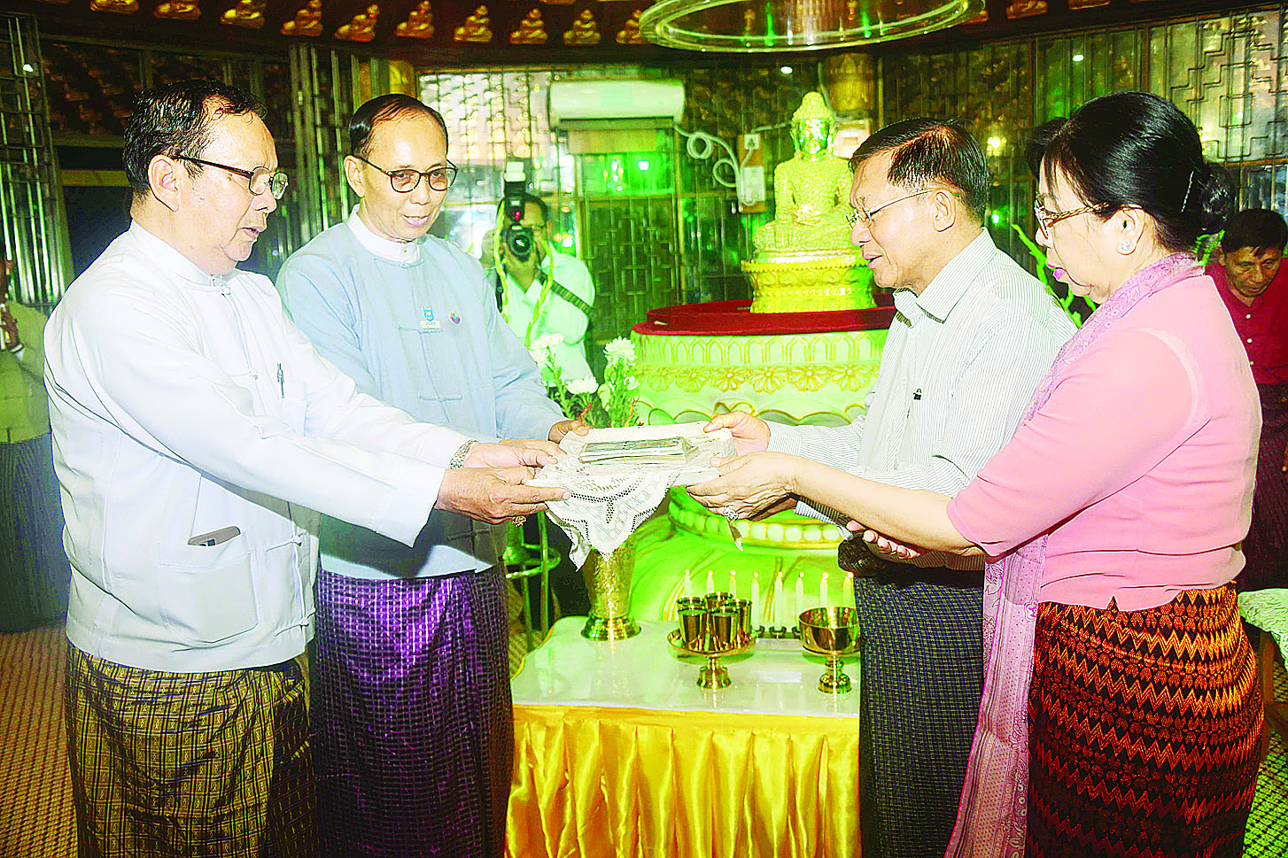 ထို့နောက် နိုင်ငံတော်စီမံအုပ်ချုပ်ရေးကောင်စီဥက္ကဋ္ဌ နိုင်ငံတော်ဝန်ကြီးချုပ်နှင့်ဇနီးတို့က စေတီတော်ကြီး ဘက်စုံပြုပြင်မွမ်းမံရန်အတွက် အလှူငွေများပေးအပ်လှူဒါန်းရာ ဂေါပကအဖွဲ့မှ တာဝန်ရှိသူများက လက်ခံရယူသည်။ ၎င်းနောက် နိုင်ငံတော်စီမံအုပ်ချုပ်ရေးကောင်စီဥက္ကဋ္ဌ နိုင်ငံတော်ဝန်ကြီးချုပ်သည် စေတီတော်ကြီးအတွင်းလှိုဏ် ပြုပြင်မွမ်းမံခြင်းလုပ်ငန်းများဆောင်ရွက်ခဲ့မှု မှတ်တမ်းဓာတ်ပုံများကို ကြည့်ရှုပြီး စေတီတော်ကြီးကို လက်ယာရစ်လှည့်လည်ဖူးမြော်ကြည်ညို၍ စေတီတော်ကြီး ရေရှည်တည်တံ့ခိုင်မြဲရေးအတွက် ထိန်းသိမ်းဆောင်ရွက်ရန်နှင့် အခြားလိုအပ်သည်များကို တာဝန်ရှိသူများအား မှာကြားသည်။