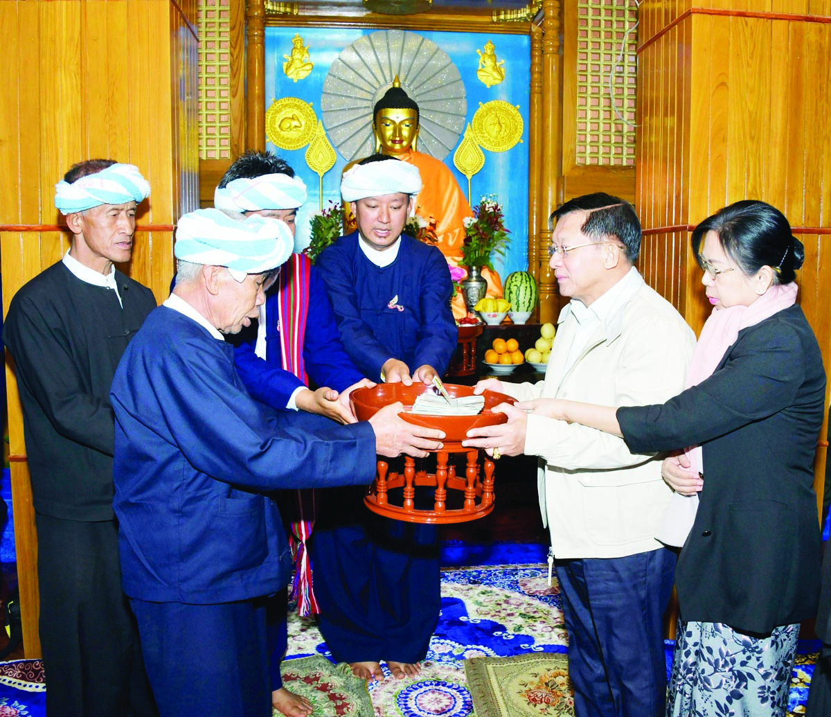ယင်းနောက် နိုင်ငံတော်စီမံအုပ်ချုပ်ရေးကောင်စီဥက္ကဋ္ဌ နိုင်ငံတော်ဝန်ကြီးချုပ်က ပအိုဝ်းအမျိုးသားအဖွဲ့ချုပ်(PNO)နာယက ဦးအောင်ခမ်းထီအား စားသောက်ဖွယ်ရာများနှင့် လက်ဆောင်ပစ္စည်းများပေးအပ်ခဲ့ရာ ဒေသထွက်လက်ဆောင်ပစ္စည်းများနှင့် ဓမ္မလက်ဆောင်များ ပြန်လည်ပေးအပ်သည်။