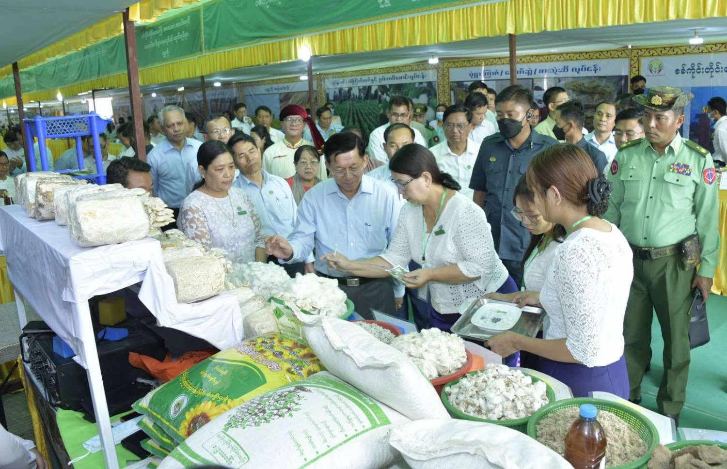 ထို့နောက် နိုင်ငံတော်စီမံအုပ်ချုပ်ရေးကောင်စီဥက္ကဋ္ဌ နိုင်ငံတော်ဝန်ကြီးချုပ်သည် ခင်းကျင်းပြသထားသည့် သယံဇာတတွင်းထွက်ထုတ်ကုန်များ၊ စားသောက်ကုန်၊ လူသုံးကုန်၊ စက်မှုလက်မှုထုတ်ကုန်၊ ရိုးရာလက်မှု ထုတ်ကုန်များ၊ အဝတ်အထည်များ၊ တိုင်းရင်းဆေးများ စသည့် ထုတ်ကုန်ပစ္စည်းများခင်းကျင်းပြသထားရှိမှုများကို ပြကွက်တစ်ခုချင်းစီအလိုက် စိတ်ဝင်တစားဖြင့်လေ့လာခဲ့ပြီး ဈေးကွက်ရရှိမှုအခြေအနေများကို မေးမြန်းဆွေးနွေးရာ လုပ်ငန်းအလိုက်စီးပွားရေးလုပ်ငန်းရှင်များက လိုက်လံရှင်းလင်းတင်ပြခဲ့ကြကြောင်း သတင်းရရှိသည်။
