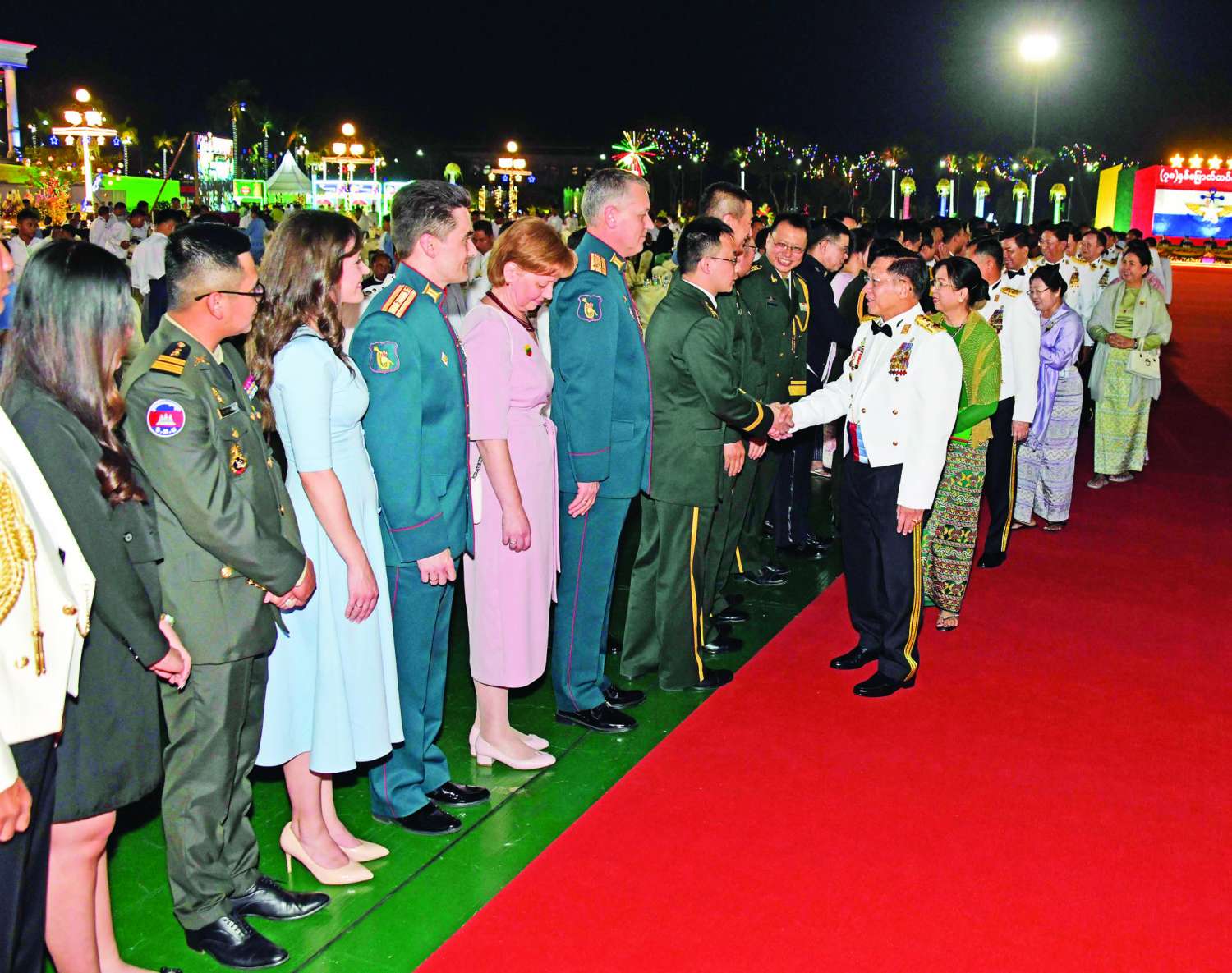 နိုင်ငံတော်စီမံအုပ်ချုပ်ရေးကောင်စီဥက္ကဋ္ဌ တပ်မတော်ကာကွယ်ရေးဦးစီးချုပ် ဗိုလ်ချုပ်မှူးကြီး မင်းအောင်လှိုင်နှင့်ဇနီး ဒေါ်ကြူကြူလှတို့က တည်ခင်းဧည့်ခံသည့် ၂၀၂၃ ခုနှစ်၊ (၇၈) နှစ်မြောက် တပ်မတော်နေ့အထိမ်းအမှတ်ဧည့်ခံပွဲနှင့် ဂုဏ်ပြုညစာစားပွဲ အခမ်းအနားကို ယနေ့ညပိုင်းတွင် နေပြည်တော်ရှိဇေယျာသီရိဗိမာန် ဥပစာရင်ပြင်၌ ကျင်းပပြုလုပ်သည်။